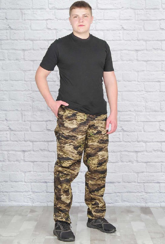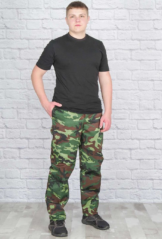 Брюки рабочие, прямого фасона из ткани грета. Пояс с гульфиком на пуговицах, сзади для удобства резинка, есть шлёвки под ремень и два боковых кармана.