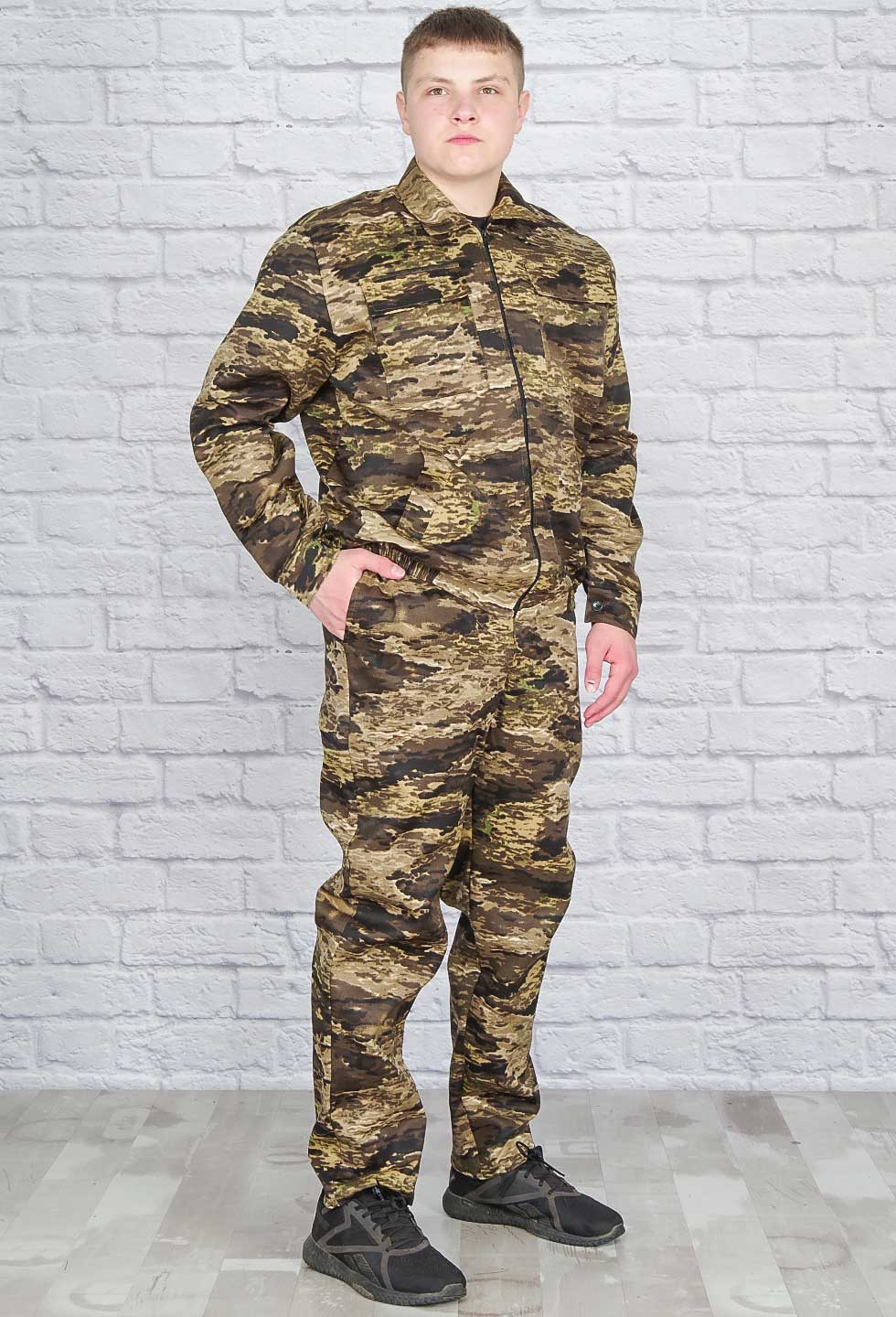 Костюм рабочий состоит из куртки и брюк. Куртка укороченная с отложным воротником, центральная застежка -  молния, удобные боковые карманы с косым входом и накладные с клапанами на липучке. Рукав втачной на манжете, низ куртки на притачном поясе по бокам стянут резинкой. Брюки прямые на притачном поясе со шлевками, сзади резинка, потайной гульфик на пуговицах, два боковых кармана. Ткань грета.
