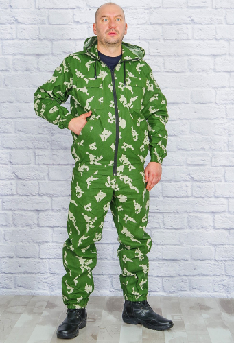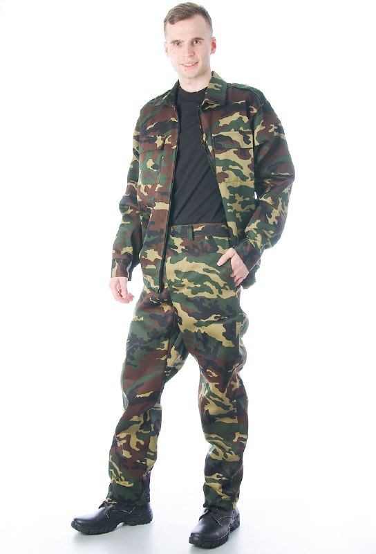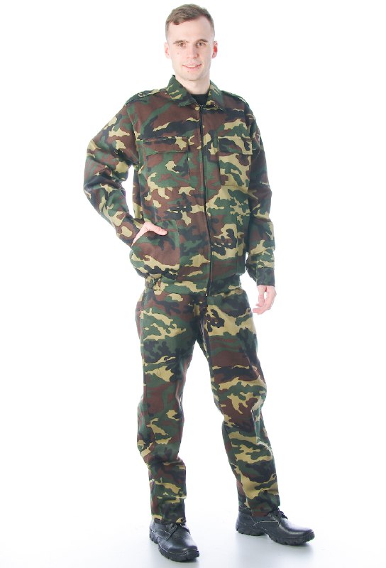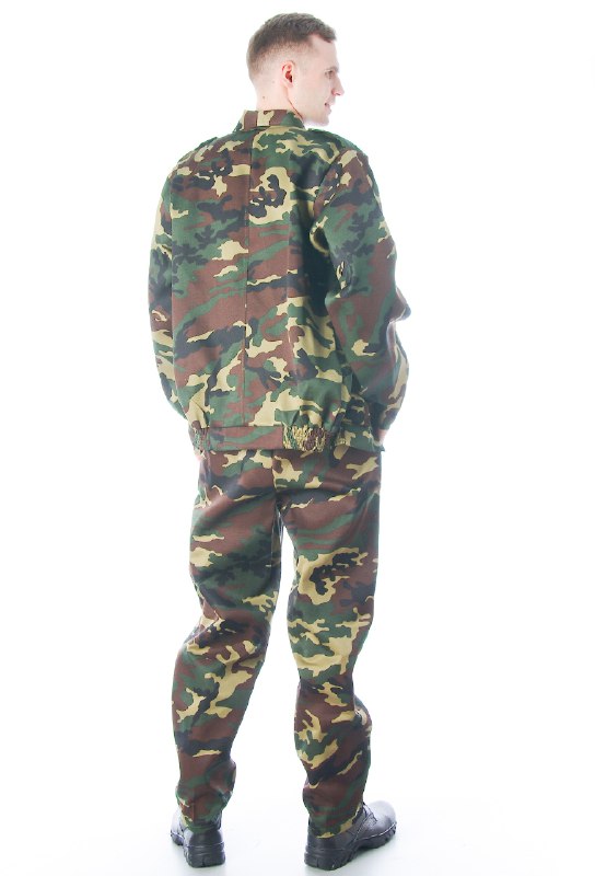 Костюм состоит из куртки и брюк. Куртка укороченная с центральной застежкой на молнии, накладные нижние и верхние карманы с клапанами, рукав втачной на манжете, низ куртки на притачном поясе по бокам стянут резинкой. Брюки прямые на притачном поясе со шлевками, сзади резинка, застежка на петли/пуговицы, два боковых кармана.