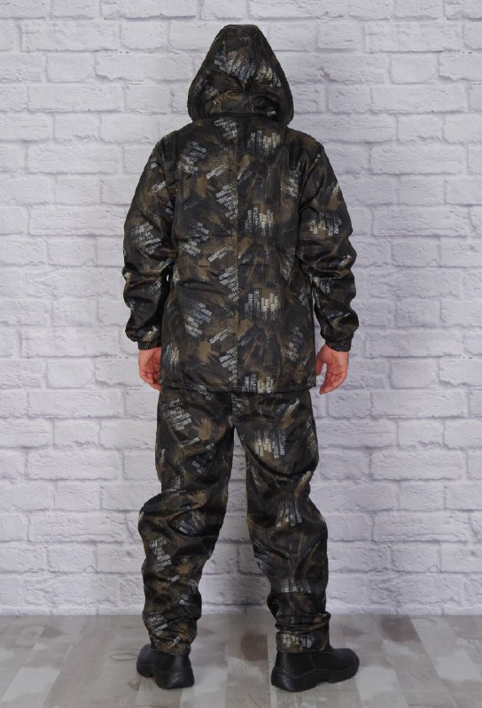 Костюм с курткой прямого кроя, на молнии с ветрозащитным клапаном и отстегивающимся капюшоном. Модель имеет верхние и нижние карманы с клапанами, воротник - стойка.
