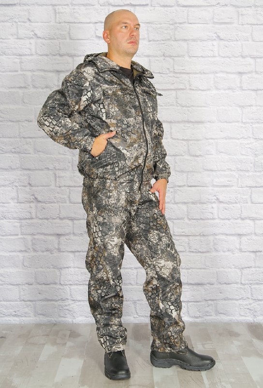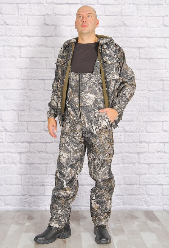 Демисезонный костюм состоит из укороченной курточки с притачным поясом, стянутым по бокам эластичной лентой и полукомбинезона. Куртка с капюшоном, центральная застежка-молния, воротник-стойка. Два верхних накладных кармана с клапаном и два нижних накладных кармана со скошенным входом.
