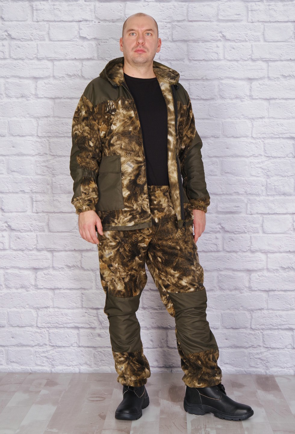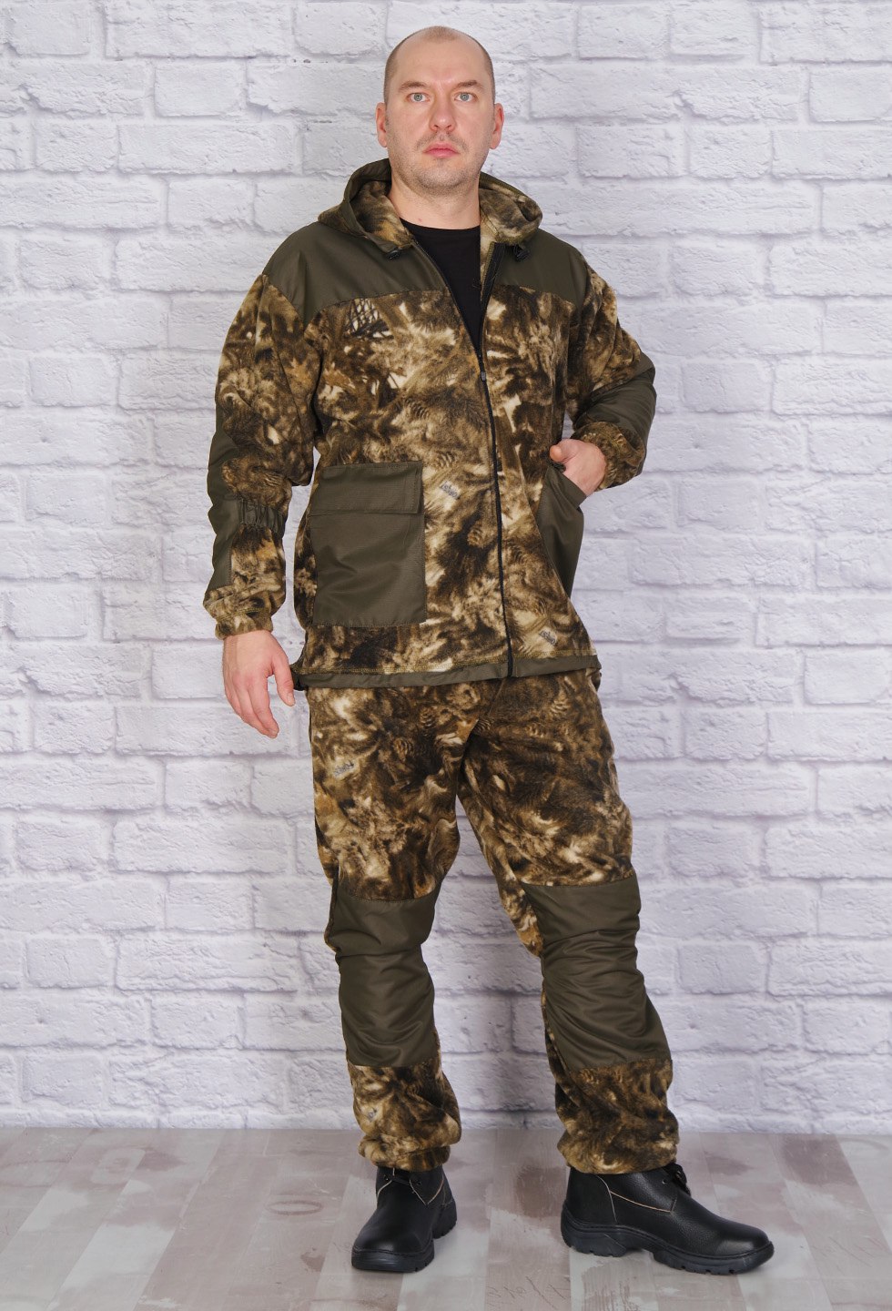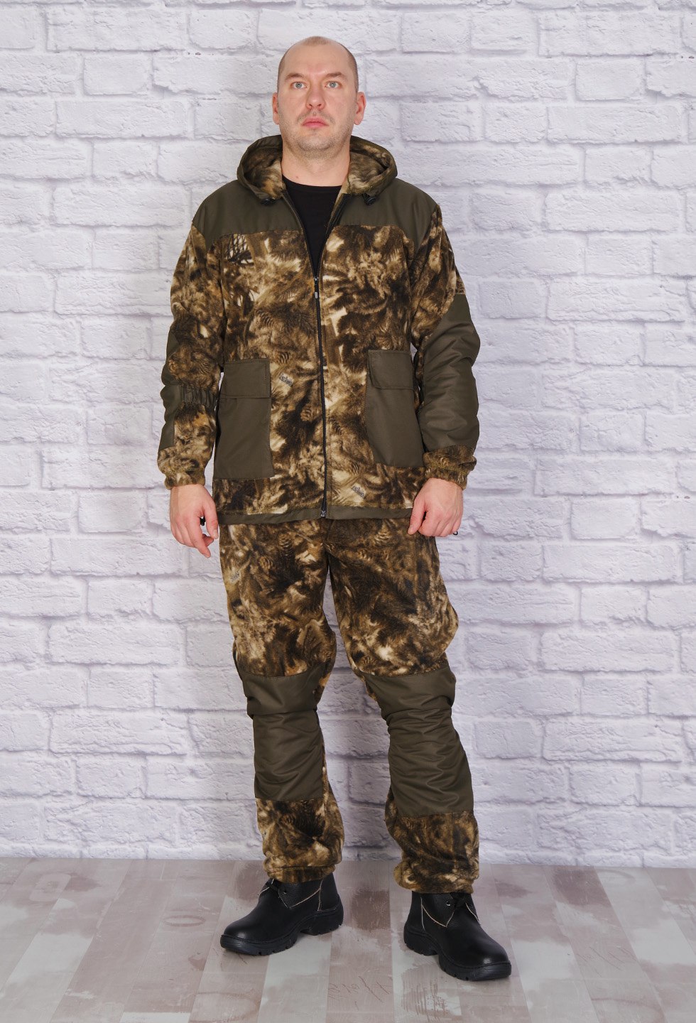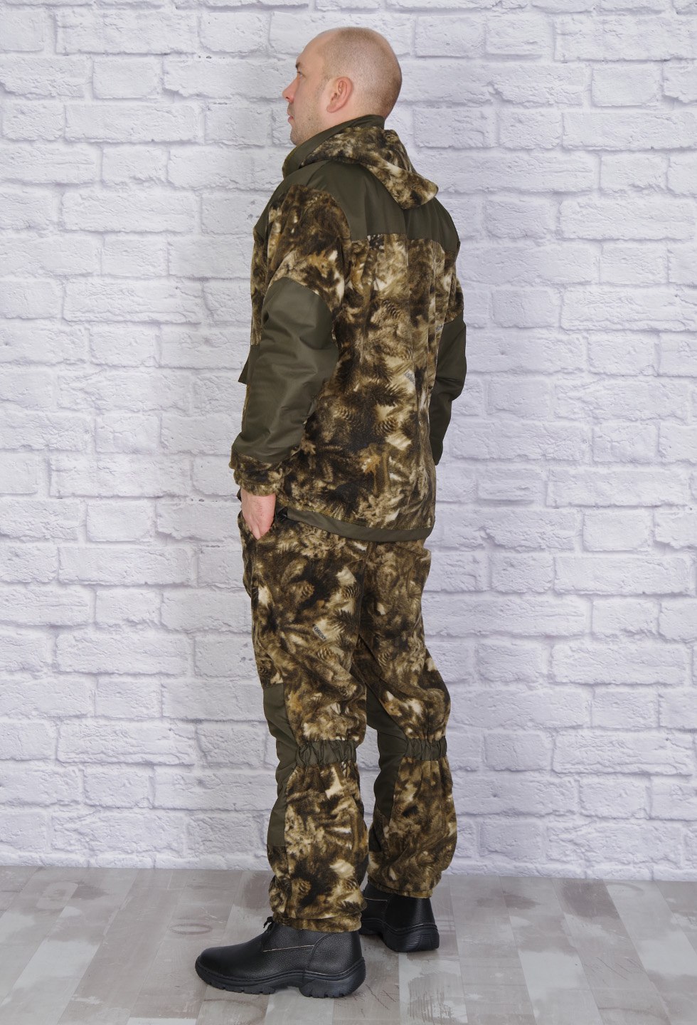 Комбинированный костюм под "Горку" подойдет охотникам, рыбакам и просто любителям активного отдыха. Куртка прямого кроя с капюшоном из флиса в комбинации с тканью-оксфорд, центральная застежка-молния. Накладные карманы с клапаном, рукава на резинке, с усиливающей фигурной накладкой в области локтя. Брюки с двумя боковыми карманами, на резинке.  В области колена на задней половине брюк находится кулиска с эластичной тесьмой, спереди усиливающая накладка из ткани оксфорд.
