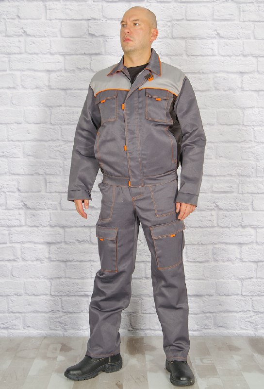 Рабочий костюм из смесовой ткани грета. Укороченная куртка на притачном поясе, по бокам на резинке. Основная застежка "молния" закрыта планкой. На куртке два боковых прорезных кармана и два нагрудных. Низ рукава с манжетом на пуговице. Полукомбинезон с регулируемыми бретелями, застежкой гульф, в левом боковом шве застежка на три пуговицы.  Лямки застёгиваются на пластиковые карабины, сзади вшита широкая резинка, благодаря этому лямки не спадают. Брючная часть прямого кроя с боковыми накладными карманами, два накладных кармана с клапаном, на верхней части нагрудный карман с двумя отделами.
