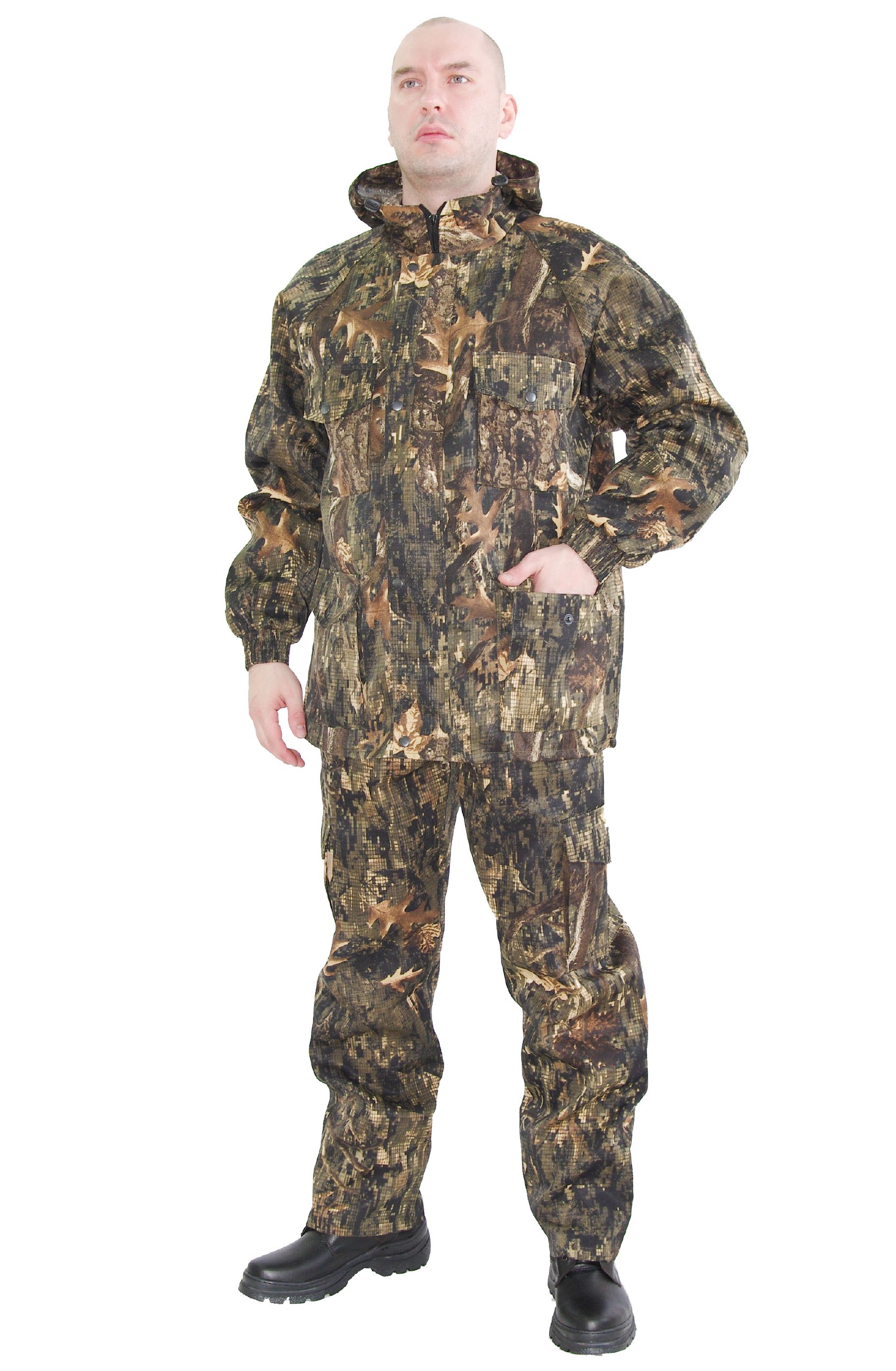 Костюм расцветки "лес" из ткани грета. Удлиненная куртка прямого фасона на молнии, с капюшоном, четыре удобных накладных кармана, рукава на манжете с резинкой. Брюки прямого фасона, пояс на резинке, боковые карманы и накладные карманы с клапаном на липучке. Ткань грета смесовая. Одна часть это натуральные нити (хлопок), а вторая — синтетическая – полиэстер. Ткань обрабатывают специальной пропиткой, имеющей водоотталкивающие свойства. Идеально подходит для спецодежды.