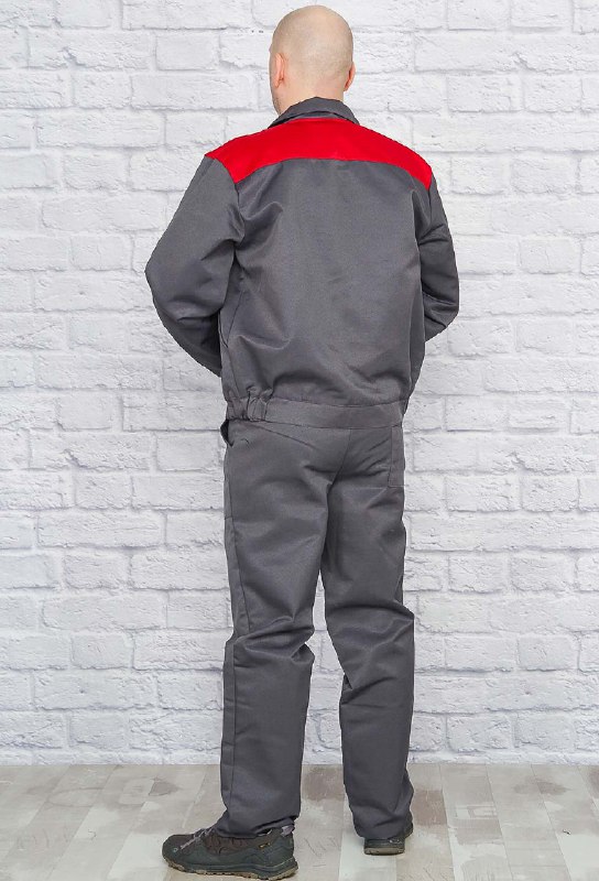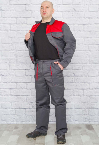 Рабочий костюм из смесовой ткани грета. Укороченная куртка на притачном поясе, по бокам на резинке. Основная застежка на пуговицах, закрыта планкой. На куртке два боковых кармана и два нагрудных с клапанами на пуговице. Низ рукава с манжетом на пуговице. Брюки прямого кроя, пояс со шлёвками, по бокам - резинка, гульфик на пуговицах, два боковых и один задний накладные карманы.