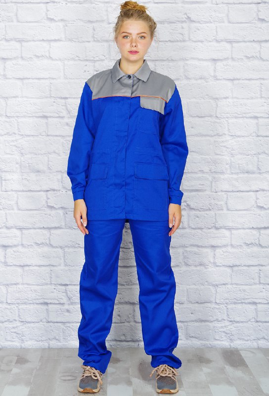 Женский рабочий костюм состоит из куртки и брюк. Куртка прямого кроя, на пуговицах, с контрастной кокеткой, внутри по линии талии кулиска, два накладных кармана по бокам и один нагрудный с клапанами, рукава на манжетах.