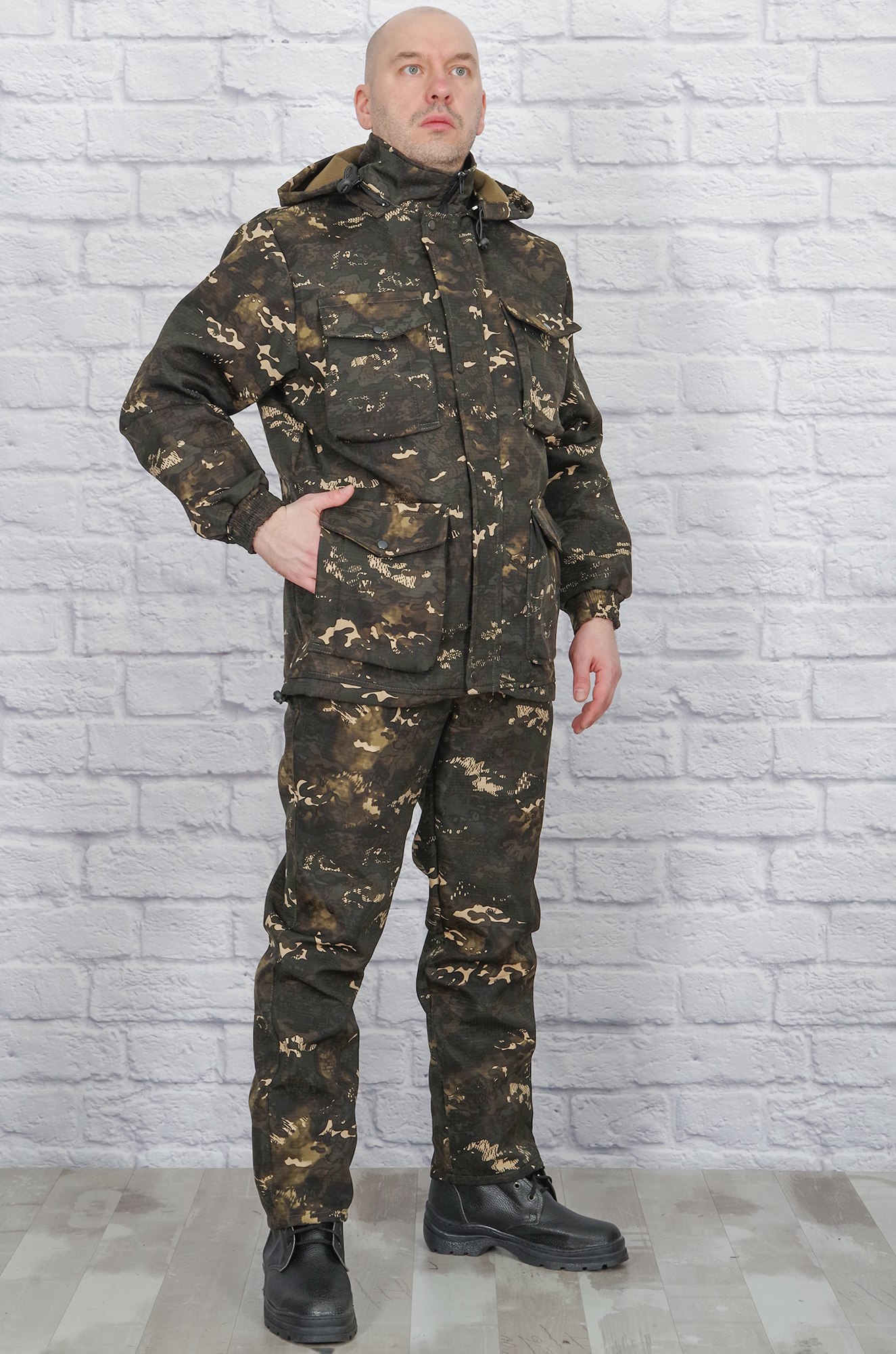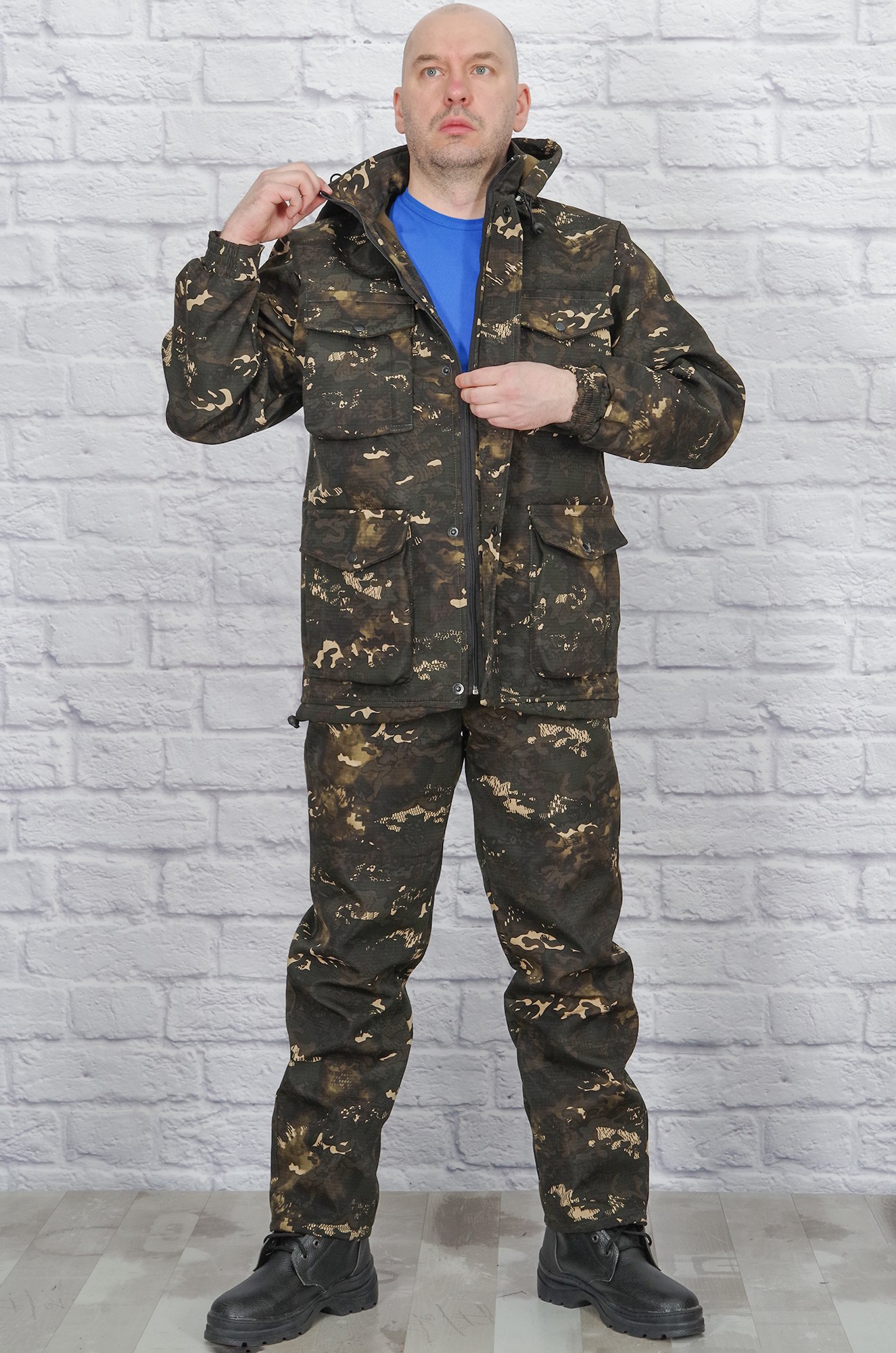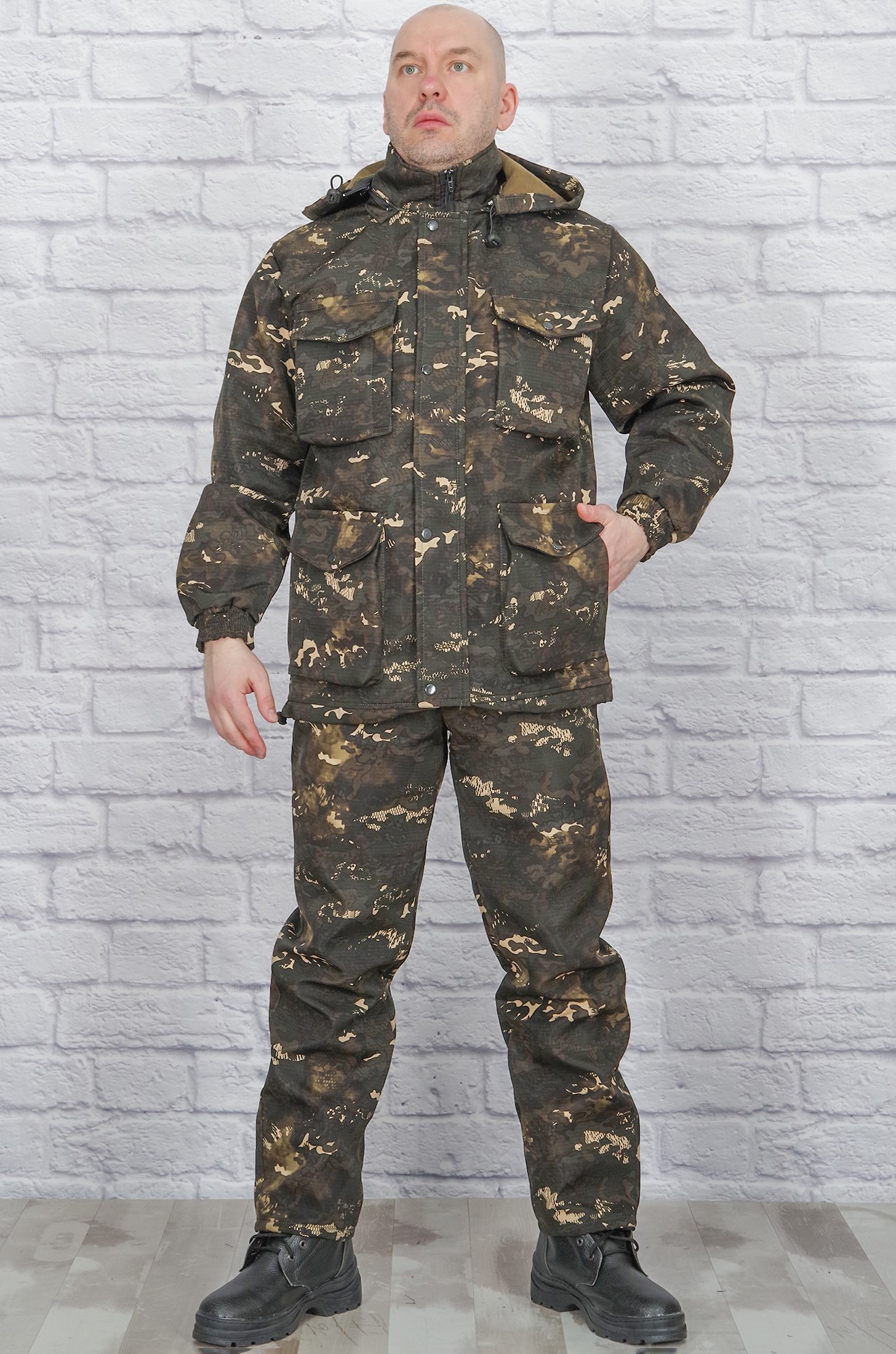Удобный демисезонный костюм для любителей активного отдыха, охоты и рыбалки из ткани рипфлис. Рипфлис - это плотное, практичное в носке синтетическое полотно рип-стоп, дублированное флисом с изнанки. Преимущество материала – хорошая теплоизоляция, защита от ветра, влаги и от температурных колебаний. Благодаря флису внутри - ткань приятная, не шуршит. Куртка прямого кроя, на молнии и с ветрозащитной планкой на кнопках, с отстёгивающимся капюшоном. Удобные накладные нагрудные и нижние карманы на молнии, рукава снизу на резинке. Полукомбинезон прямого кроя, грудная часть на молнии и при необходимости легко отстёгивается. При этом остаются брюки с гульфиком на молнии, пояс на широкой резинке, по бокам - карманы.