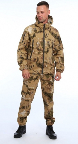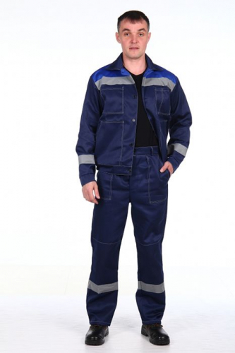 Куртка укороченная на поясе с застежкой на пуговицы. Полочки и спинка на кокетках контрастного цвета. Под кокеткой накладные карманы, левый имеет отделение под карандаш, снизу два накладных с "косым" входом, усиливающие накладки в области локтей. По кокетке в круговую а так же на рукавах настрочен СОП 5 см.Брюки с боковыми накладными карманами с "косым" входом, по низу брюк в куруговую настрочен СОП 5см. В области колен усилительные накладки.Ткань: смесовая 65% п/э, 35% х/б, пл. 210 г/м