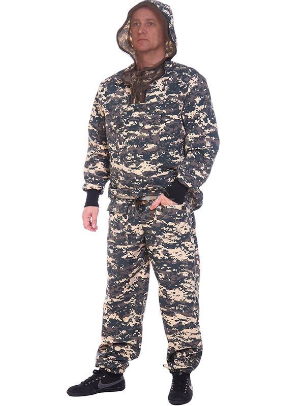 Костюм состоит из куртки и брюк. Куртка с капюшоном, с противомоскитной сеткой на молнии, убирающейся в потайной карман. Нагрудный карман с клапаном. Втачной рукав с трикотажным манжетом. Брюки прямые, с накладными карманами на передней части бедра, по низу ширина брюк регулируется эластичным тесьмой. Рекомендации по уходу: стирка при t до 40С° с применением мягких моющих средств для цветных тканей. Сушить при комнатной температуре. Не подвергать ткань отбеливанию и химчистке! Гладить можно при средних температурах подошвы утюга с изнаночной стороны.