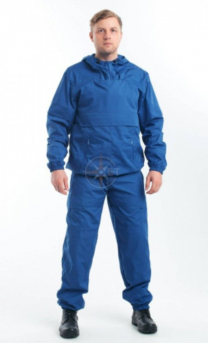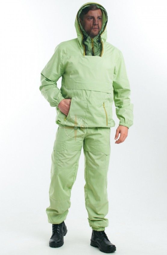 Костюм состоит из куртки и брюк. Куртка с капюшоном, с противомоскитной сеткой на молнии, убирающейся в потайной карман. Нагрудный карман с клапаном. Втачной рукав с трикотажным манжетом. Брюки прямые, с накладными карманами на передней части бедра, по низу ширина брюк регулируется эластичным тесьмой. Рекомендации по уходу: стирать костюм рекомендуется при t 30 - 40С° только в ручном режиме. Стирка производится с применением не агрессивных моющих веществ. Запрещается тереть ткань щетками чтобы не повредить слой пропитки. Выкручивать, отжимать запрещено, вода должна стечь естественным способом. Сушка – в тени.