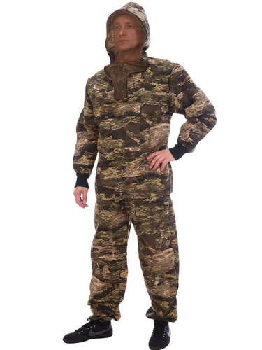 Костюм состоит из куртки и брюк. Куртка с капюшоном, с противомоскитной сеткой на молнии, убирающейся в потайной карман. Нагрудный карман с клапаном. Втачной рукав с трикотажным манжетом. Брюки прямые, с накладными карманами на передней части бедра, по низу ширина брюк регулируется эластичным тесьмой. Рекомендации по уходу: стирать костюм рекомендуется при t 30 - 40С° только в ручном режиме. Стирка производится с применением не агрессивных моющих веществ. Запрещается тереть ткань щетками чтобы не повредить слой пропитки. Выкручивать, отжимать запрещено, вода должна стечь естественным способом. Сушка – в тени.