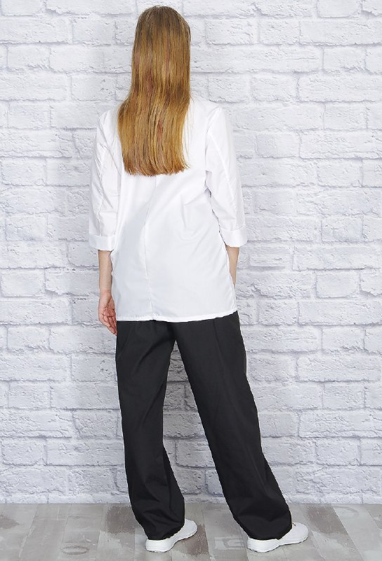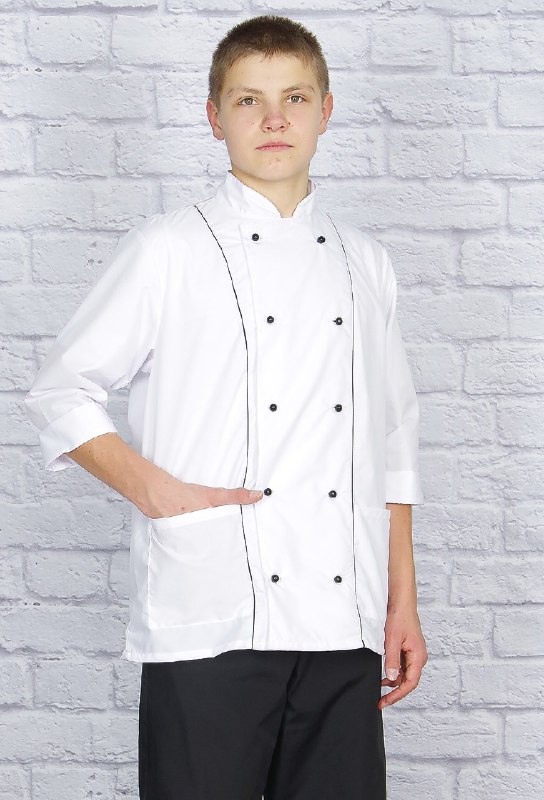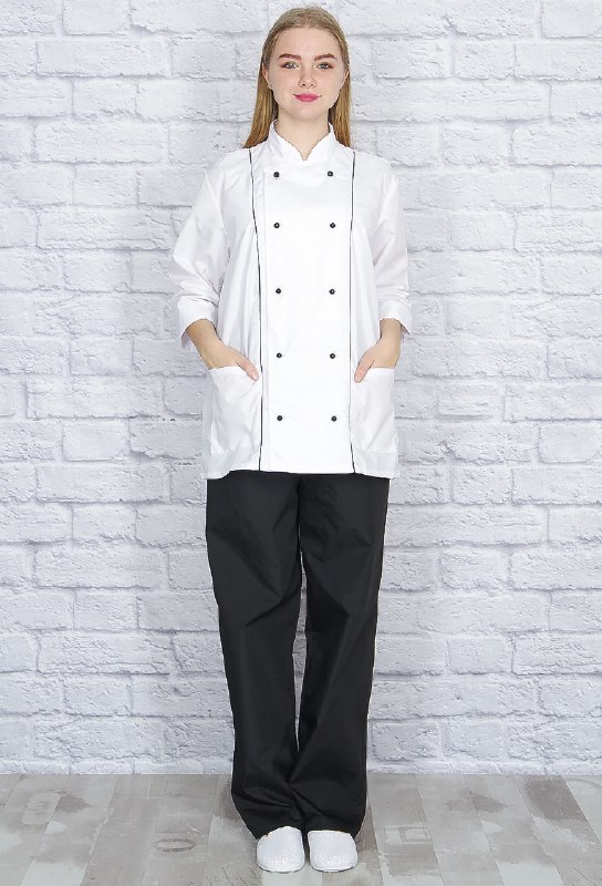 Китель двубортный, на специальных надёжных "поварских" застёжках - пуклях, которые легко расстегнуть при необходимости, глубокие карманы, воротник-стойка, рукав - 3/4.