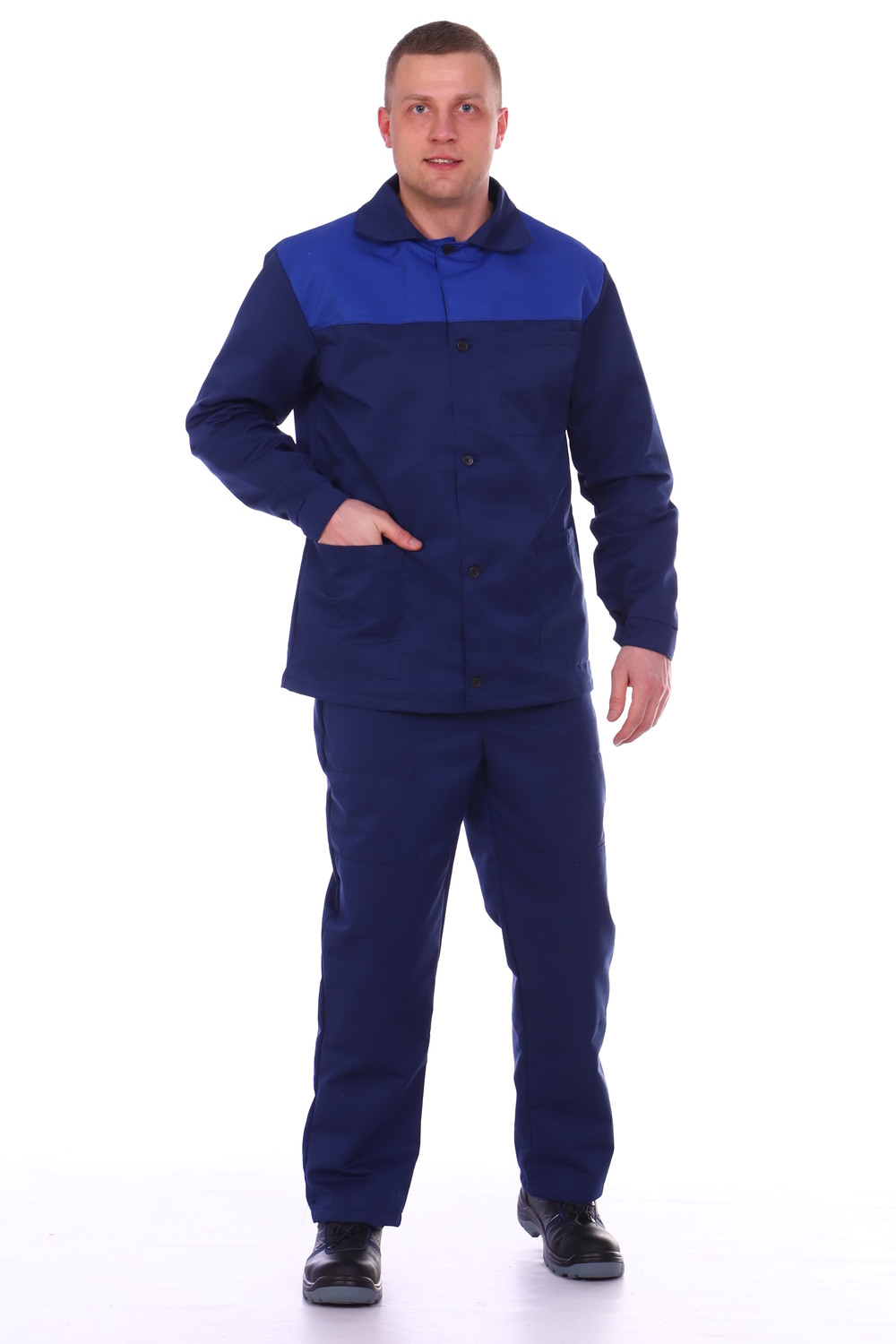 Cпецодежда высокого качества и удобства. Бренд СКЕЛА предлагает костюм рабочий мужской, изготовленный из смесовой ткани грета российского производства с содержанием: 47% натуральный хлопок и 53% полиэстер. Повышенное содержание хлопка в ткани позволит вашему телу дышать, т.е. придаст комфорт в работе. Униформа с длинным рукавом и широкими манжетами, состоит из куртки свободного кроя и брюк, обеспечивающих свободу движения. Куртка с отложным воротником и центральной застежкой на пуговицы и петли. Брюки просторные и удобные с дополнительным усилением на коленях. В пояс брюк мужских вшиты шлевки под рабочий ремень. Имеются боковые накладные карманы с наклонным входом. Спецовка мужская представлена в практичном темно-синем цвете. Прекрасно подойдет для любых видов работ на производстве, в автосервисе, в строительстве, дома или на даче. Идеальная спецодежда рабочая для хозяйственных работ. Представлен широкий размерный ряд, включающий большие размеры, что обеспечит Вам свободу выбора под любое телосложение. Костюм универсальный очень практичен - прослужит долго и надежно! Цвет: темно-синий+василек; Материал: грета;грета; Состав: 47% хлопок, 53% п/э.