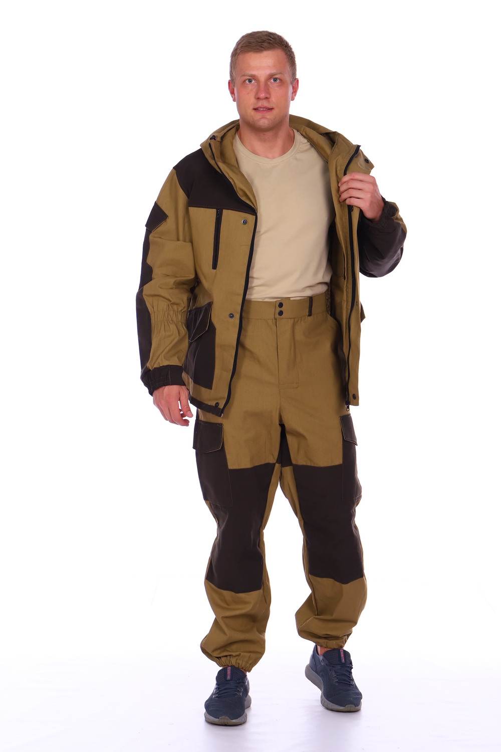 Костюм горка от бренда СКЕЛА - выбор настоящих мужчин! Летняя горка костюм мужской состоит из куртки и брюк. Куртка свободного кроя, застёгивается на молнию, которая скрыта планкой на кнопках. Рукава штормовки длинные, с широкими манжетами на резинке. Высокая горловина и капюшон отлично защитят от ветра. Мужской костюм горка имеет два типа карманов: нагрудные прорезные на молнии и накладные на кнопках. Также имеются карманы на рукавах, застегивающиеся клапанами на кнопке. Брюки форма горка свободного покроя с застежкой-молнией и поясом на кнопках. В пояс, на голенище и в области щиколотки вшиты резинки, которые не позволяют задувать холодному ветру. Усилительные накладки костюма предотвращают истирание в проблемных местах. В наличии цвет хаки, накладки темно-коричневые, что делает изделие отличной камуфляжной одеждой. Костюмная ткань палатка плотностью 240 гр/м2, из которой изготовлена тактическая одежда, на 100% состоит из натурального хлопка. Усилительные накладки из смесовой ткани плотностью 215 гр/м2 с содержанием полиэстера 65% значительно увеличивают срок службы костюма. Костюм горка летний отлично подойдёт как одежда для похода в горы, а также для охоты, рыбалки, туризма и в качестве рабочей одежды. Размерная сетка модели включает в себя большие размеры. Цвет: хаки; Материал: смесовая ткань;палаточное полотно;палаточное полотно;смесовая ткань; Состав: хлопок 100%.