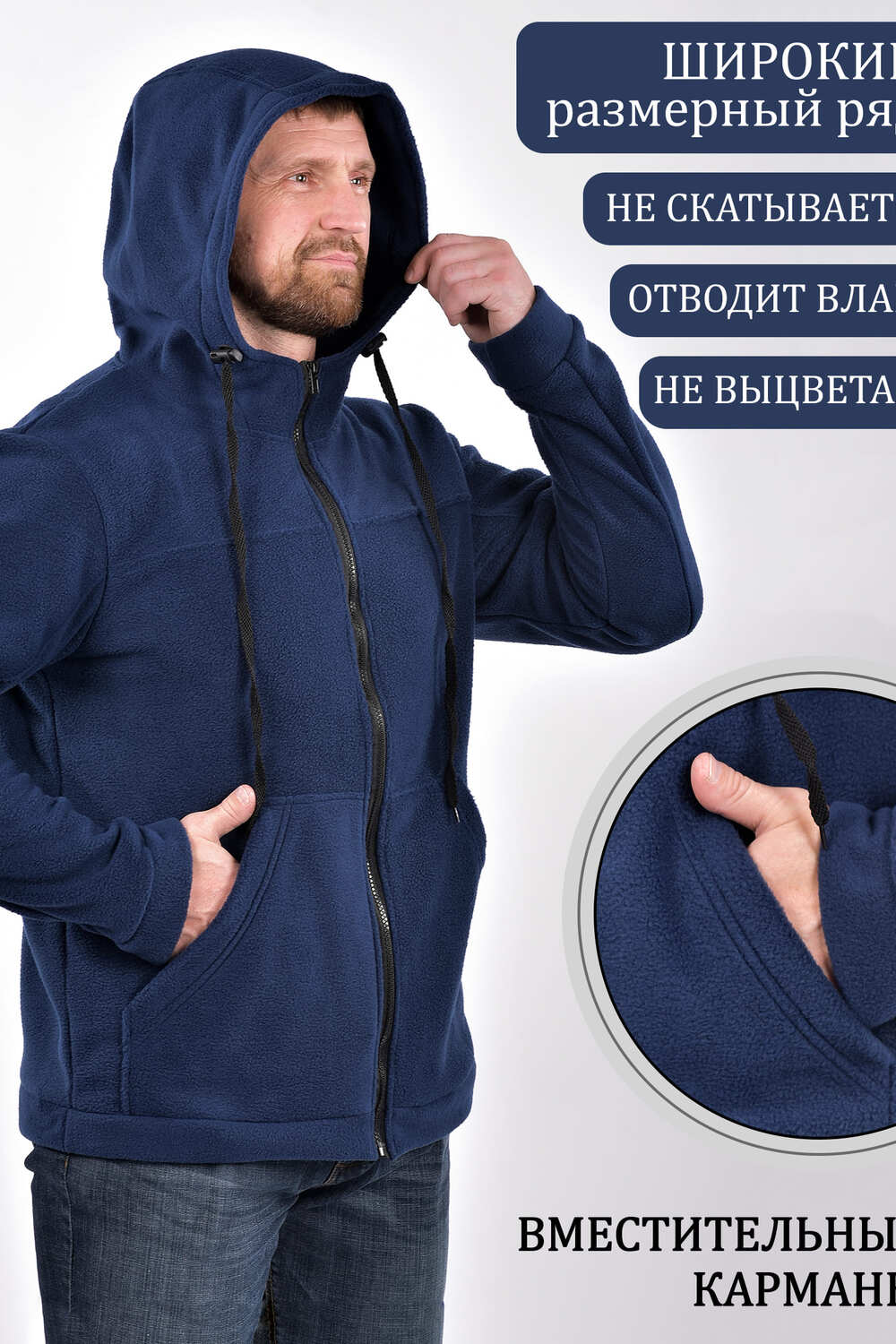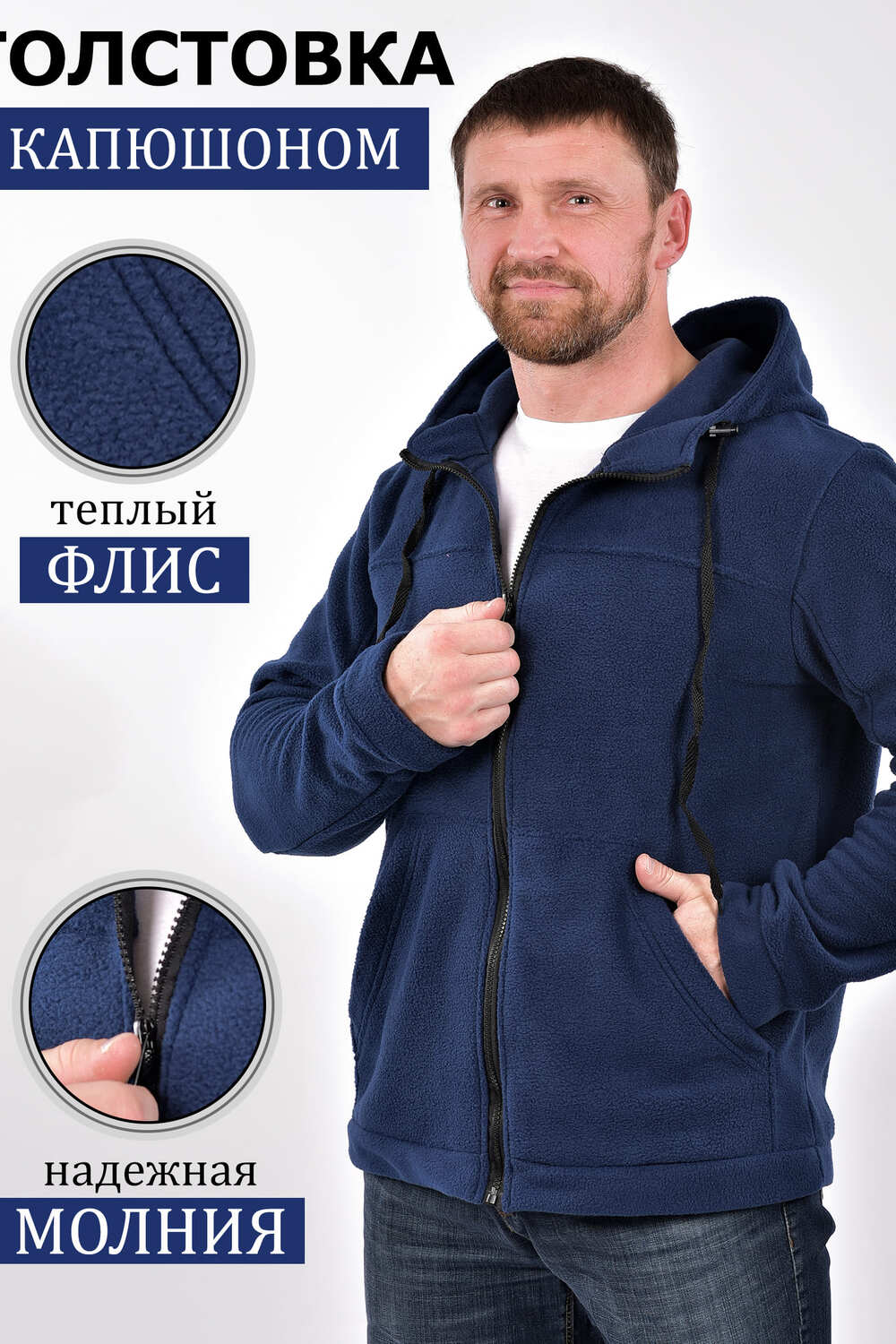 Толстовка прямого силуэта, с центральной бортовой застёжкой на молнию, с притачным поясом. Карманы накладные с наклонной линией входа, рукава втачные на манжетах, капюшон на кулисе. Подходит для охоты рыбалки, активного отдыха и туризма. Комфортная мягкая ткань, удобная посадка. Антипиллинговая обработка обеспечивает повышенную износостойкость, имеет усиленные теплоизоляционные свойства, ткань не покрывается катышками долгое время. Цвет: синий;серый; Материал: флис;флис; Состав: 100% пэ.