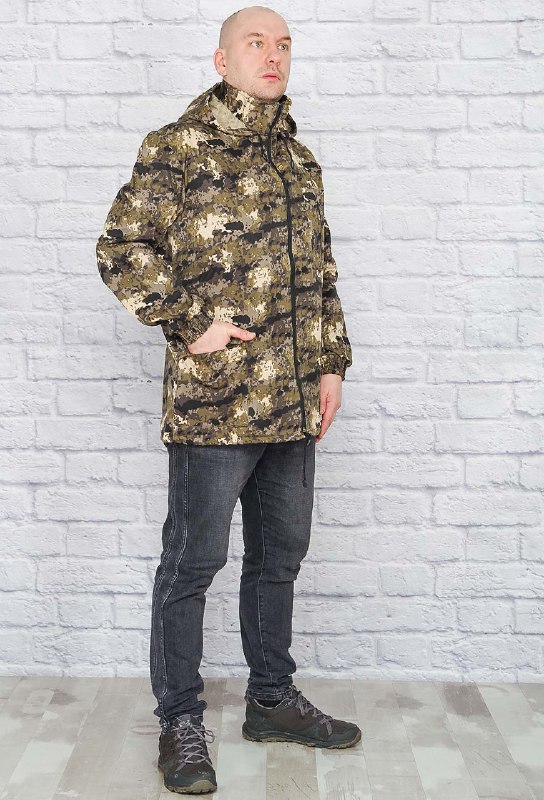 Куртка облегчённая, без подкладки. Модель удлиненная, прямого кроя, центральная застежка-молния, по низу - кулиска. Удобный воротник - стойка и капюшон, вшитый в горловину. Рукава снизу на широкой резинке. На полочке накладной карман на молнии и два накладных кармана с клапаном. Для любителей охоты, рыбалки и активного отдыха - отличный вариант!