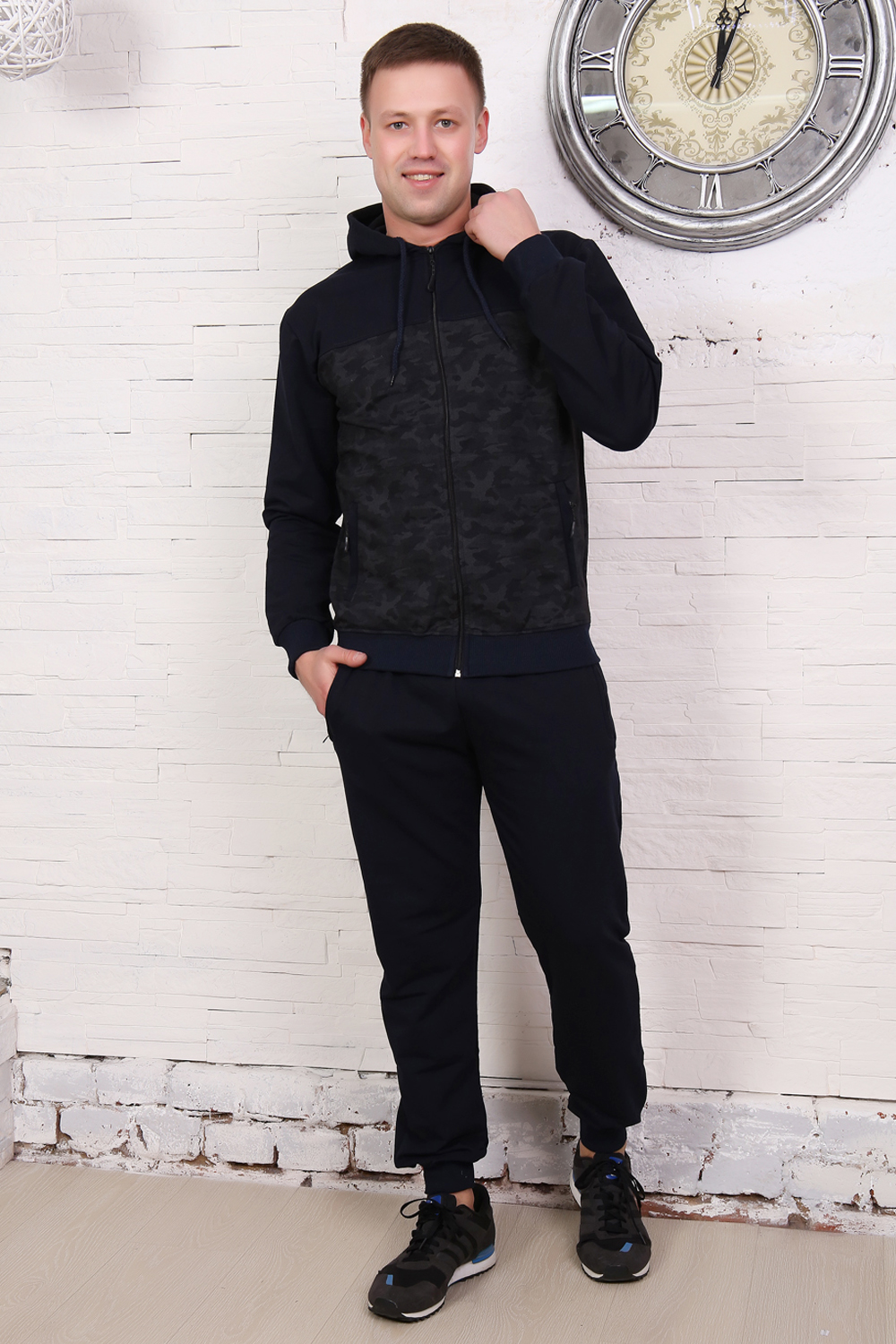 Костюм мужской состоит из толстовки с двойным капюшоном на молнии и брюк. Карманы на молнии, выполнен из двух фактурных тканей.