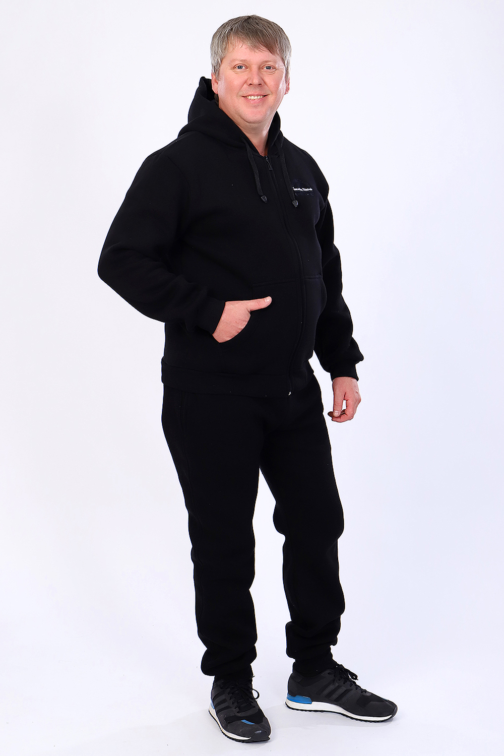 Теплый мужской костюм толстовка + брюки. Толстовка с капюшоном, застегивается на молнию, на животе карманы, рукава и низ отделаны манжетами. Брюки с карманами, внизу манжеты. Несколько вариантов расцветки. Размеры от 46 до 58.