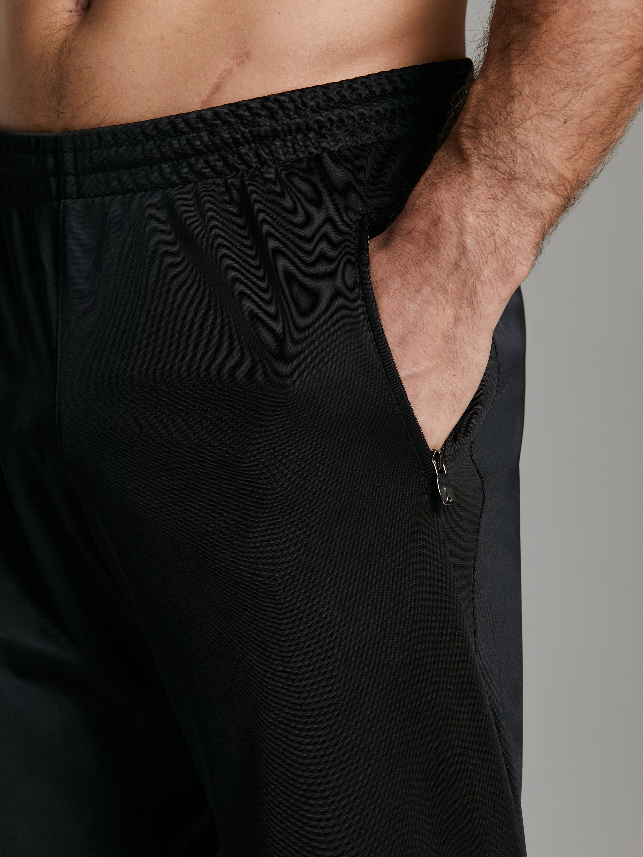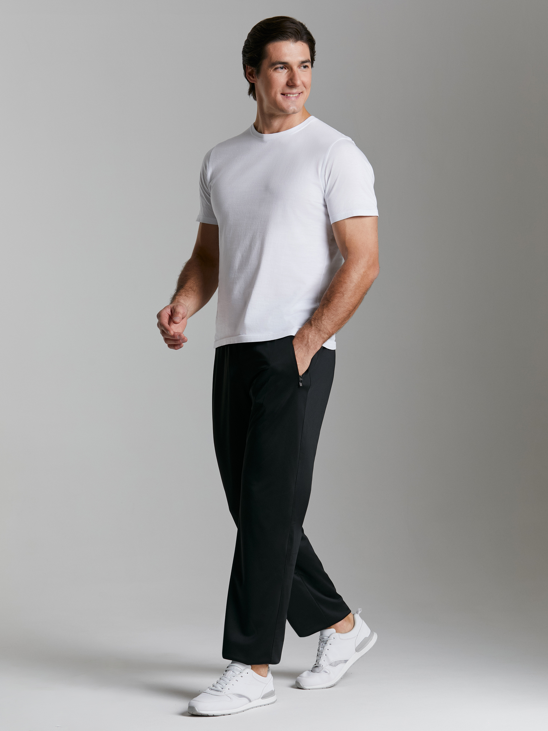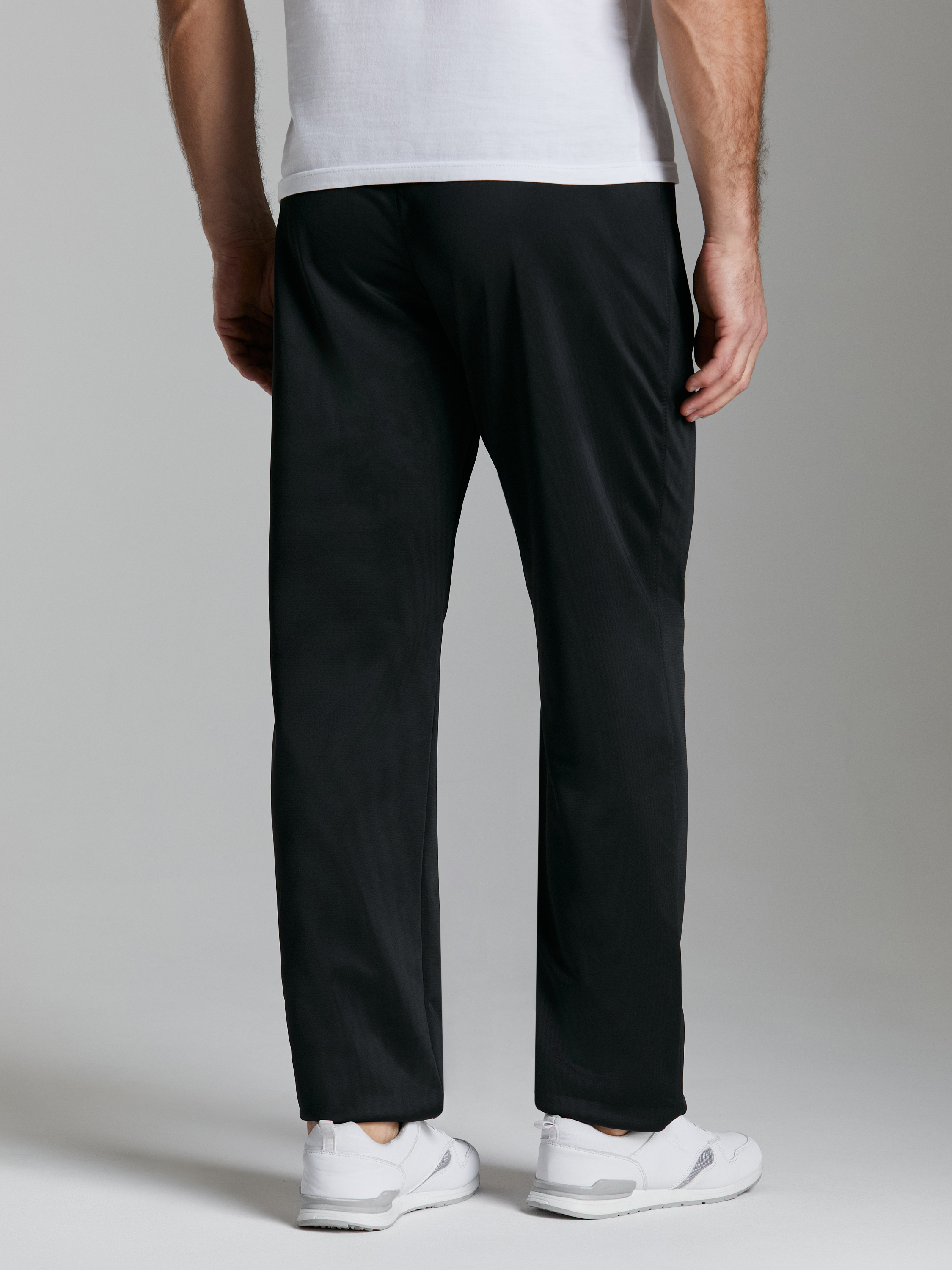 Брюки мужские из полиэстеровой ткани с изнаночным начесом. С цельнокроеным поясом. Карманы в рамку на молнии. Пояс по талии регулируется шнурком. На передней половинке выполнена вышивка фирменного логотипа. 100% полиэстер