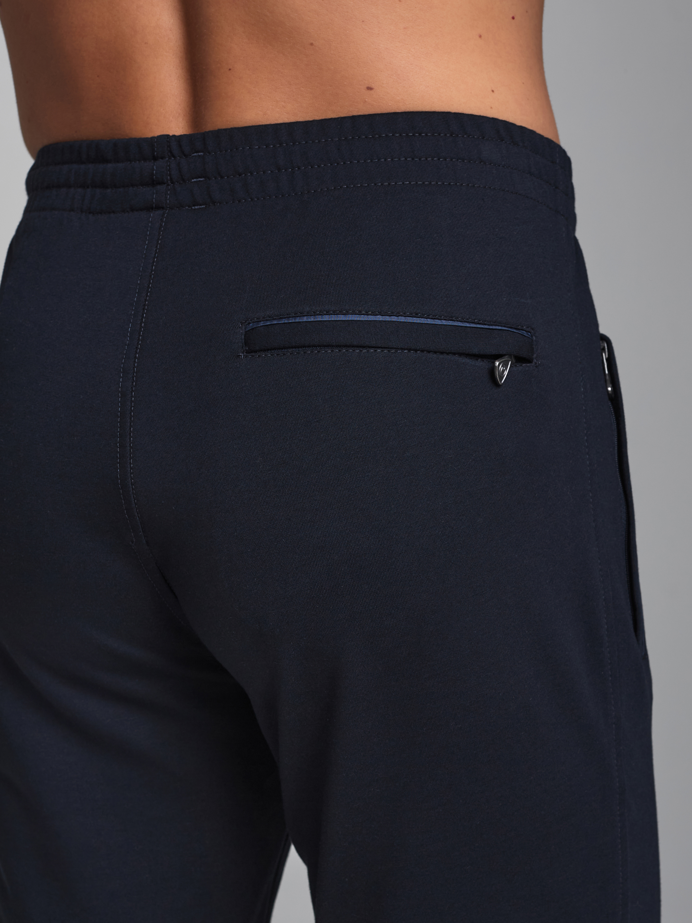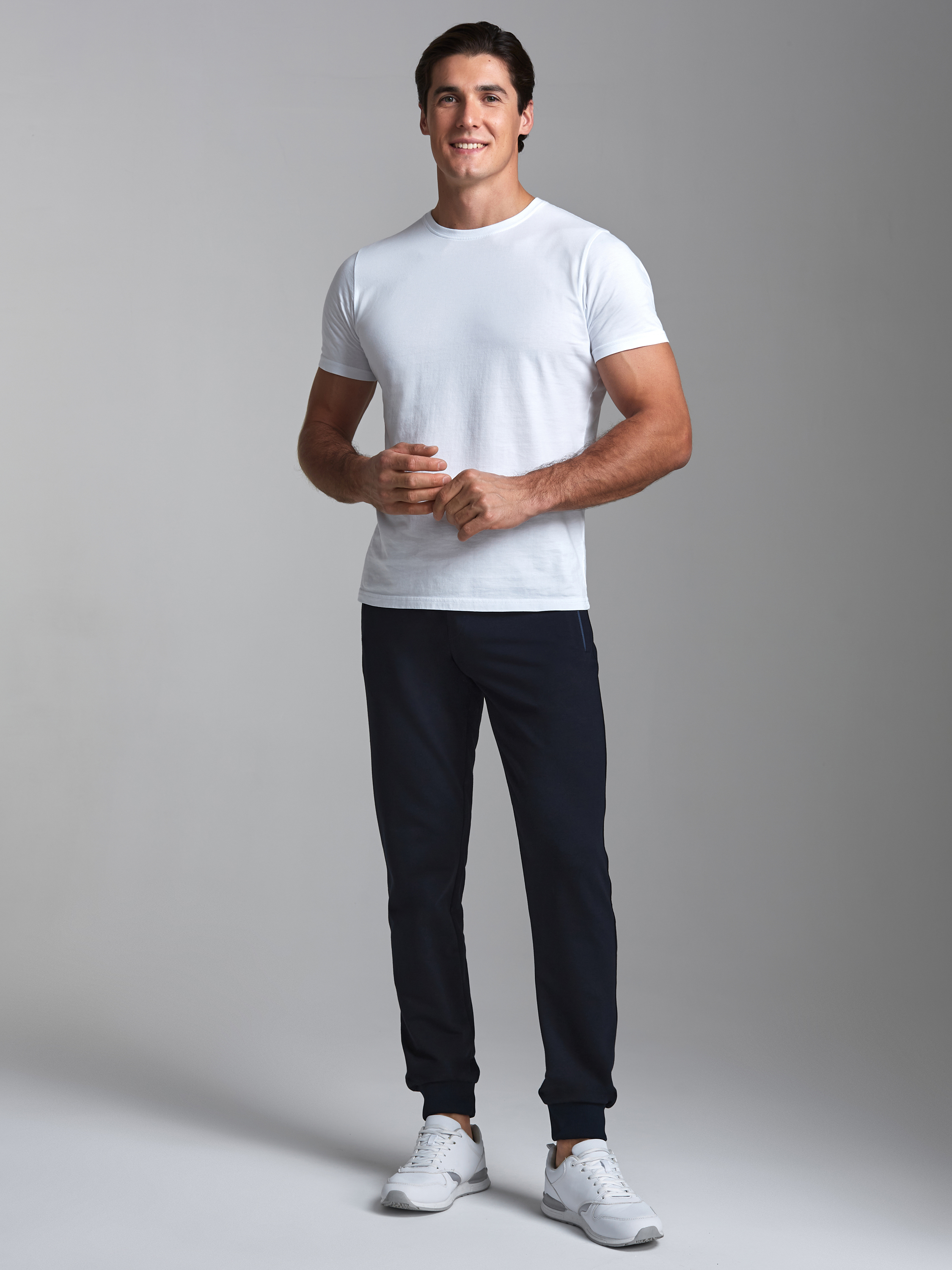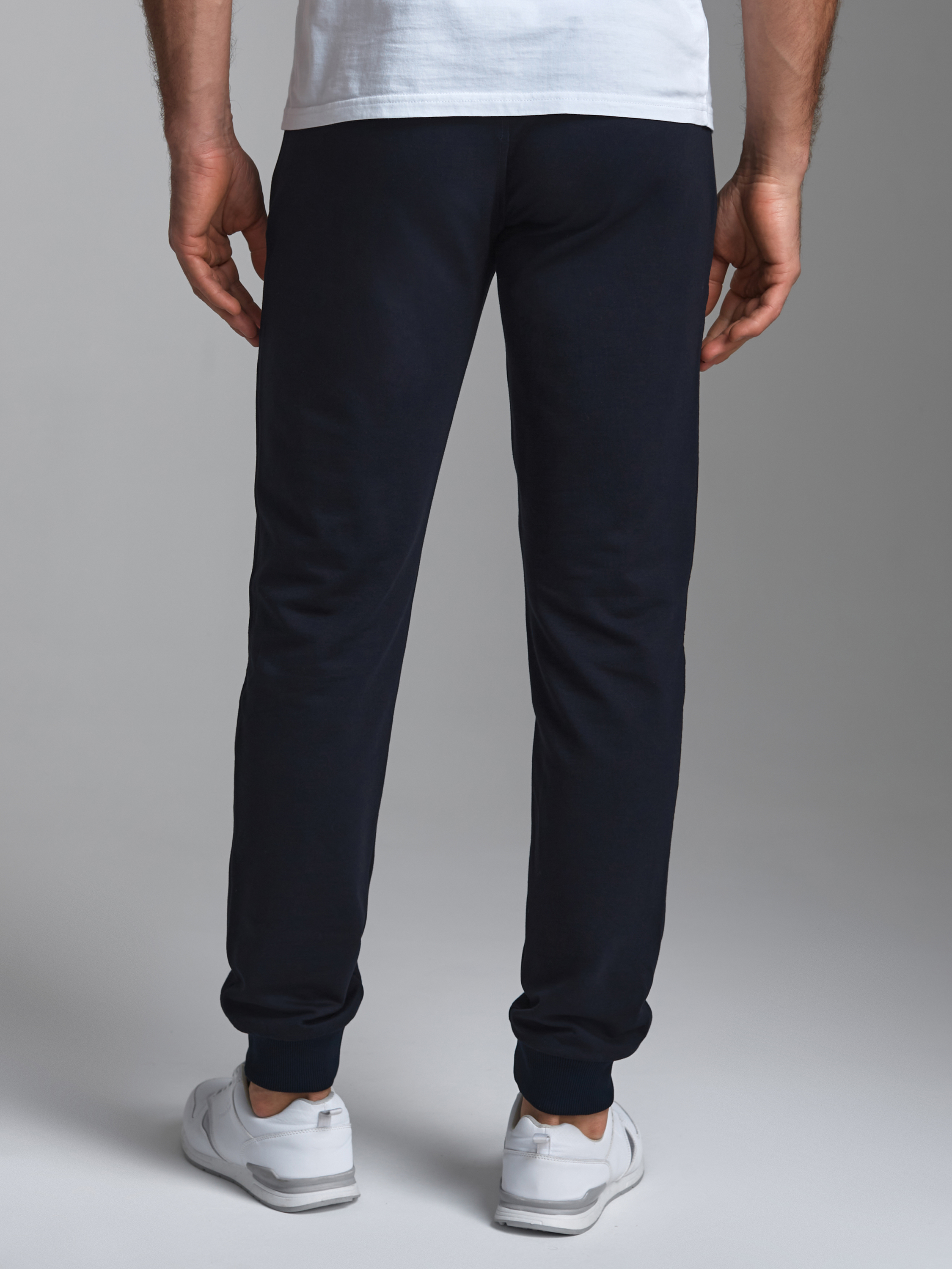 Брюки мужские из хлопкового трикотажа, брючины зауженные книзу, на манжете. Передние карманы прорезные, на молниях, с листочками. Справа есть дополнителный задний карман, так же застегивается на молнию. Ширина пояса брюк регулируется шнуром. 77% хлопок, 17% полиэстер, 6% эластан