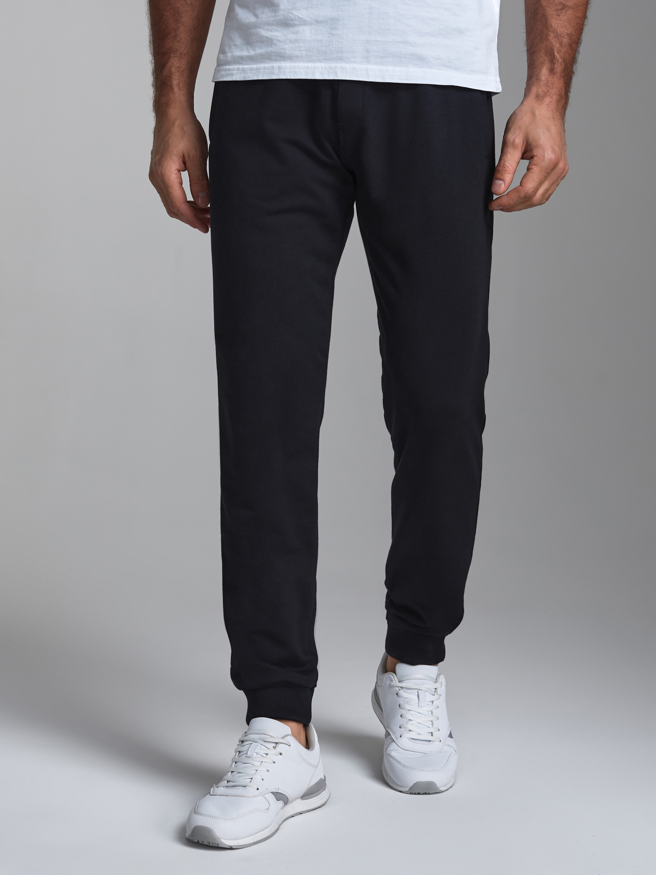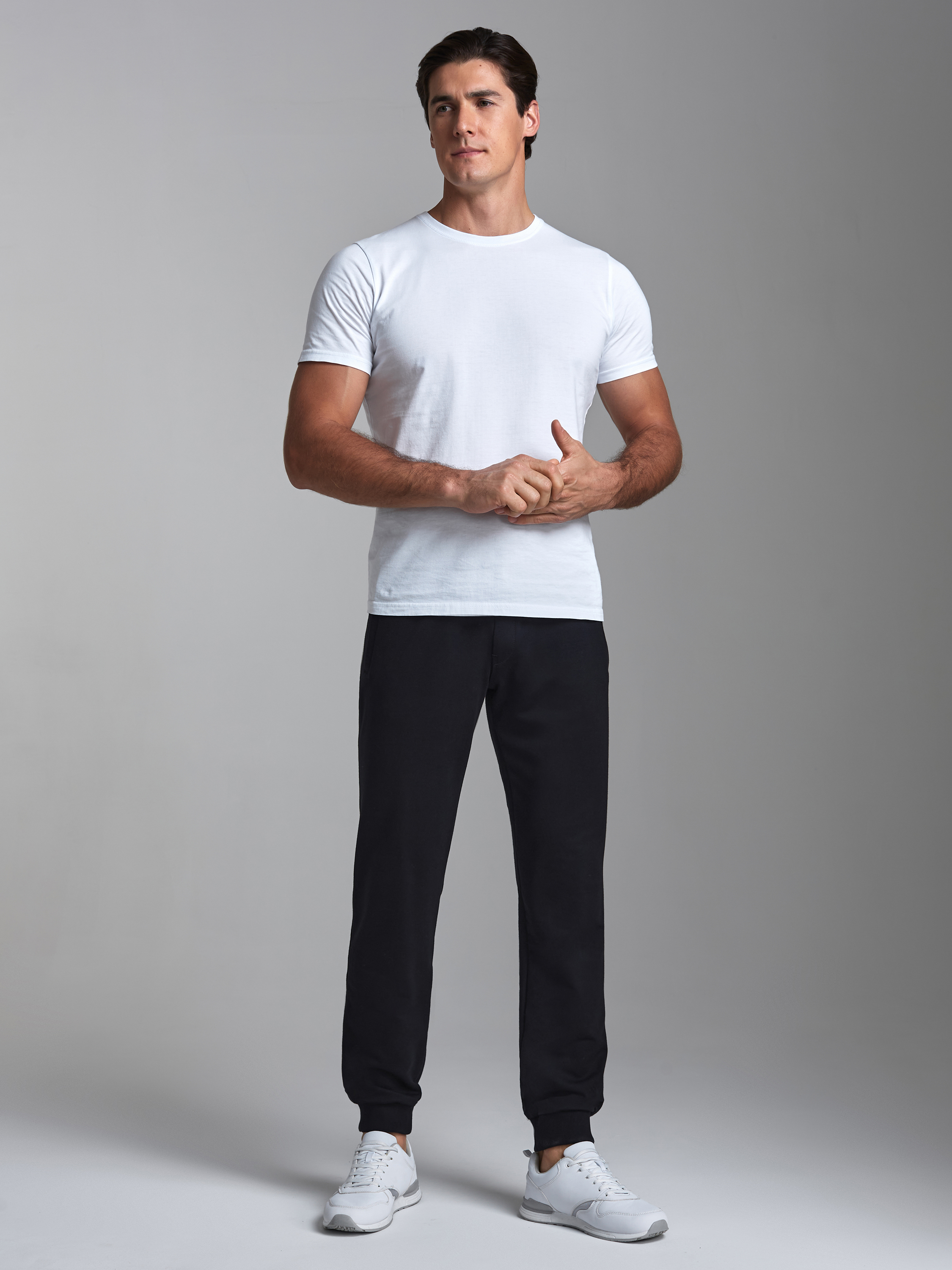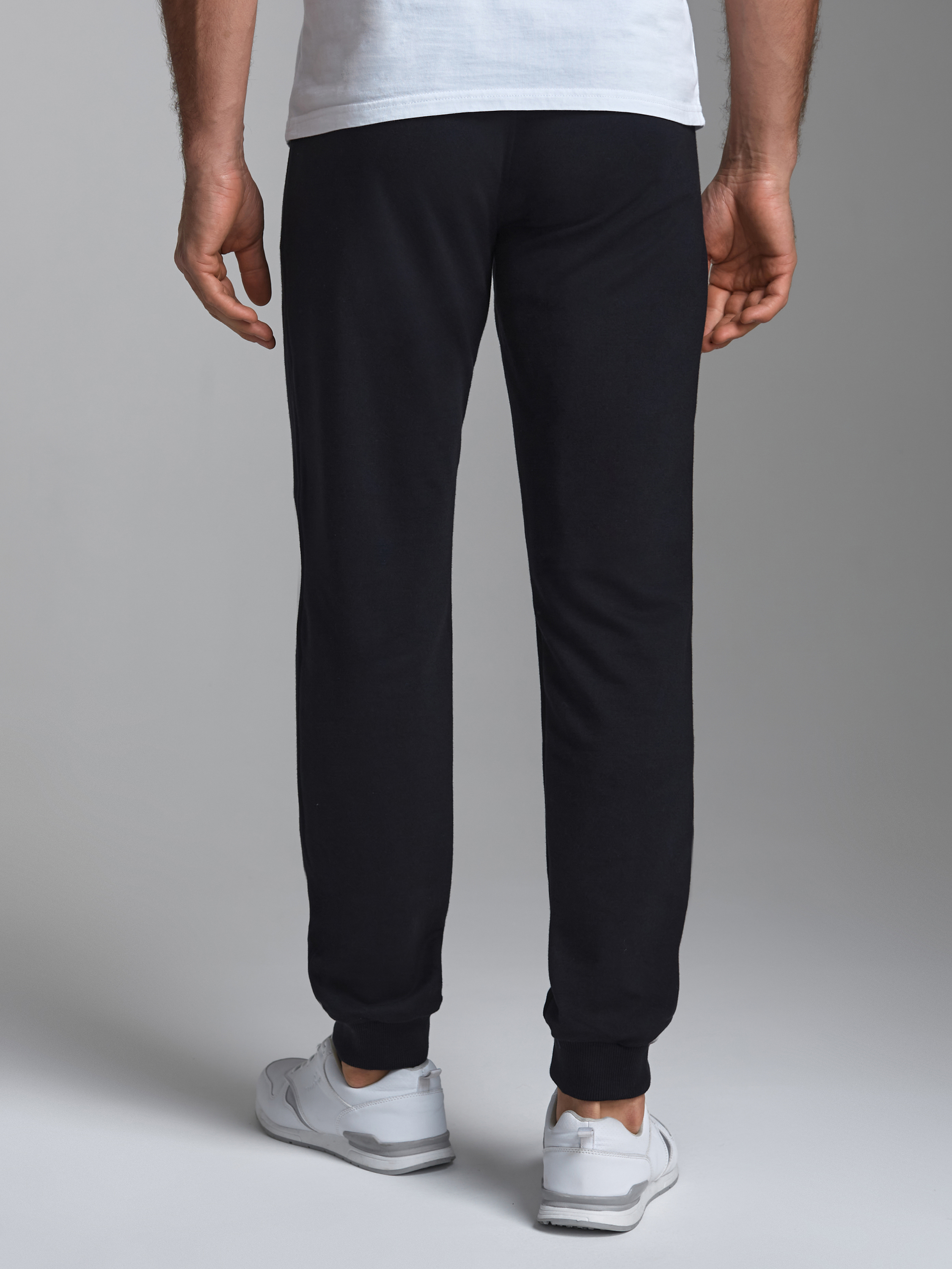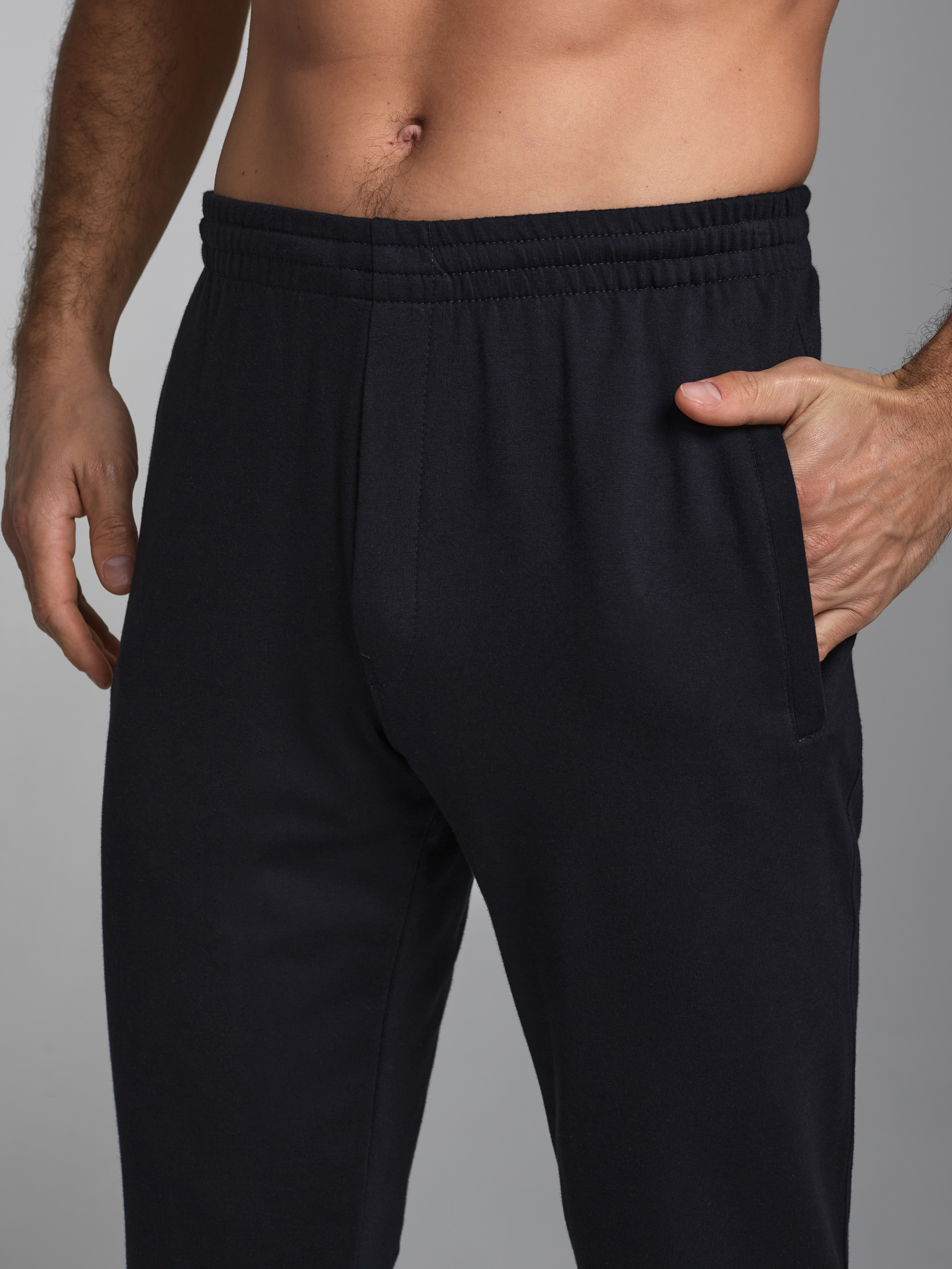 Брюки мужские из хлопкового трикотажного полотна на манжетах из рибаны. Карманы прорезные с листочками на молниях. Пояс по талии регулируется шнуром. 77% хлопок, 17% полиэстер, 6% эластан