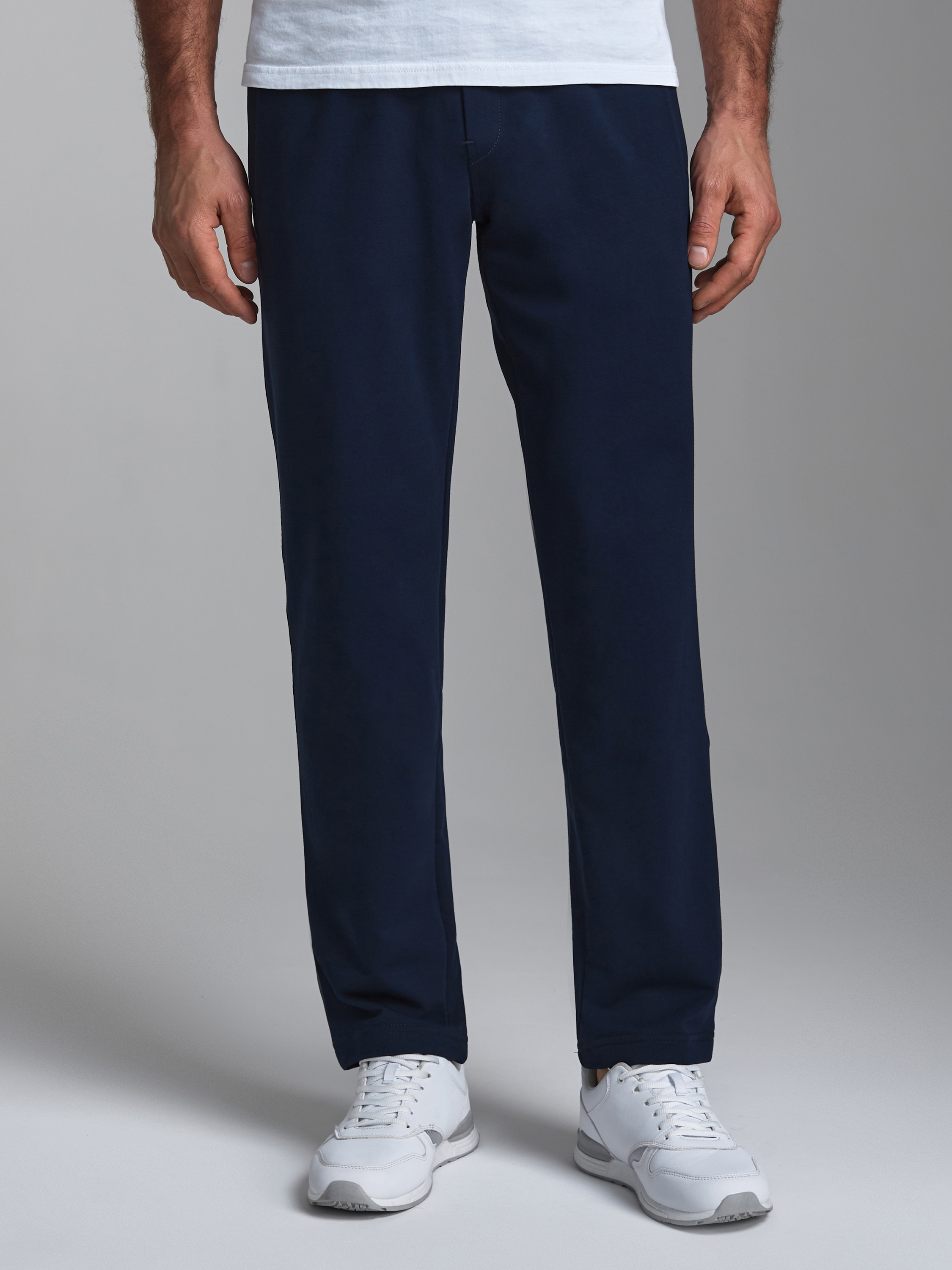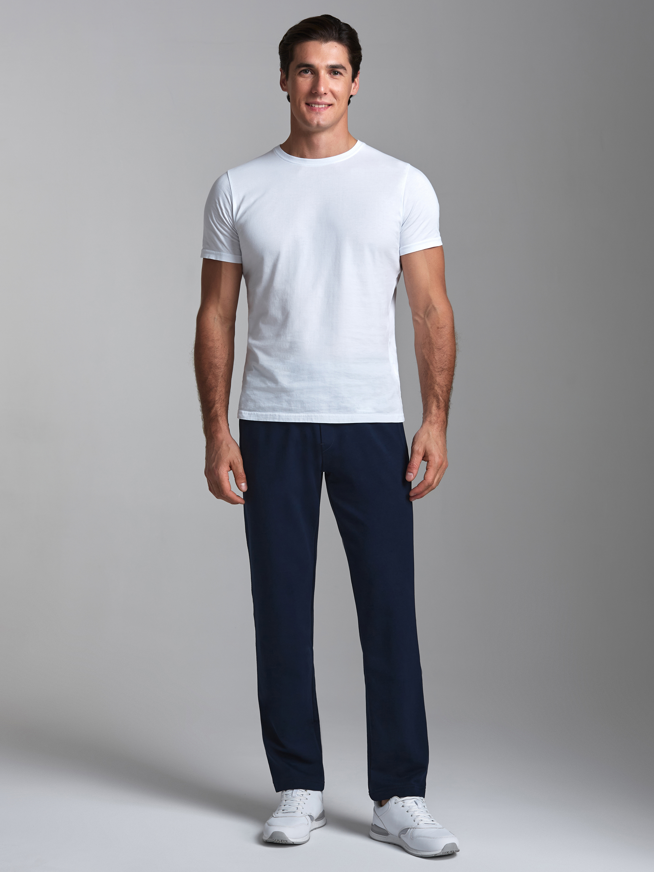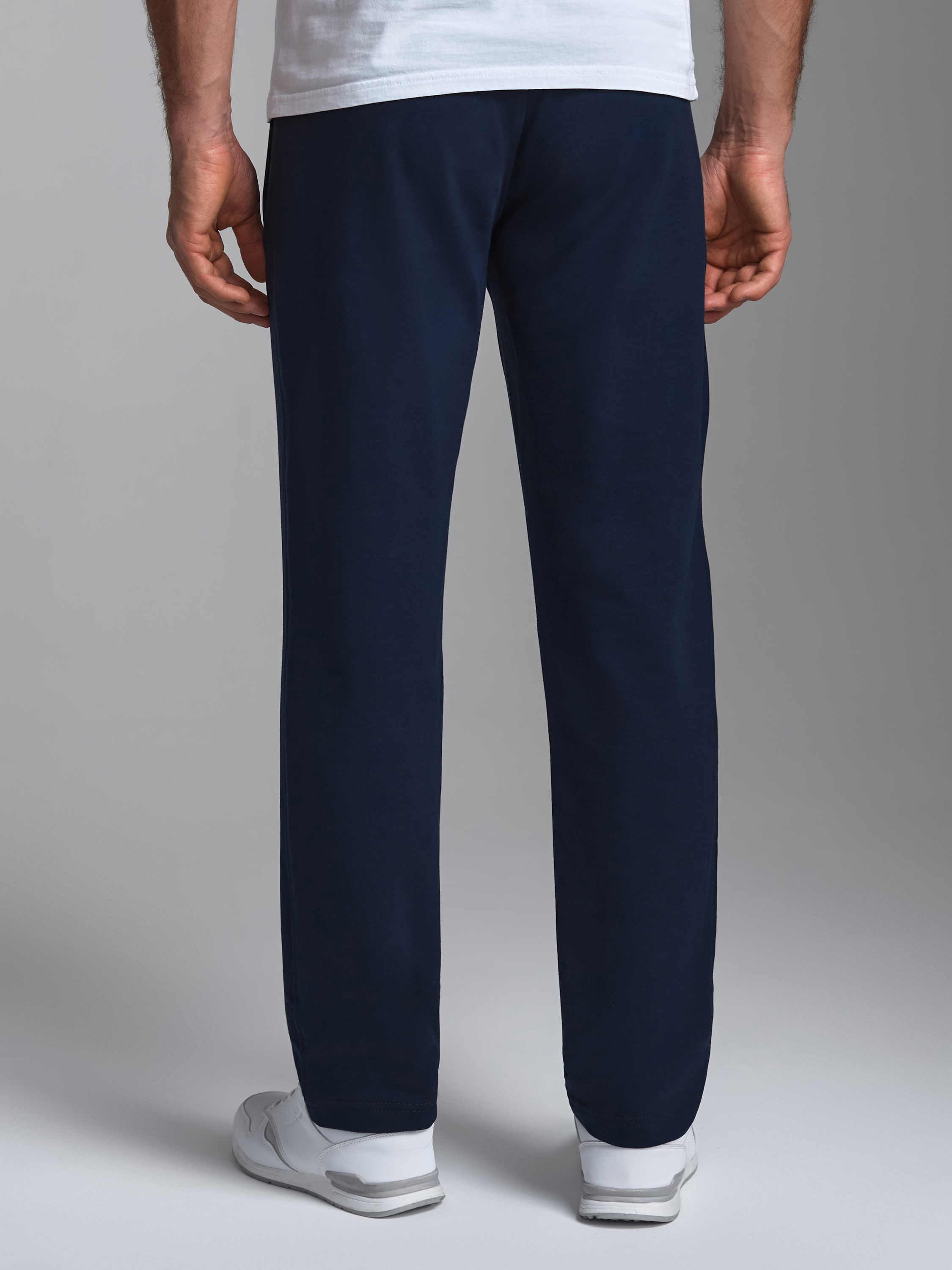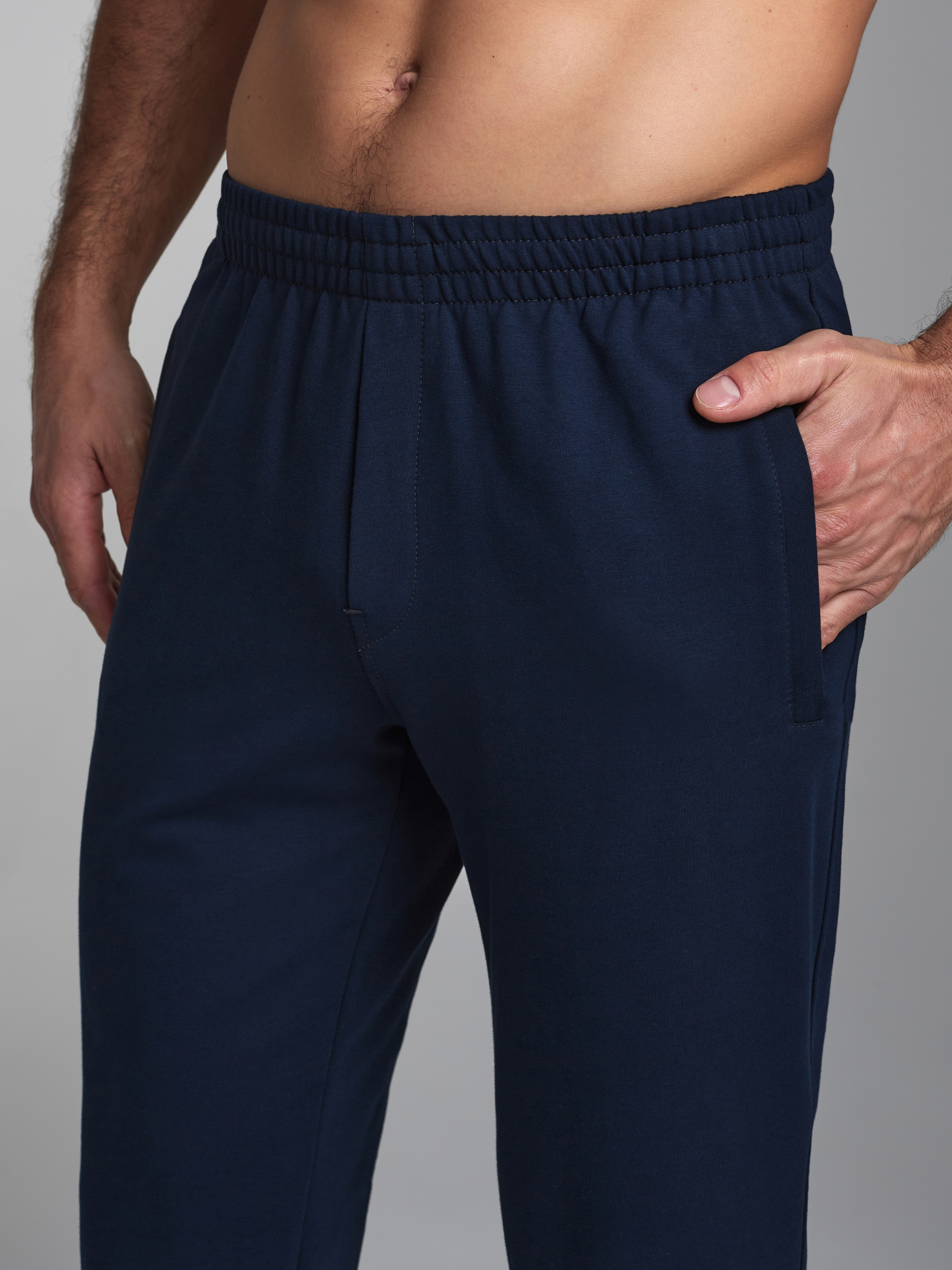 Брюки мужские из хлопкового трикотажного полотна. Карманы прорезные с листочками на молниях. Пояс по талии регулируется шнуром. 77% хлопок, 17% полиэстер, 6% эластан