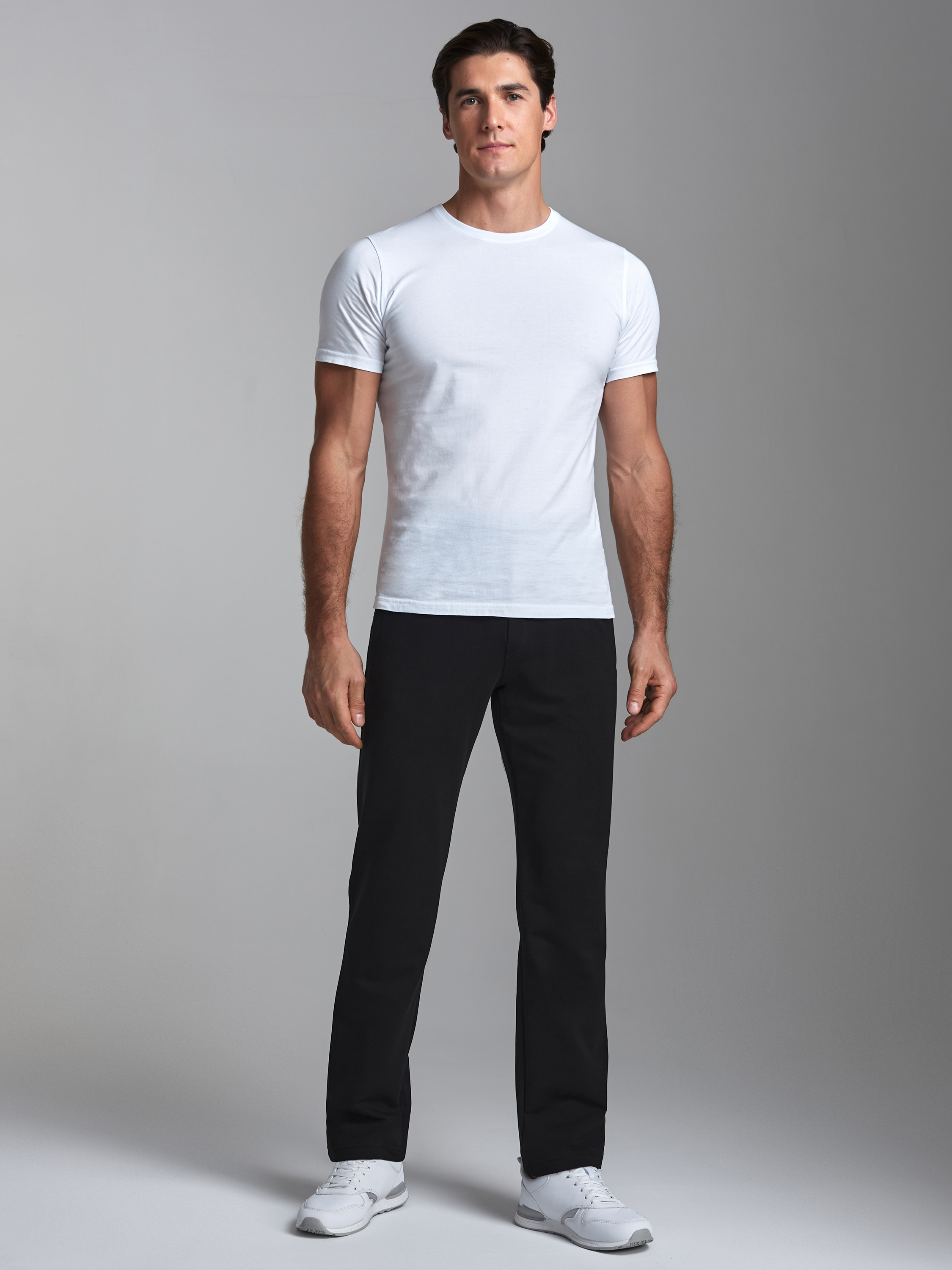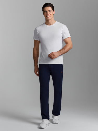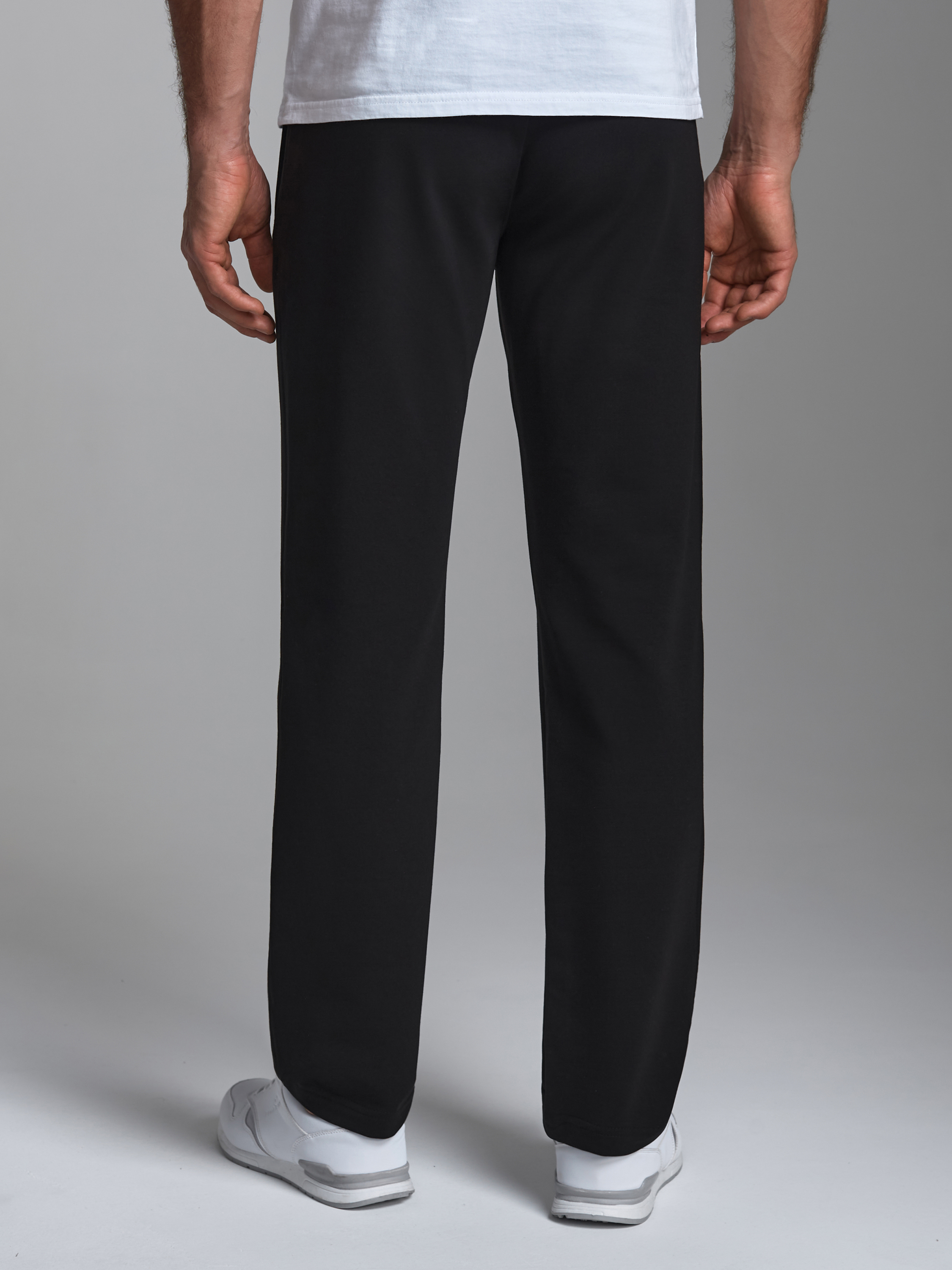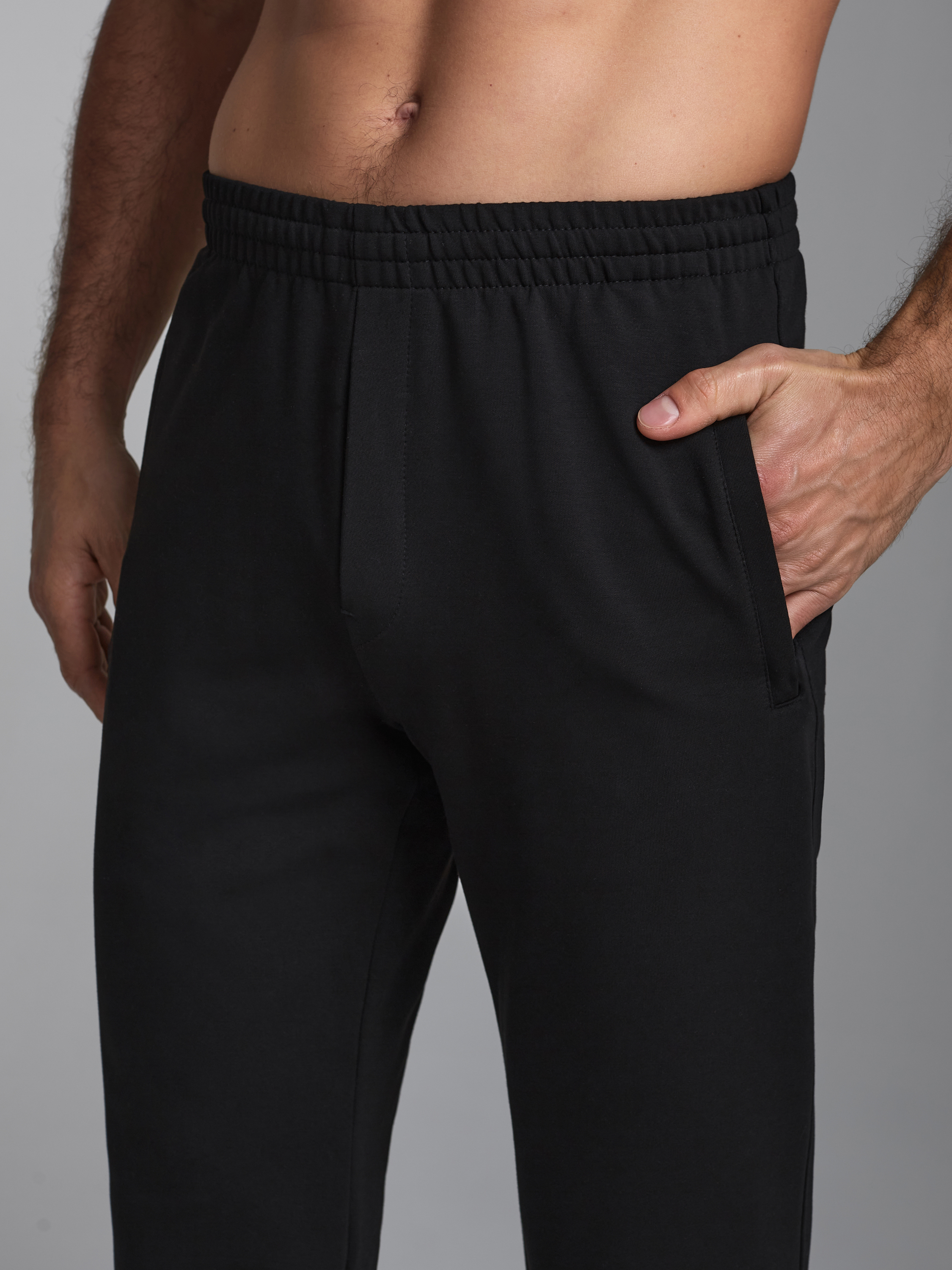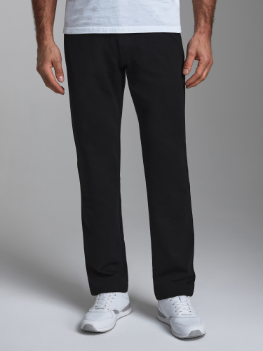 Брюки мужские из хлопкового трикотажного полотна. Карманы прорезные с листочками на молниях. Пояс по талии регулируется шнуром. 77% хлопок, 17% полиэстер, 6% эластан