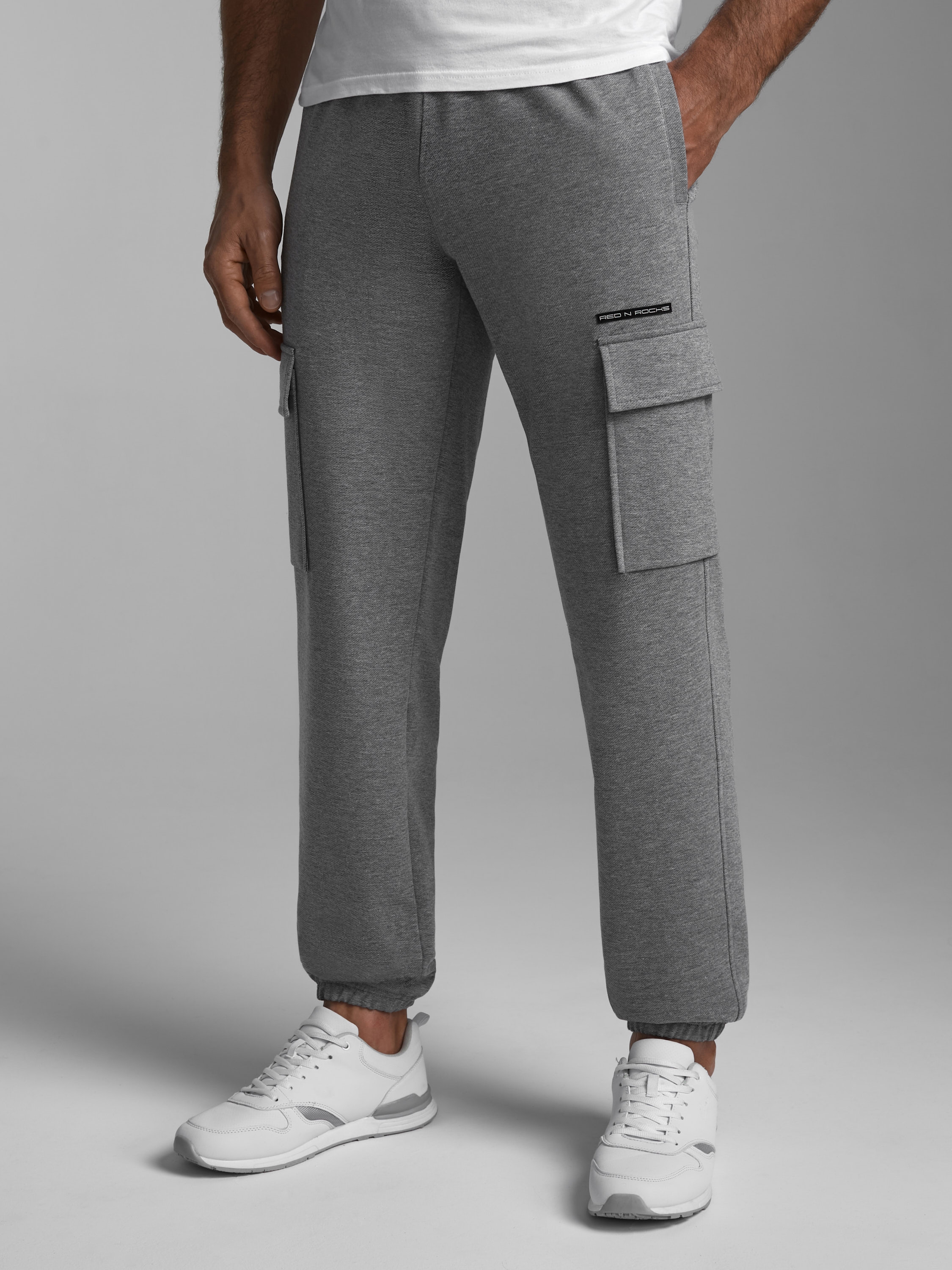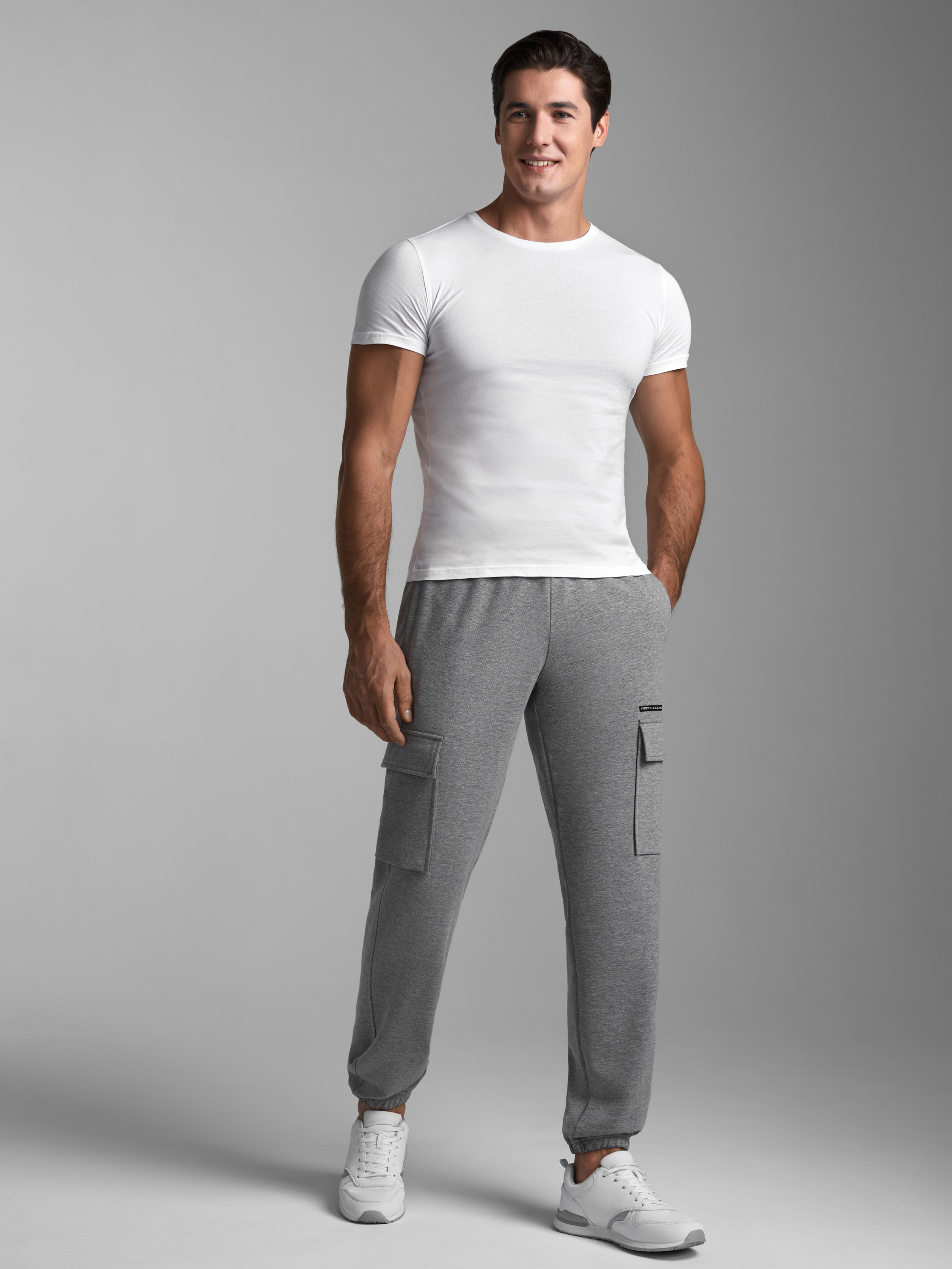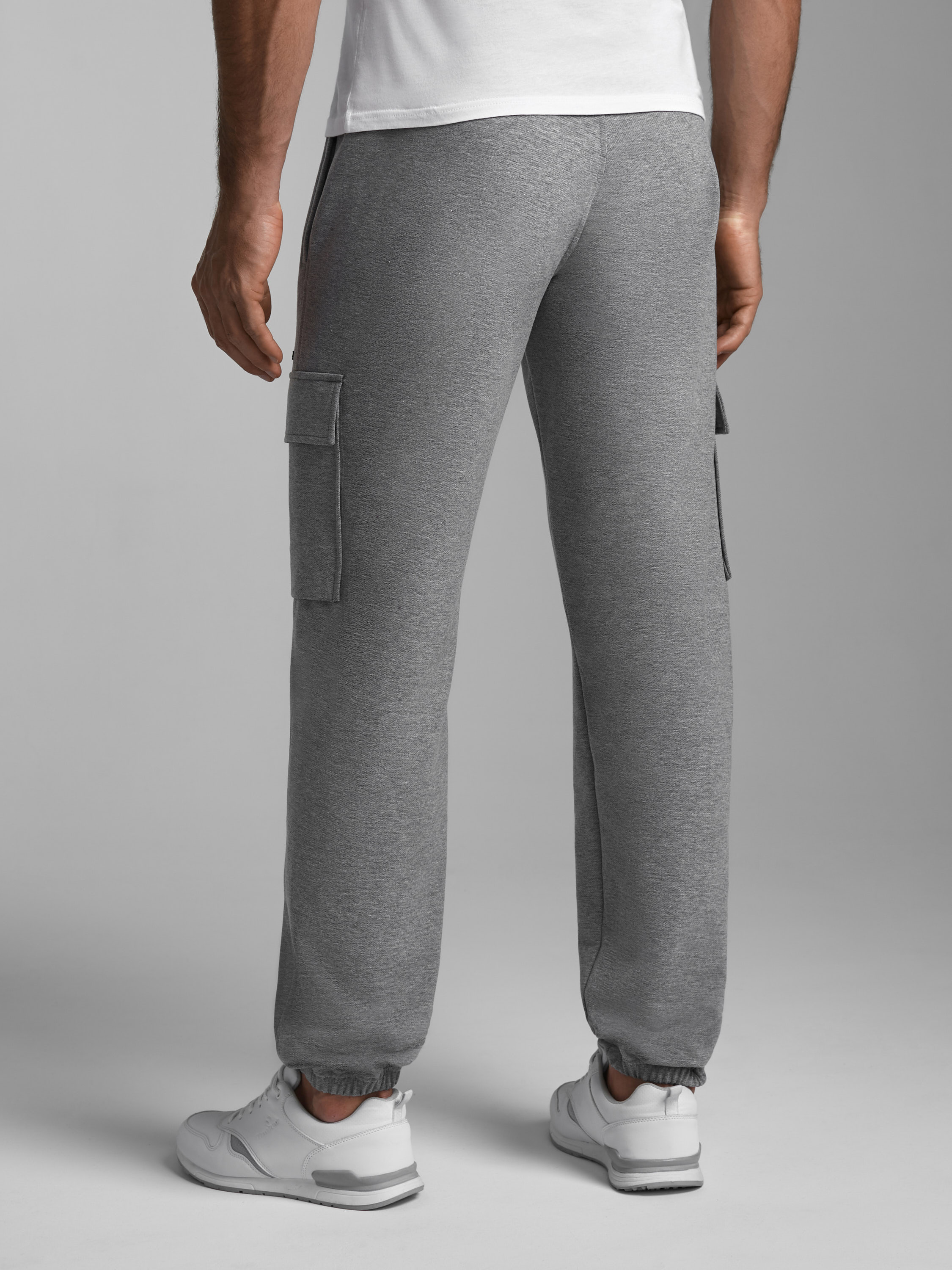 Мужской спортивный костюм из эластичного хлопкового трикотажного полотна. Куртка прямая с воротником, застегивается на молнию. Рукава втачные.Воротник, манжеты и пояс куртки выполнены из эластичного трикотажа. Брюки прямого силуэта. Прорезные карманы куртки и брюк застегиваются на молнии. Пояс брюк эластичный, по линии талии дополнительно регулируется шнуром. 77% хлопок, 17% полиэстер, 6% эластан