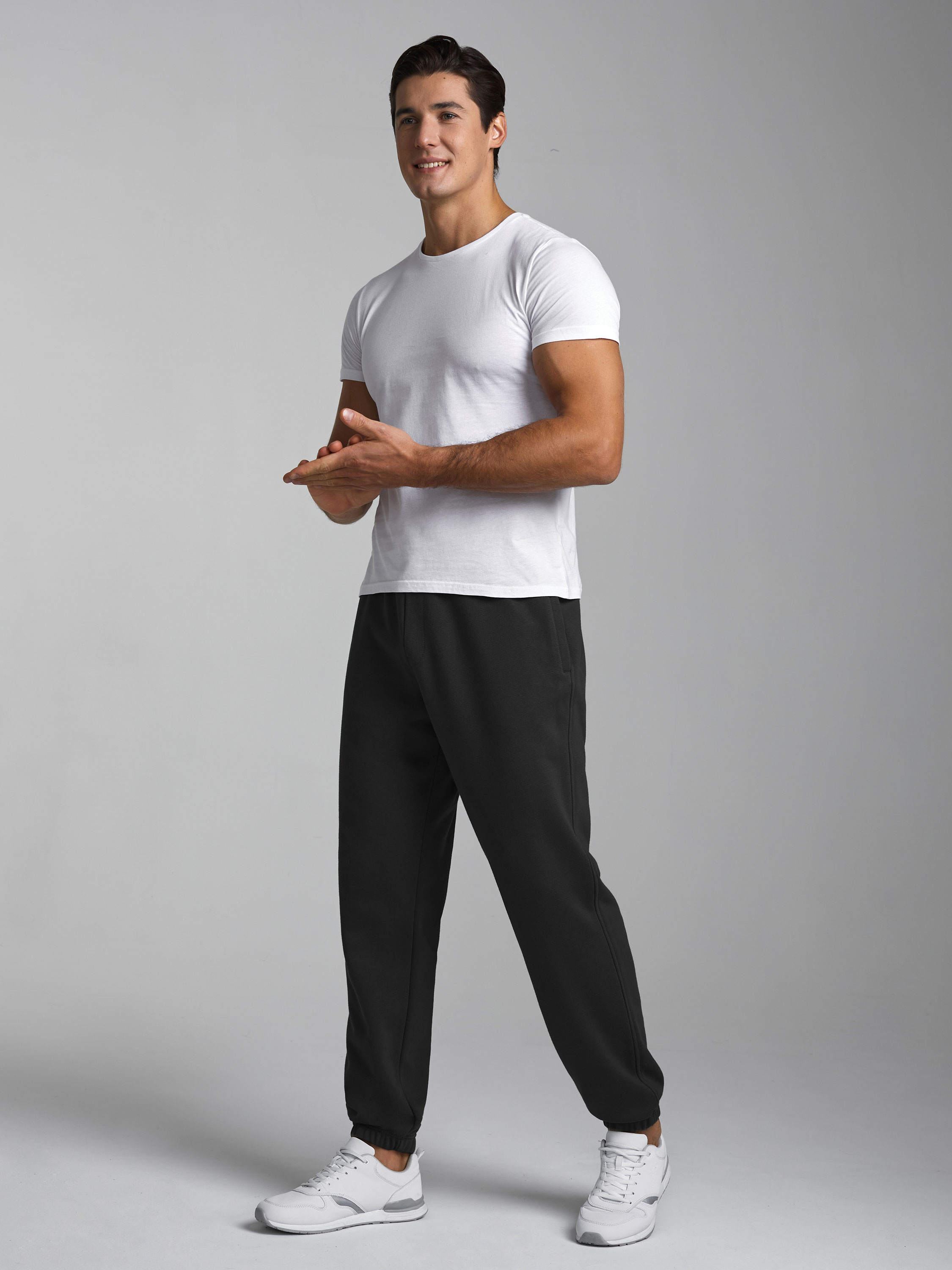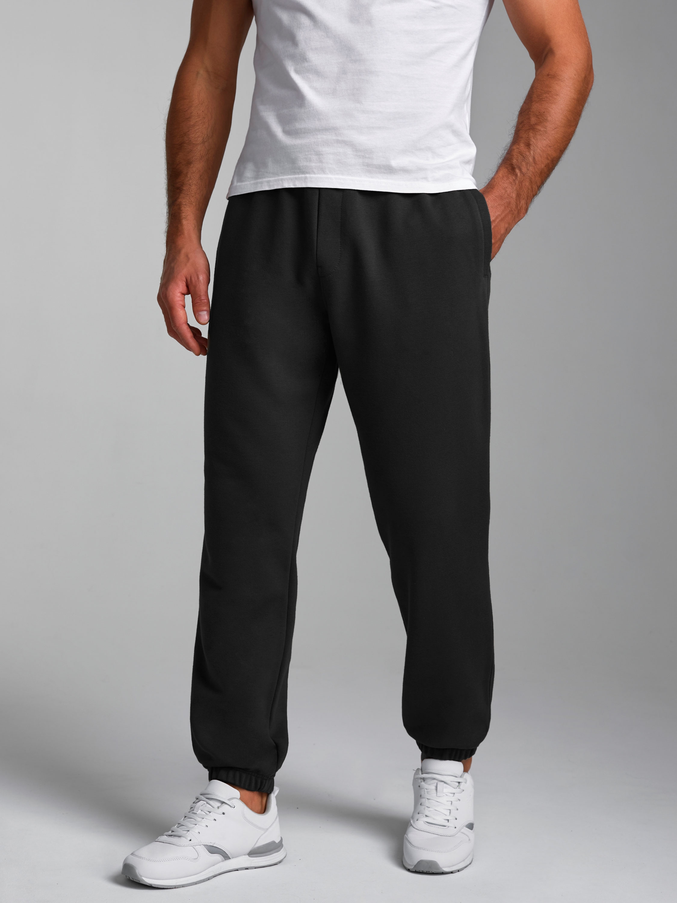 Брюки мужские "Джоггеры" из плотного хлопкового трикотажного полотна с петельной изнанкой. Карманы в подрезах бокового шва. Низ брюк заужен на резинку. Эластичный пояс брюк дополнительно регулируется шнуром. 65% хлопок, 35% полиэстер