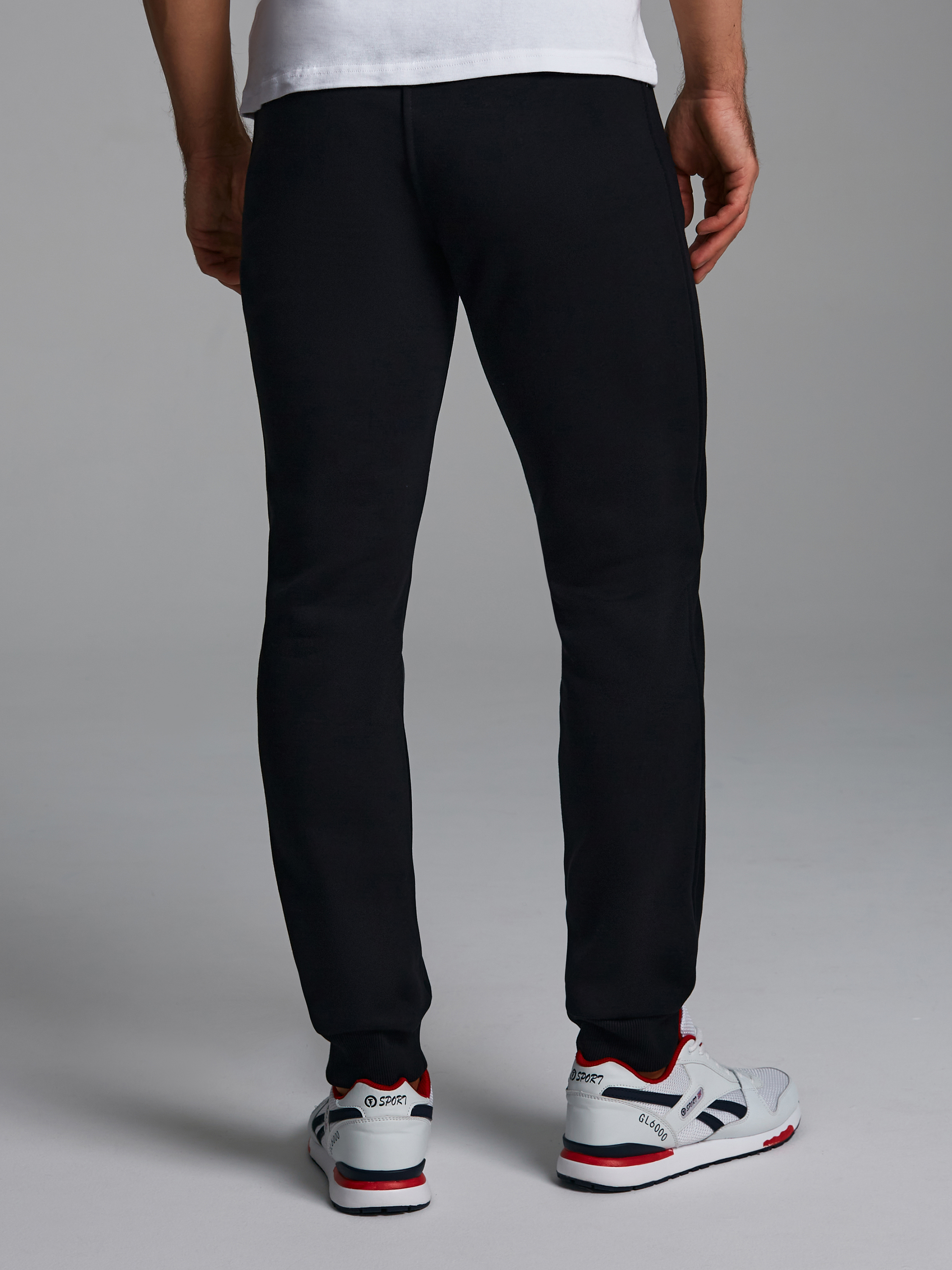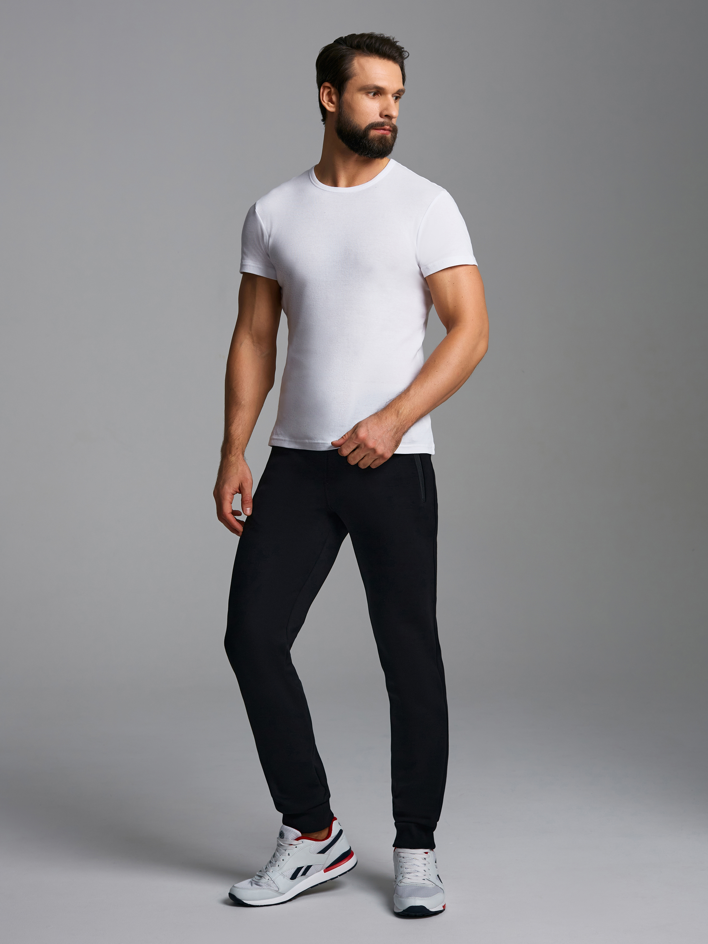 Брюки мужские из плотного и мягкого хлопкового трикотажного полотна с изнаночным начесом. Брюки зауженного силуэта с прорезными карманами, с открытой молнией. 65% хлопок, 35% полиэстер