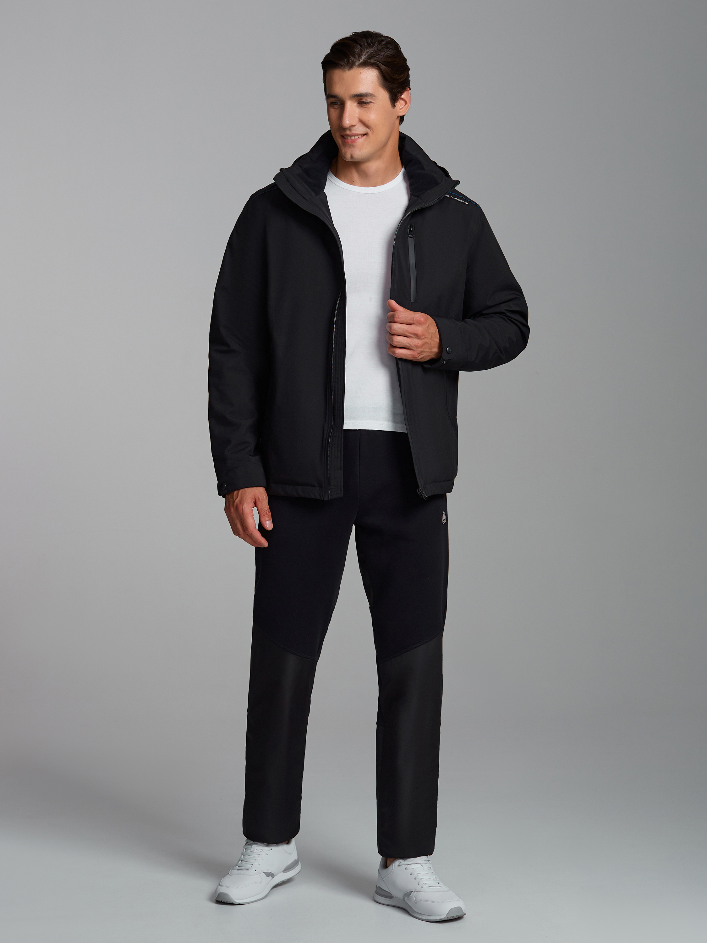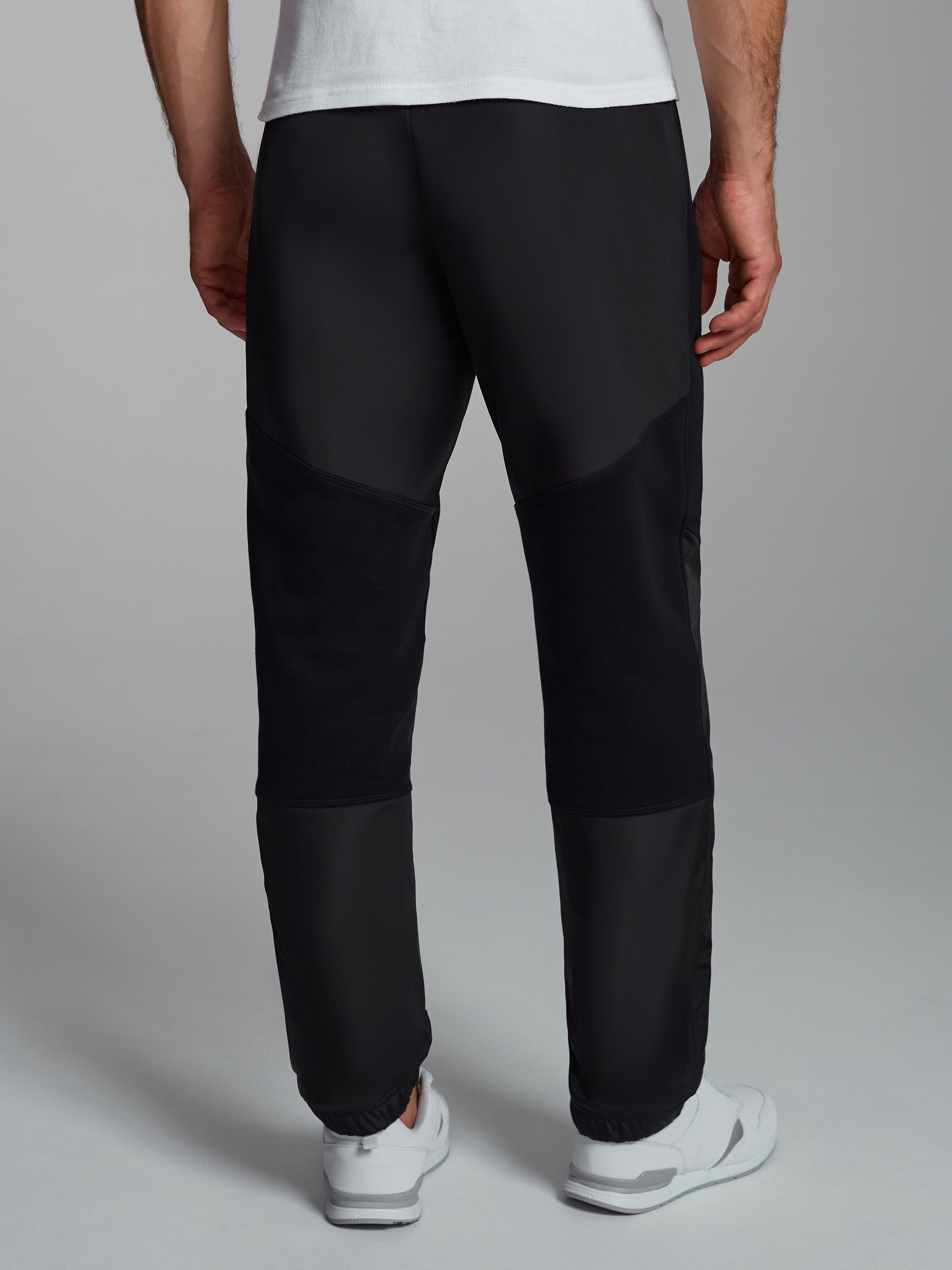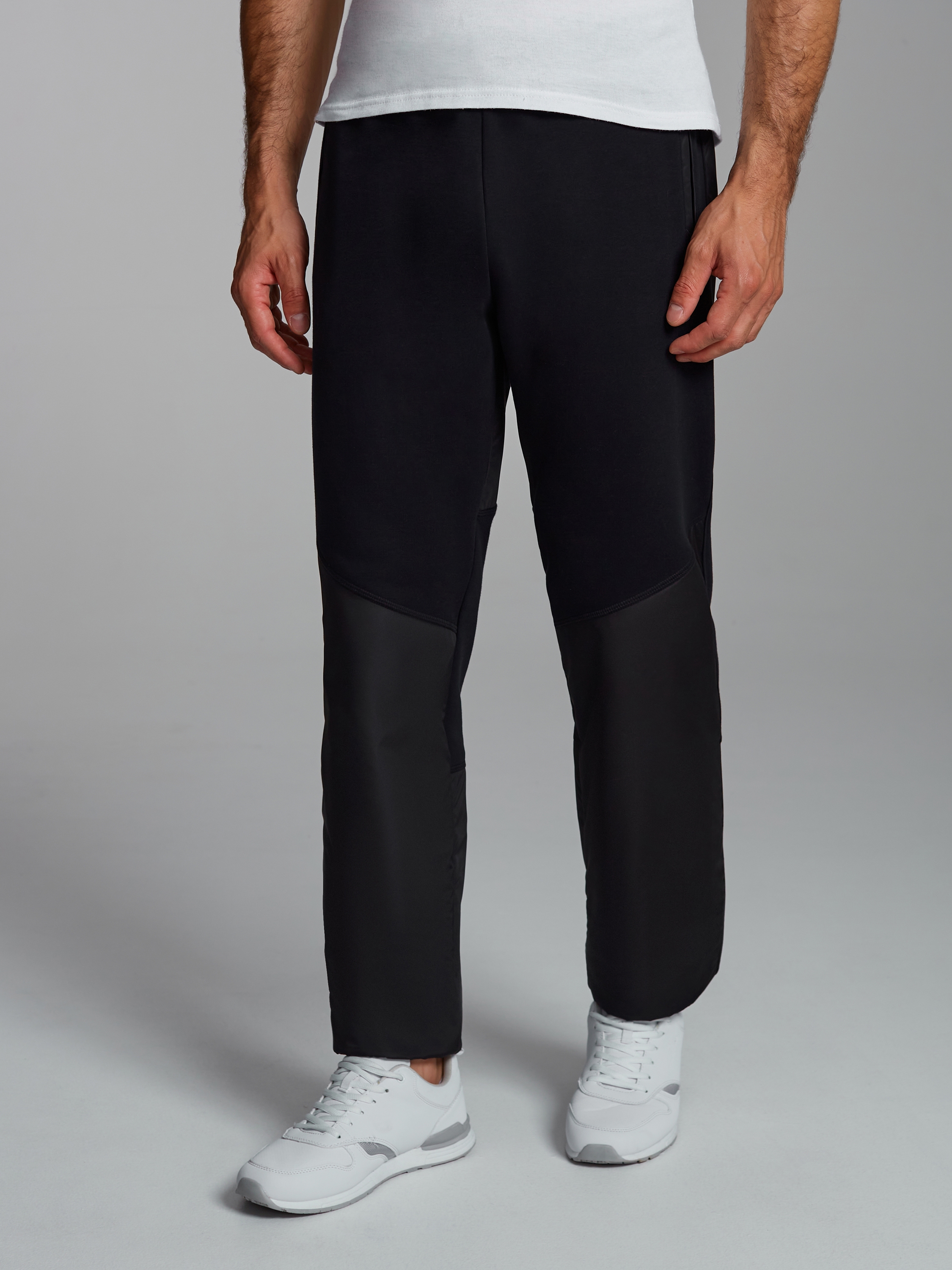 Брюки мужские из плотного и мягкого хлопкового трикотажного полотна с изнаночным начесом. На брюках в области бедер колена и по низу брючин вставки из водоотталкиваюшей плащевой ткани. Карманы "в рамку" с молниями. Низ брюк прямой. Пояс по талии дополнительно регулируется шнурком. На левой половине, вдоль бокового шва настрочен шеврон с фирменным логотипом. 65% хлопок, 35% полиэстер