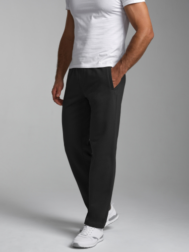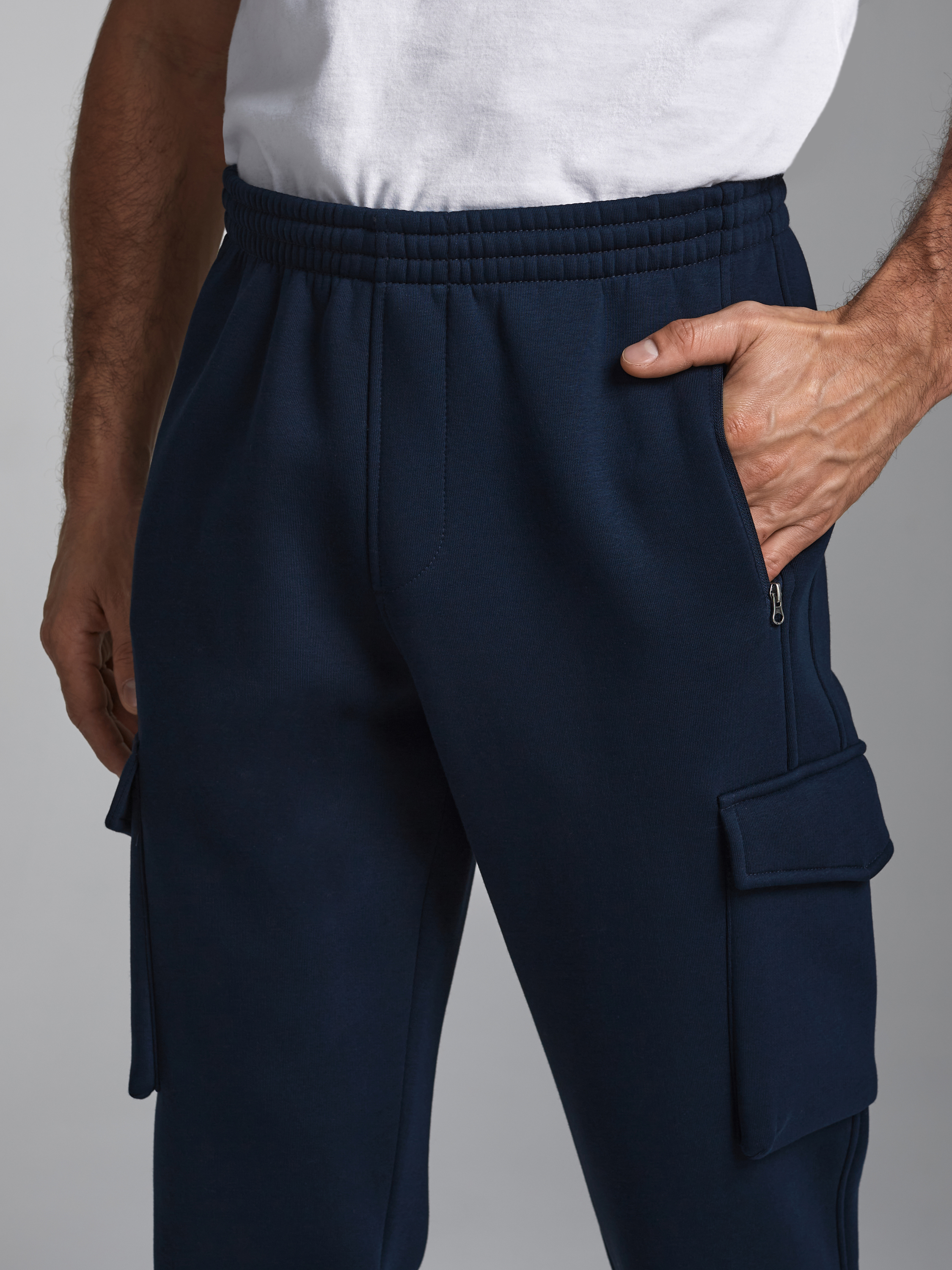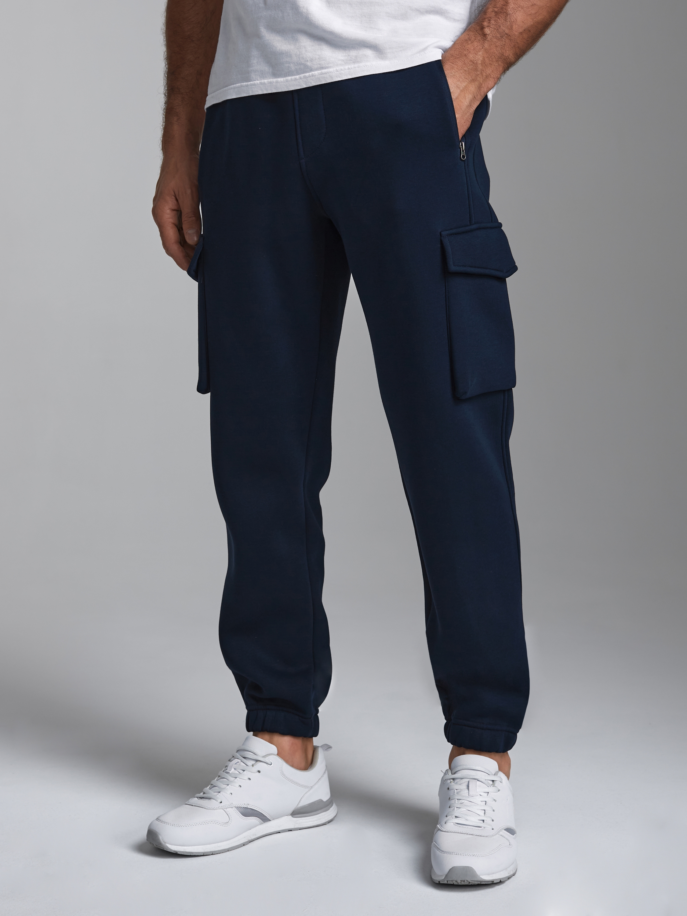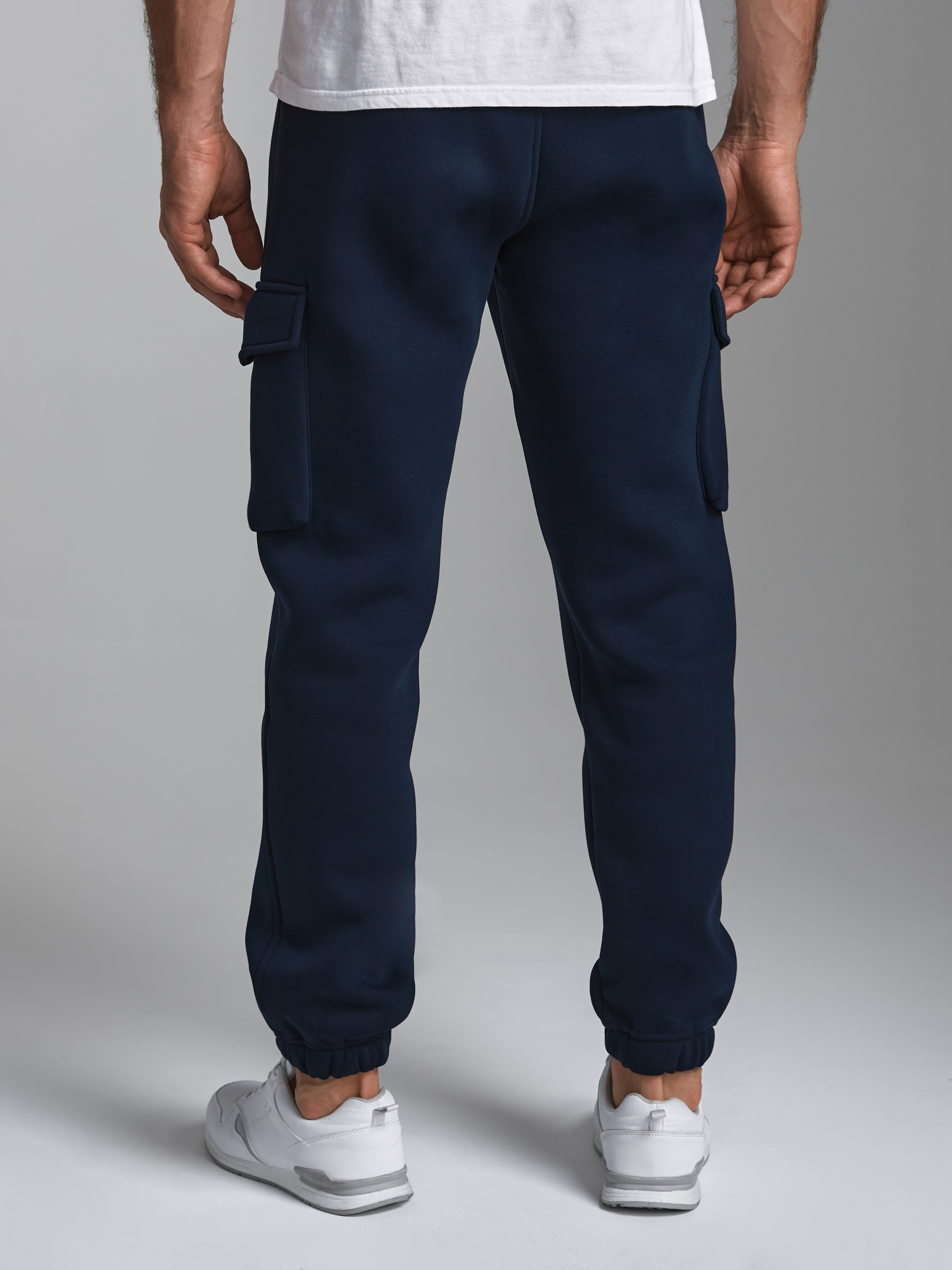 Брюки мужские из плотного и мягкого хлопкового трикотажного полотна с изнаночным начесом. Карманы в рельефах брюк с молниями. Есть еще дополнительные накладные боковые карманы с клапанами. Низ брюк заужен с манжетой на эластичной резине. Пояс по талии дополнительно регулируется шнурком. 65% хлопок, 35% полиэстер