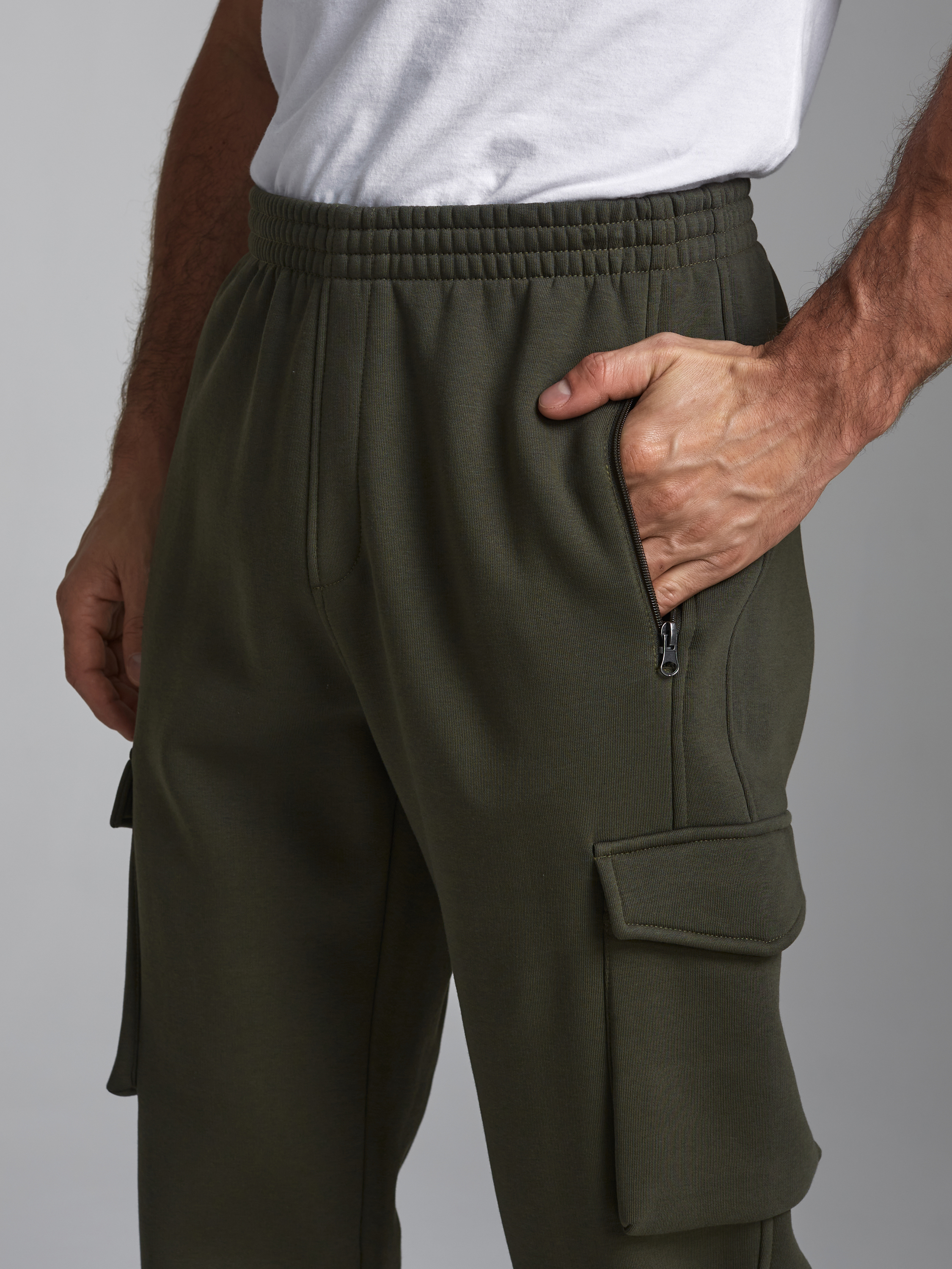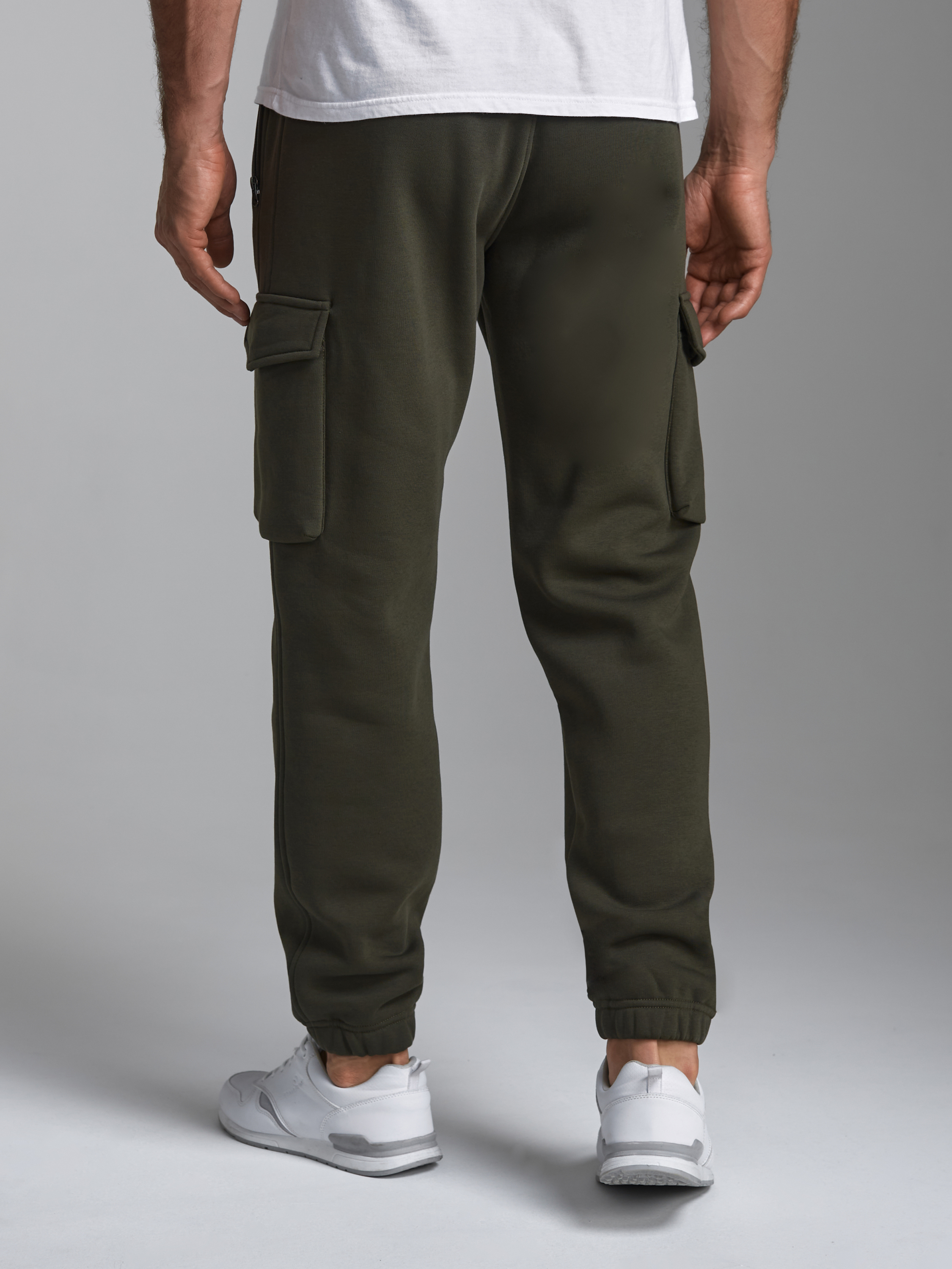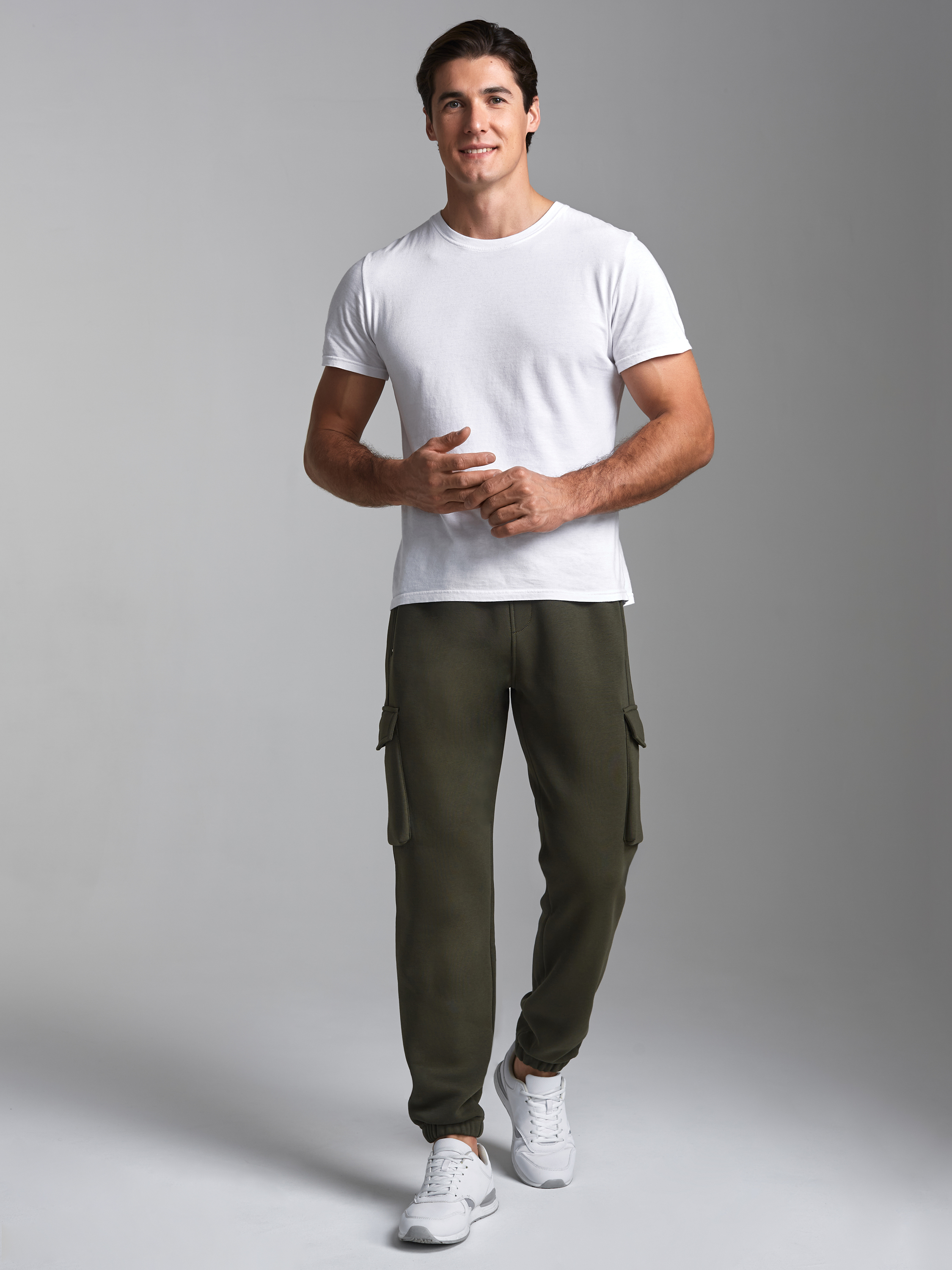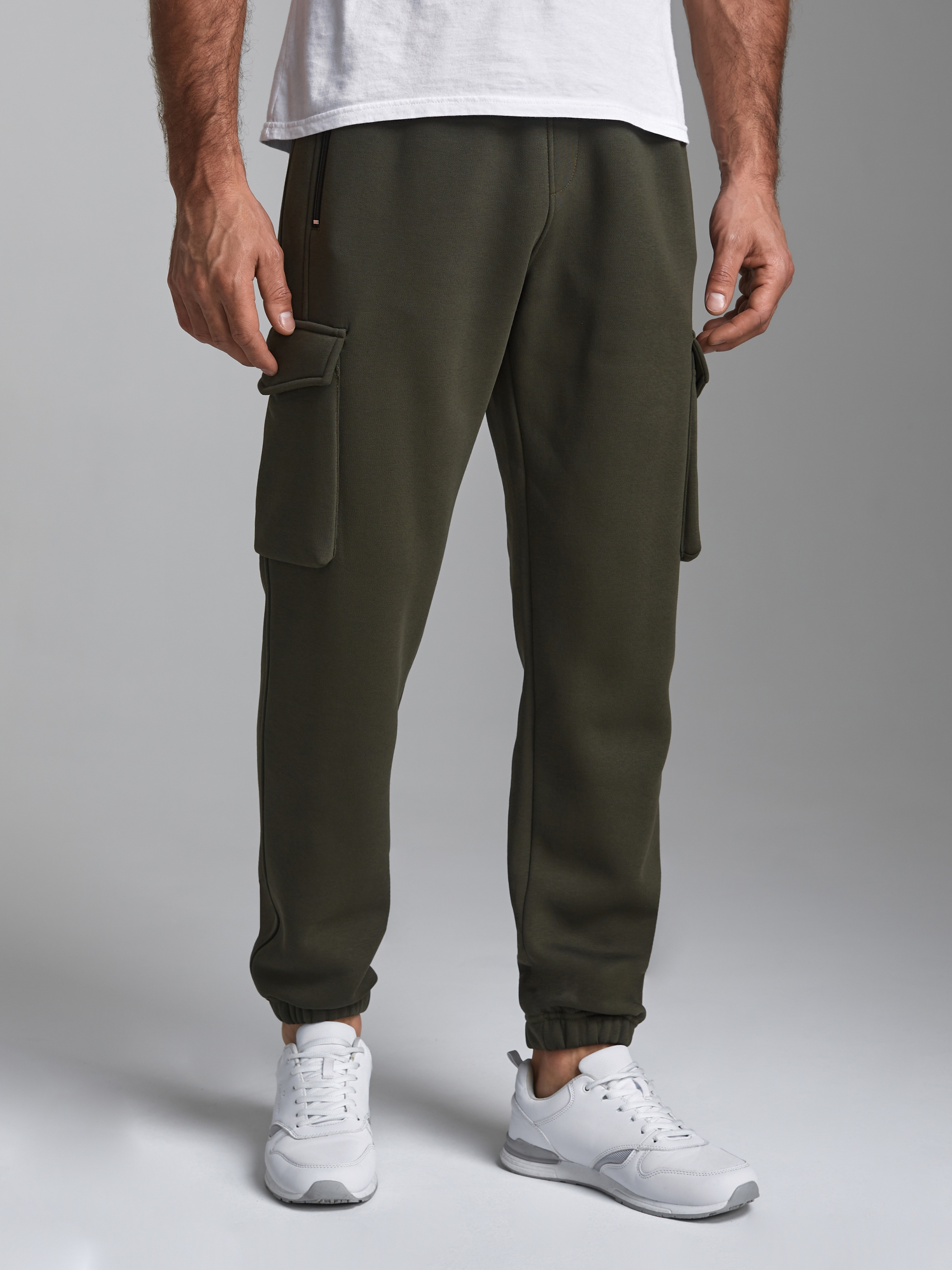 Брюки мужские из плотного и мягкого хлопкового трикотажного полотна с изнаночным начесом. Карманы в рельефах брюк с молниями. Есть еще дополнительные накладные боковые карманы с клапанами. Низ брюк заужен с манжетой на эластичной резине. Пояс по талии дополнительно регулируется шнурком. 65% хлопок, 35% полиэстер