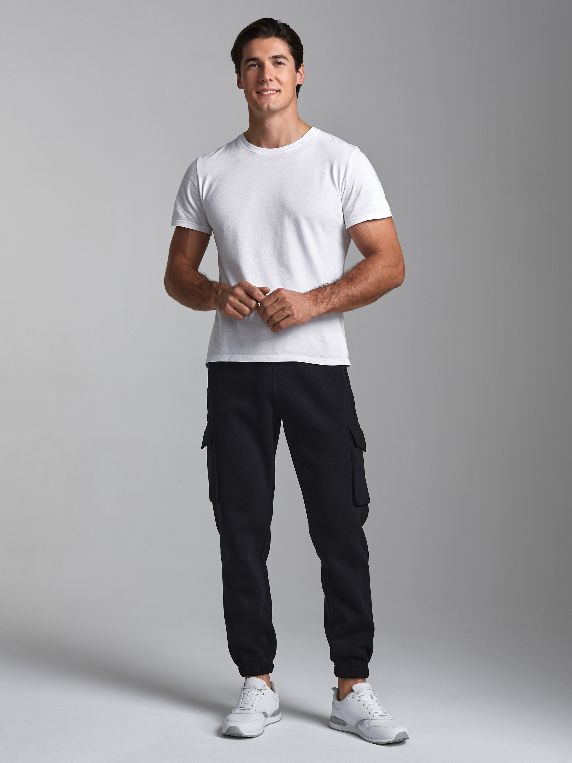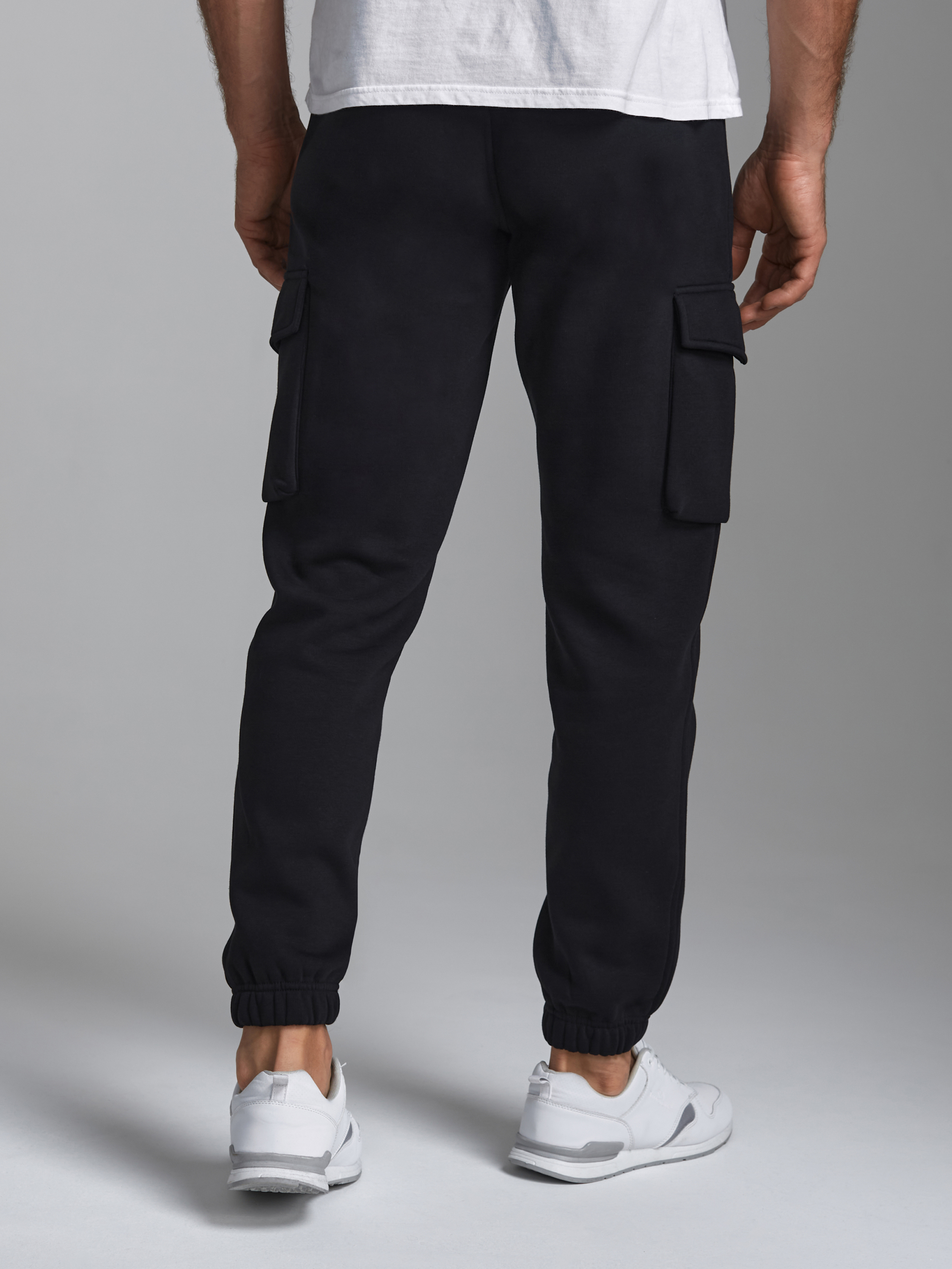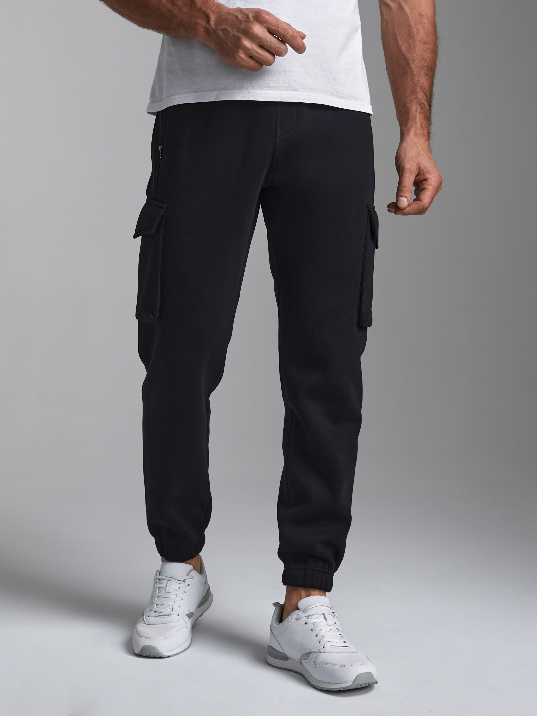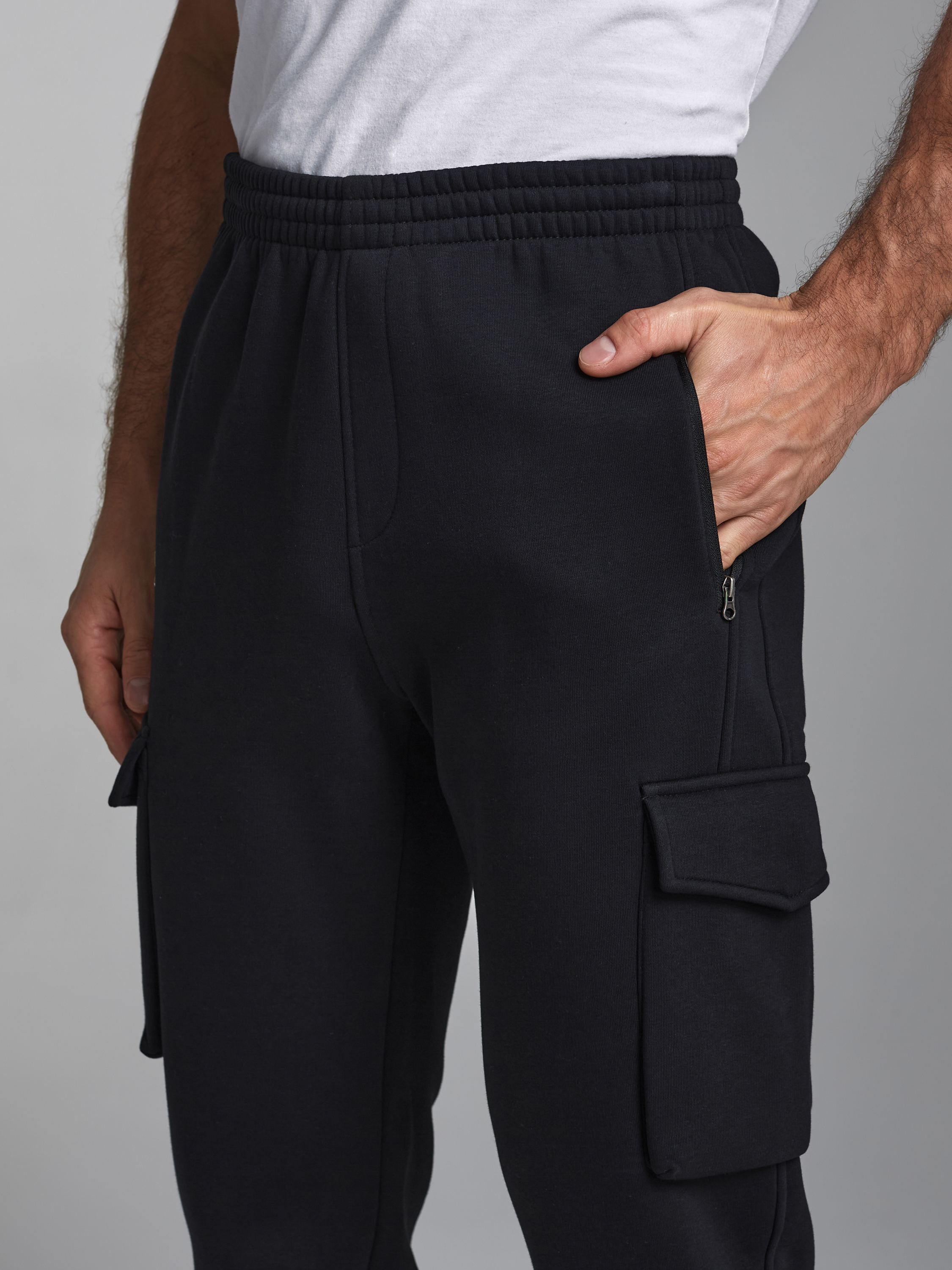Брюки мужские из плотного и мягкого хлопкового трикотажного полотна с изнаночным начесом. Карманы в рельефах брюк с молниями. Есть еще дополнительные накладные боковые карманы с клапанами. Низ брюк заужен с манжетой на эластичной резине. Пояс по талии дополнительно регулируется шнурком. 65% хлопок, 35% полиэстер