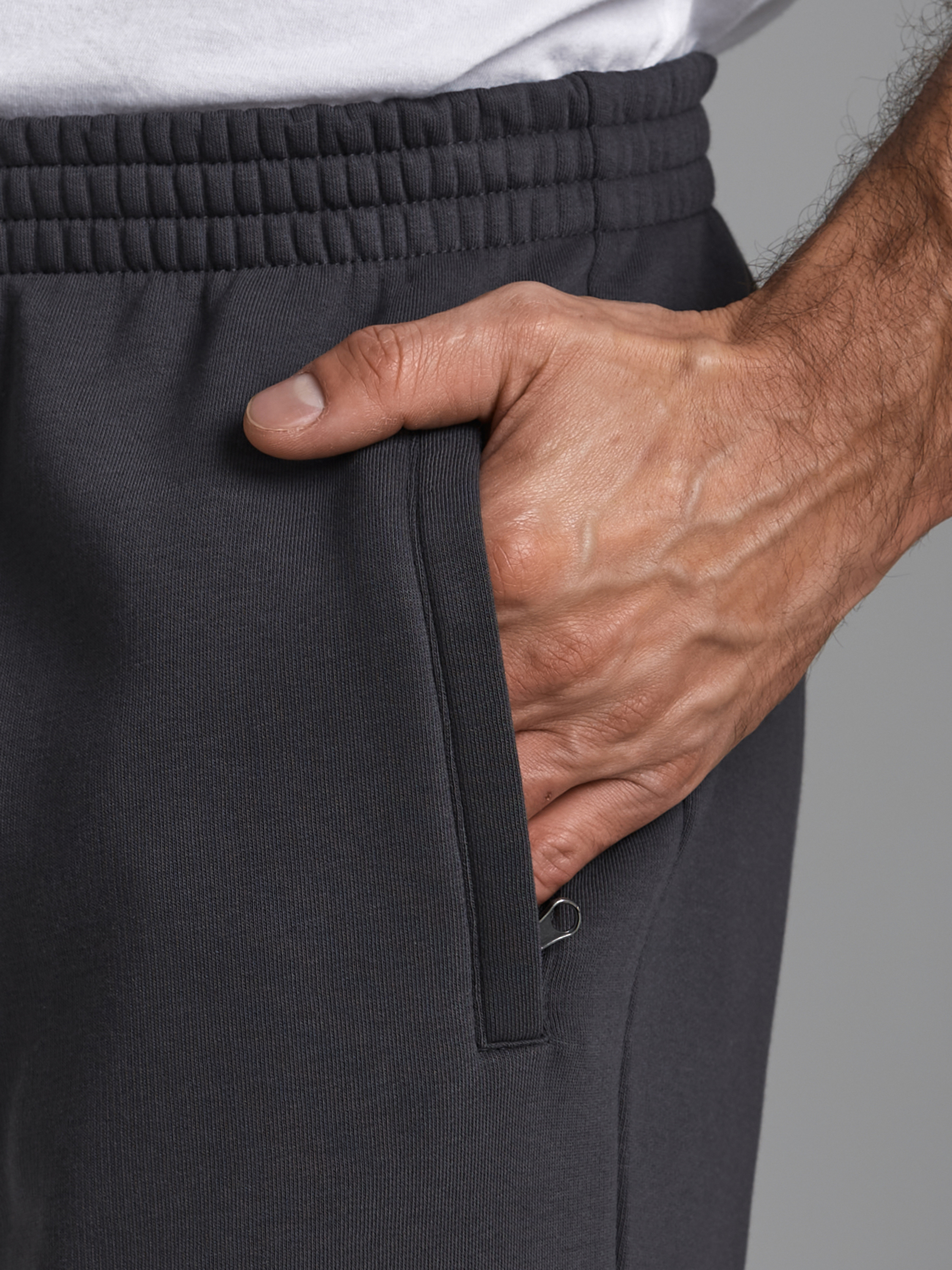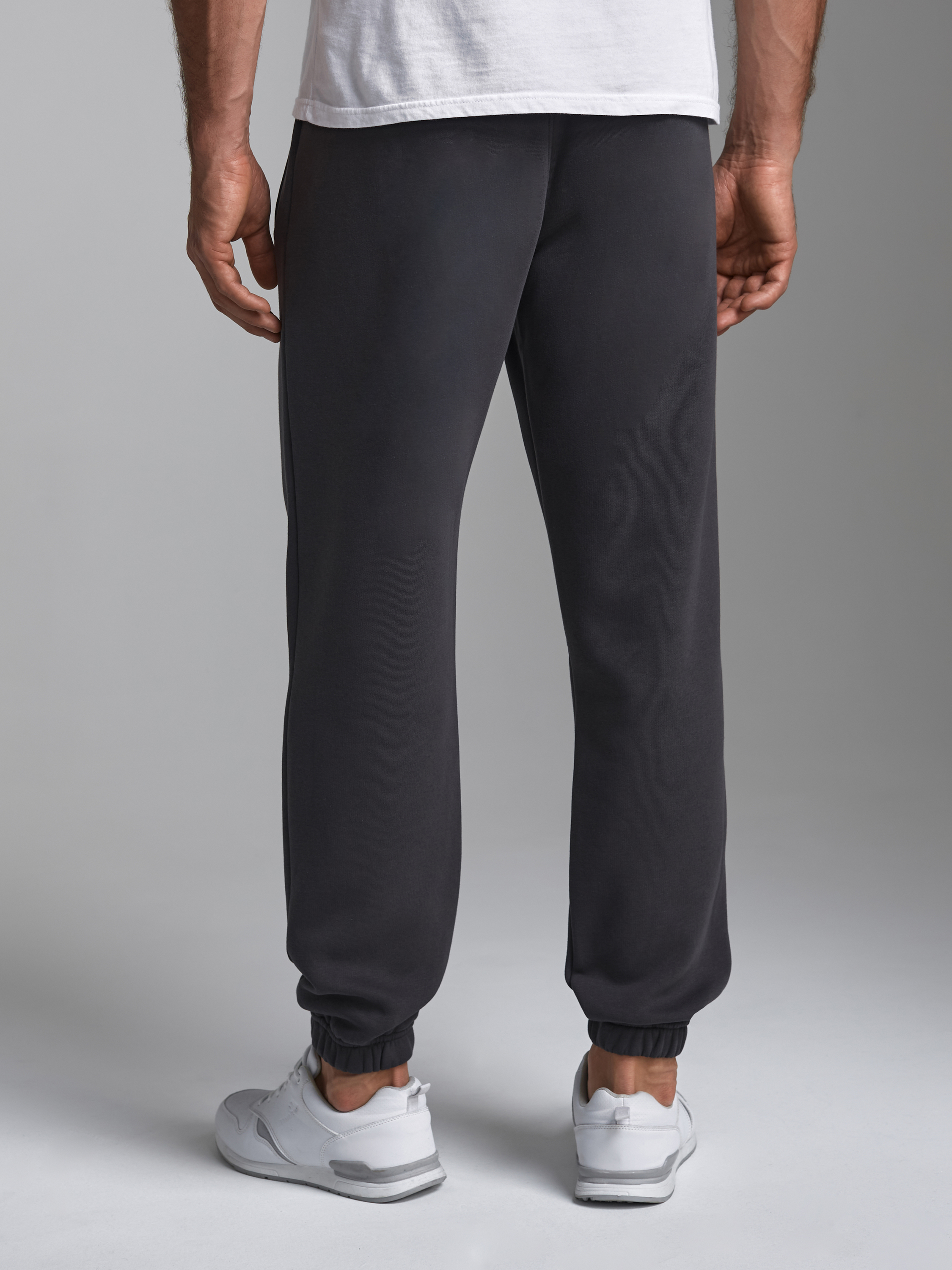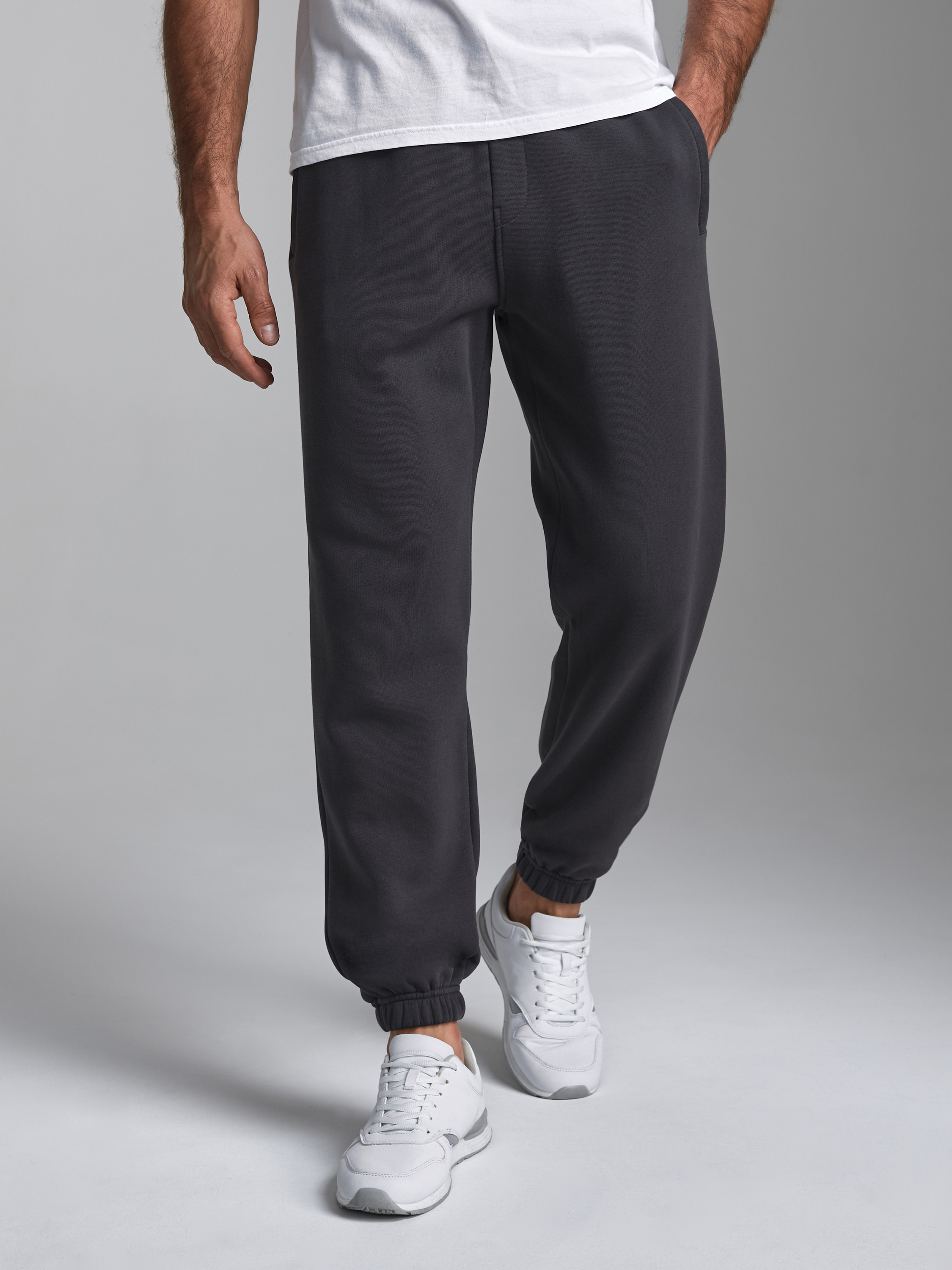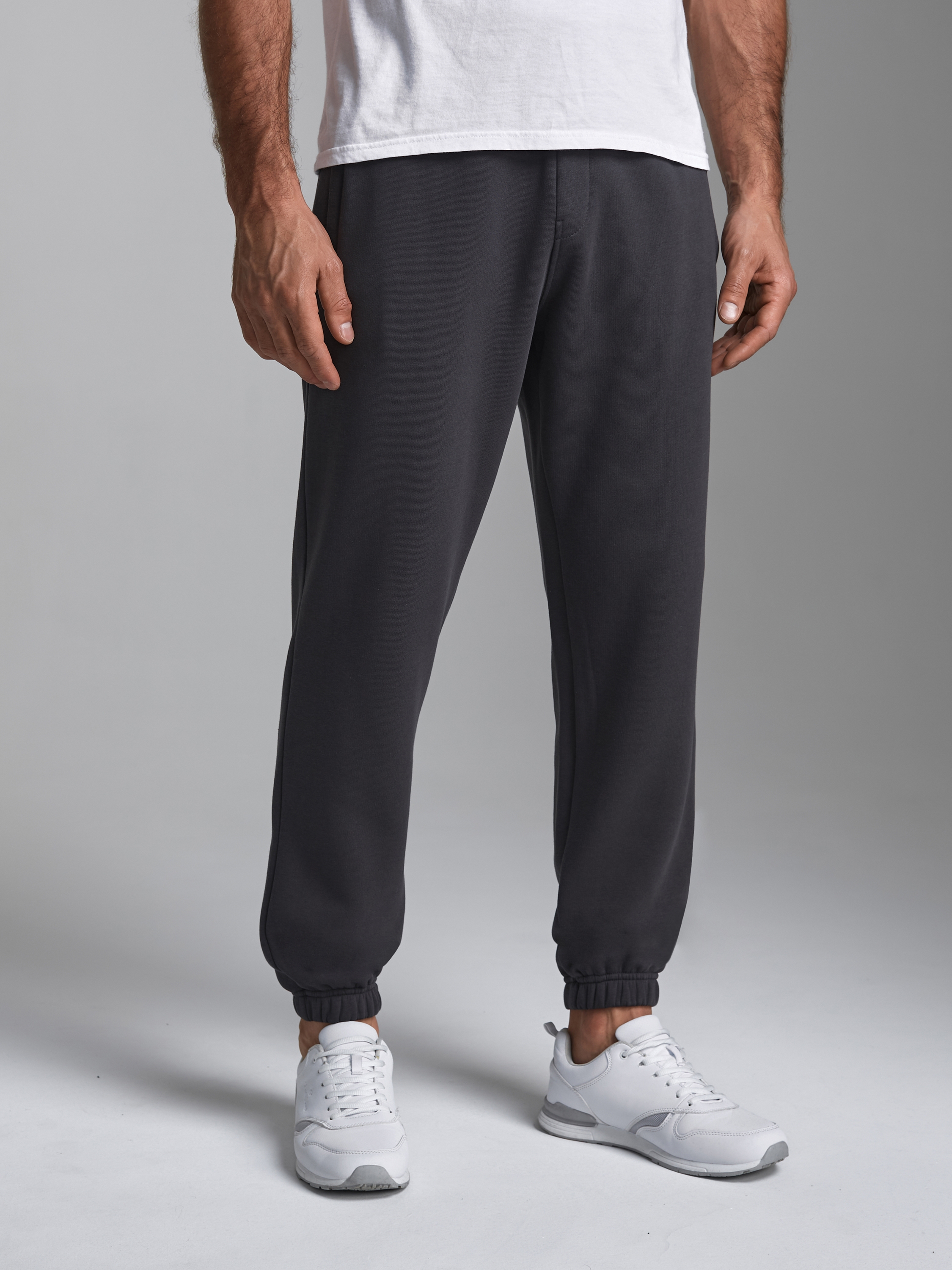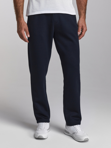 Брюки мужские из плотного и мягкого хлопкового трикотажного полотна с изнаночным начесом. Карманы с планками застегиваются на молнии. Низ брюк заужен с манжетой на эластичной резине. Пояс по талии дополнительно регулируется шнурком. 65% хлопок, 35% полиэстер