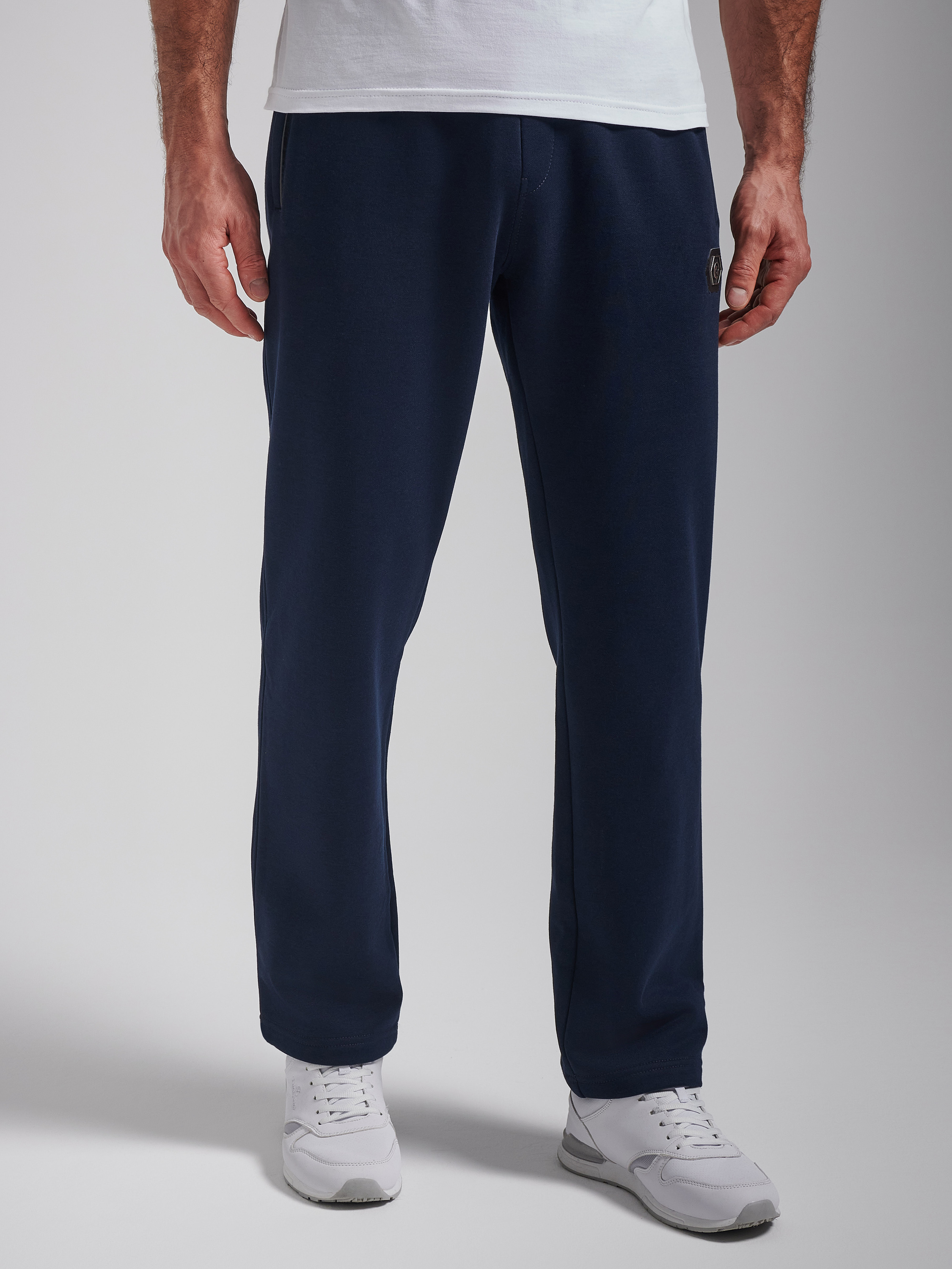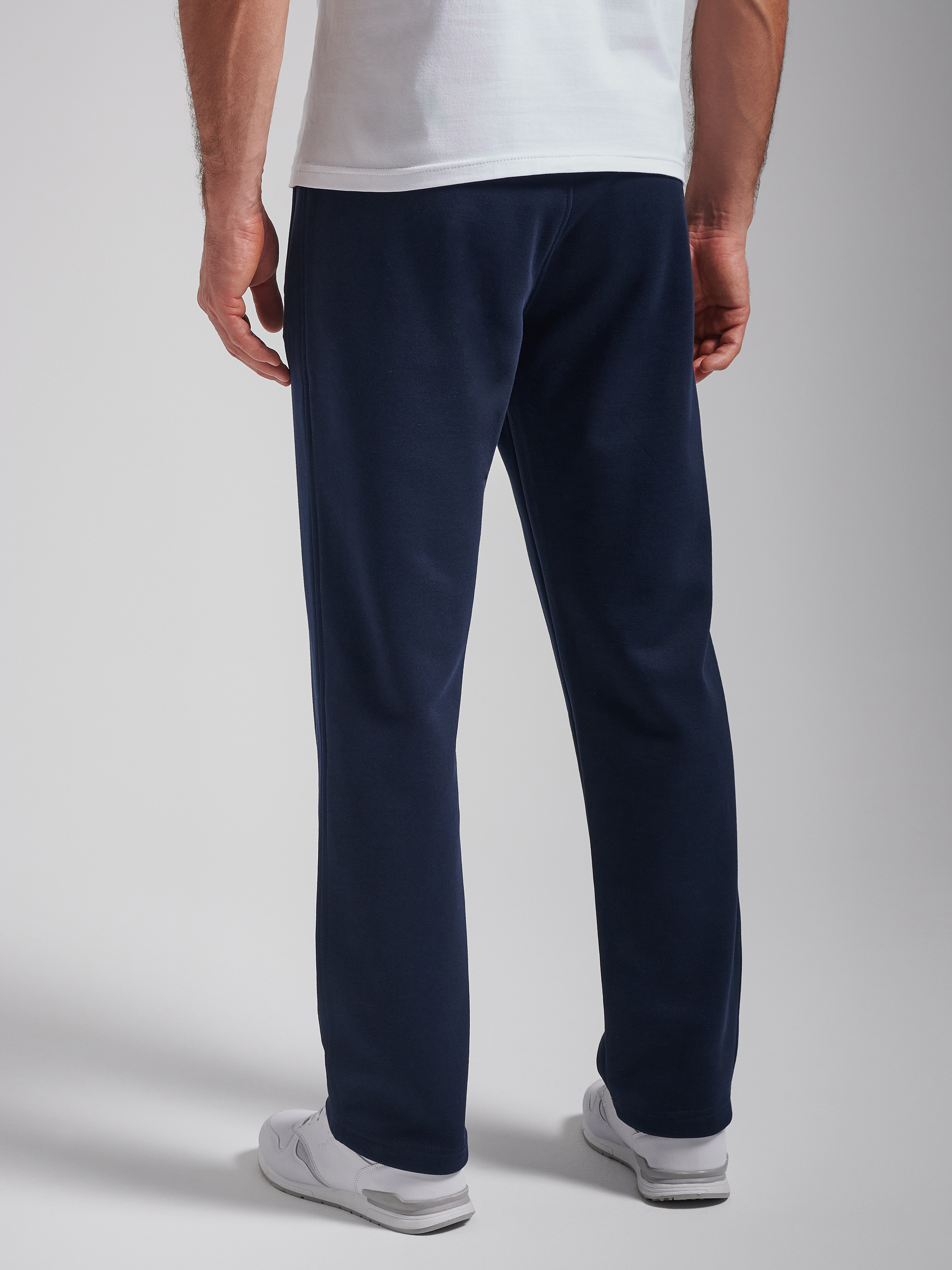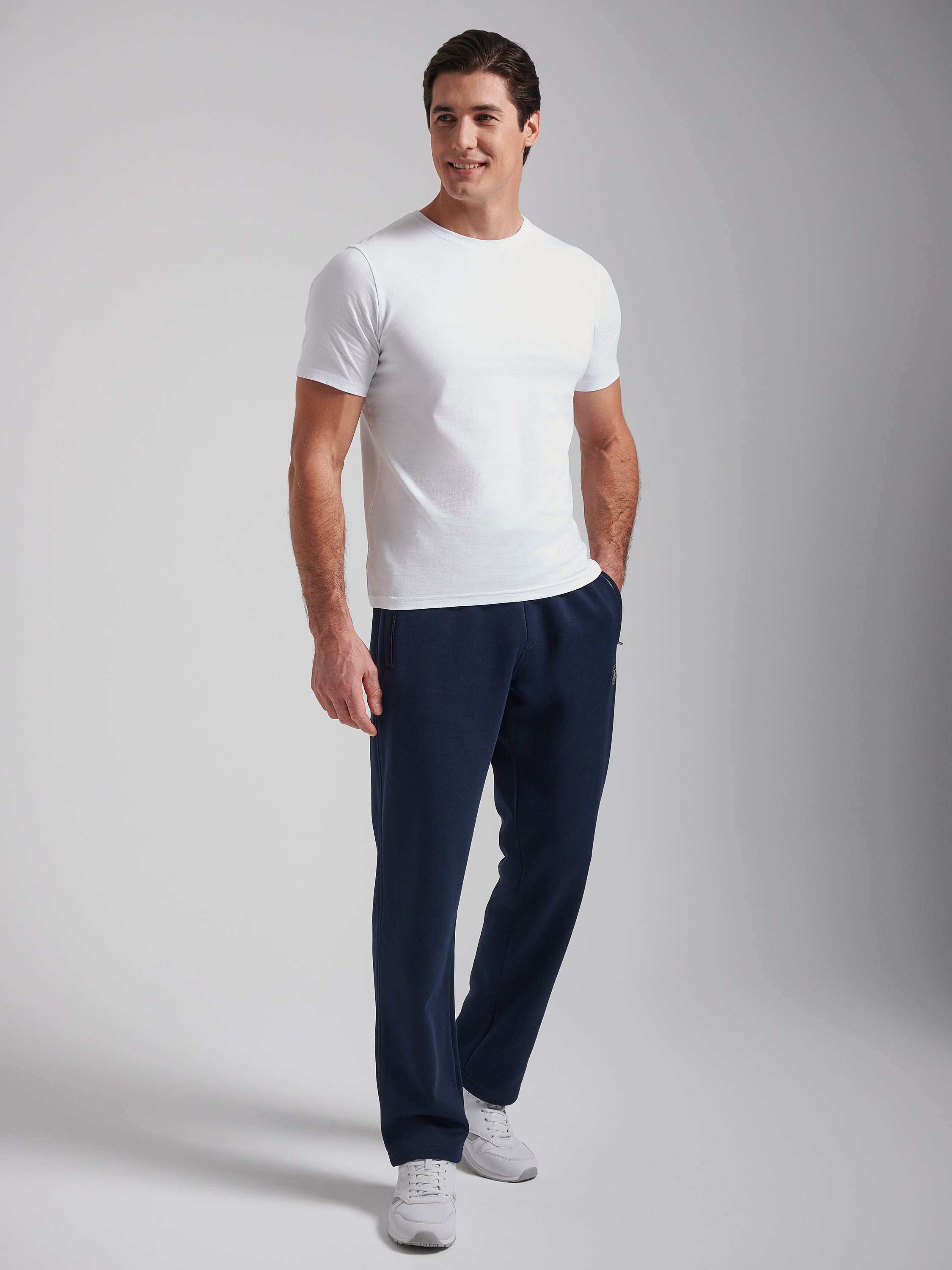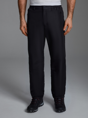 Брюки мужские прямого силуэта из плотного и мягкого хлопкового трикотажного полотна с изнаночным начесом. Карманы с планками, застегиваются на молнии. Под левым карманом настрочен шеврон с фирменным логотипом. Пояс с широкой резинкой, по талии дополнительно регулируется шнурком. 65% хлопок, 35% полиэстер