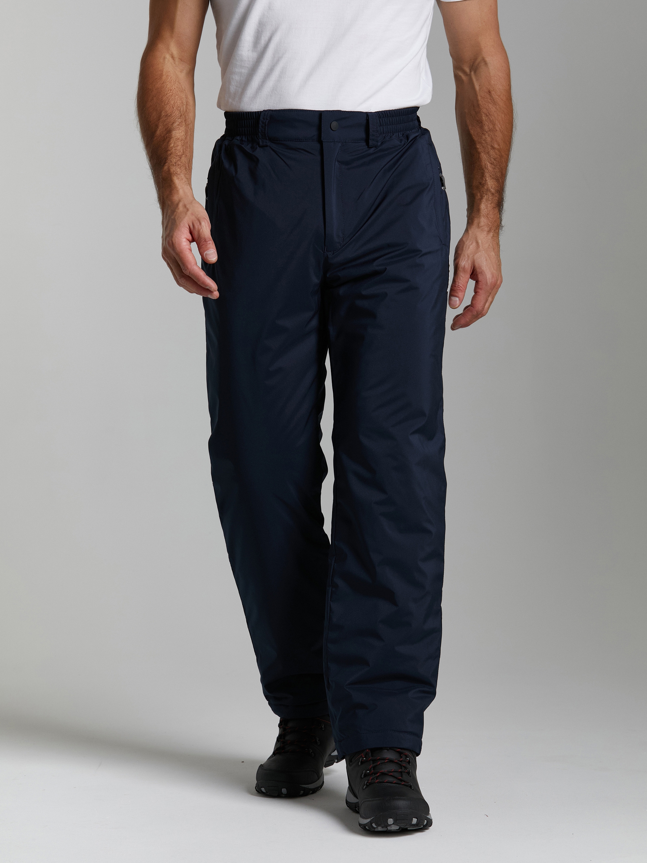 Теплые мужские брюки изготовлены из водоотталкивающей плащевой ткани с мембранным пленочным покрытием. Брюки прямого силуэта утеплены высококачественным полиэфирным материалом. Подкладка - гладкая полиэфирная ткань. Карманы брюк прорезные, с молниями. Под левым карманом нашивка с фирменным логотипом. Пояс брюк с внутренней стороны изготовлен из мягкого ворсованного трикотажа, Для регулировки брюк по талии предусмотрена резинка и шлевки для поясного ремня.