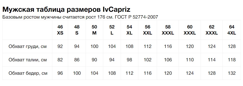 Размерная сетка мужская