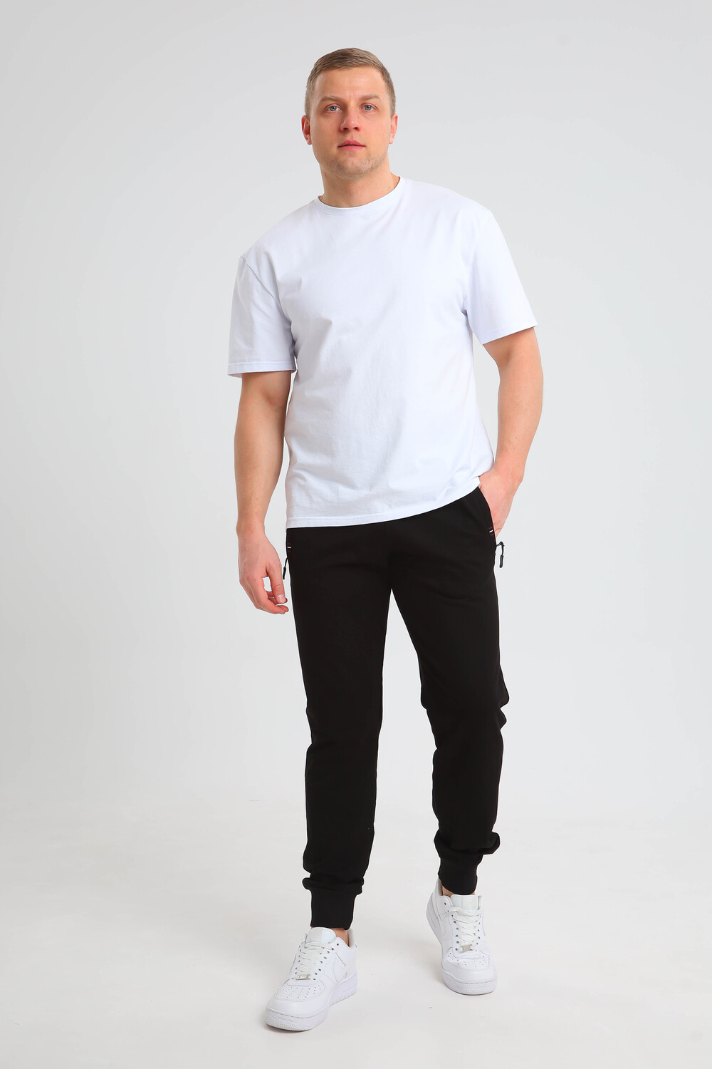 Мужские, спортивные брюки. Пояс на резинке, по бокам два кармана с молнией. Низ на манжетах. Они изготовлены из высококачественного трикотажа, за счет чего штаны не вытягиваются на месте колен и не теряют свой вид. Удобная, приятная к телу ткань и не ограничивает движения. Подойдут для спорта, отдыха и повседневной носки.