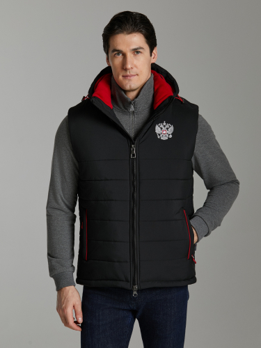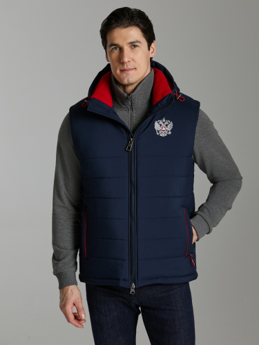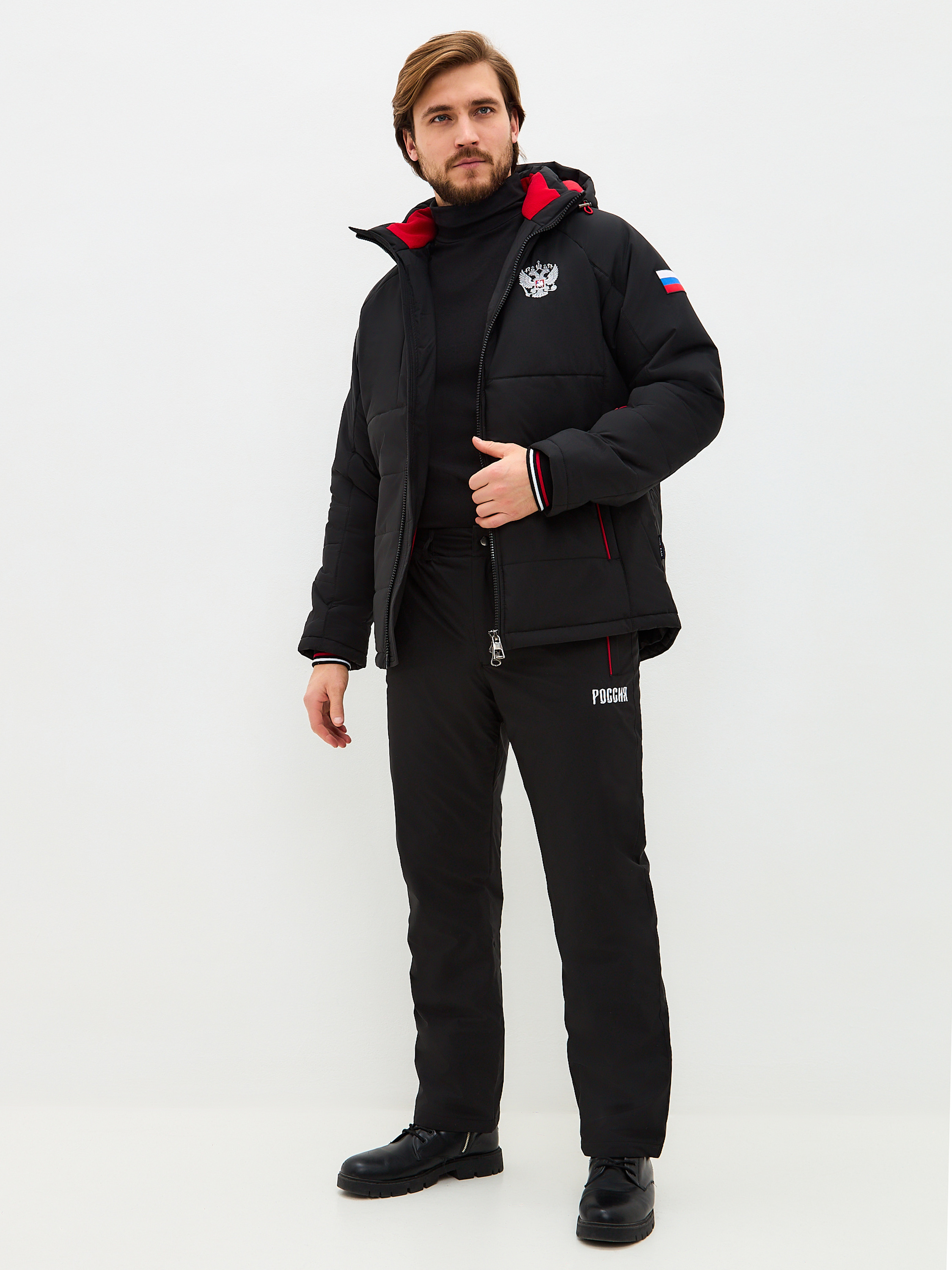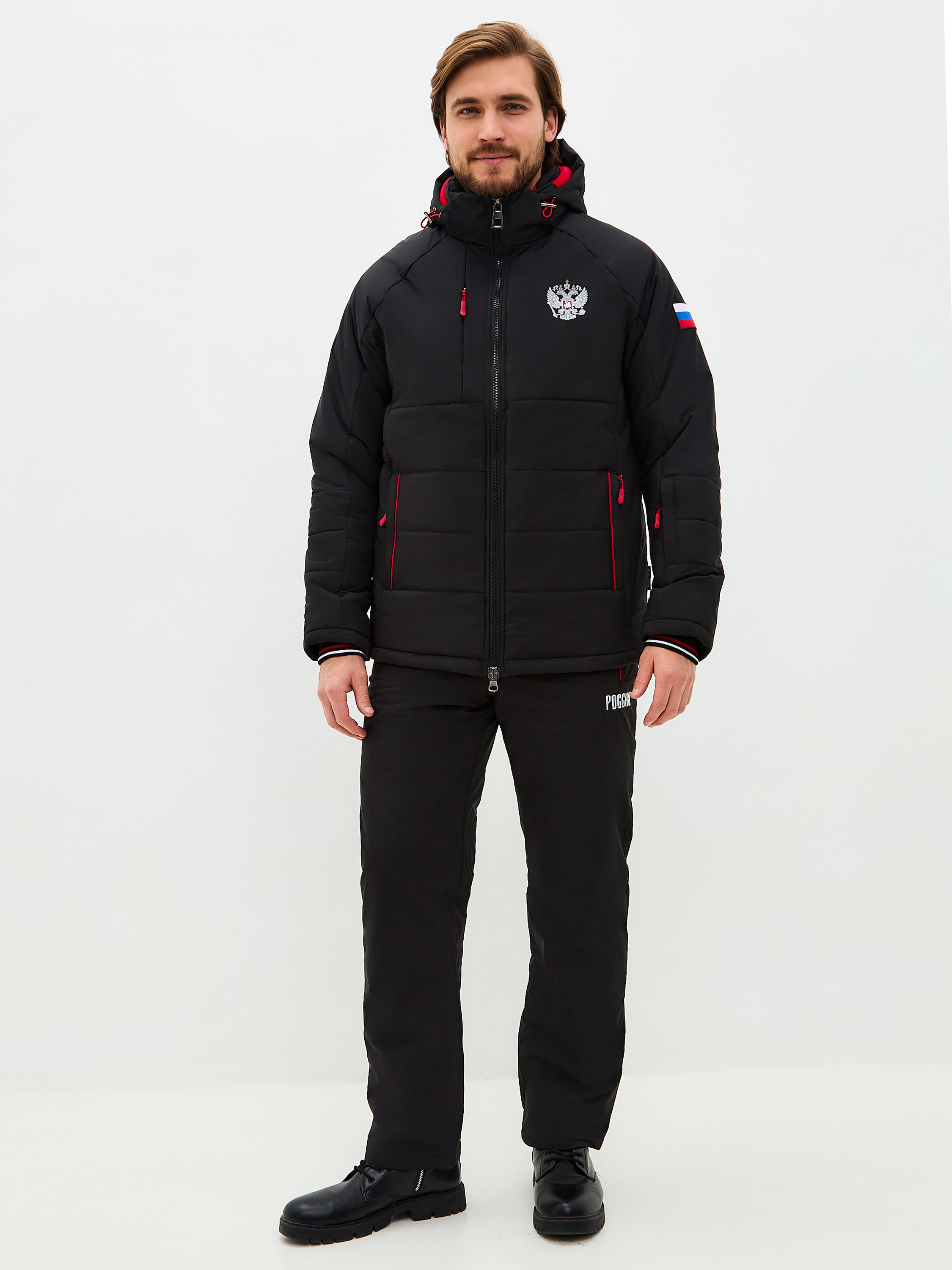 Утепленный спортивный комплект состоит из куртки и брюк изготовлен из водоотталкивающей плащевой ткани с мембранным пленочным покрытием. Куртка на молнии с воротником-стойкой и съемным капюшоном. Утеплитель куртки – высокотехнологичный полиэфирный материал из микроволокна. Дополнительный комфорт и теплоизоляцию создает флисовая подкладка куртки и капюшона. Температурный режим эксплуатации изделия – до -20С. Куртка прямого силуэта, удобные рукава покроя реглан. Боковые карманы - прорезные с молниями, нагрудный карман так же на молнии. Дополнительный карман с молнией на левом рукаве, внутренний карман слева на подкладке так же застегивается на молнию. Лицевая часть капюшона и ширина низа куртки регулируется с помощью пластиковых фиксаторов, трикотажные внутренние манжеты рукавов создают дополнительную защиту от холодного воздуха. На груди куртки слева – вышивка герб России, на спине вышивка-аппликация RUSSIA. На левом рукаве шеврон флаг России. На правом рукаве нашивка с фирменным логотипом. Брюки прямого с верх - 100% ПЭ, подкладка и утеплитель - 100% ПЭ