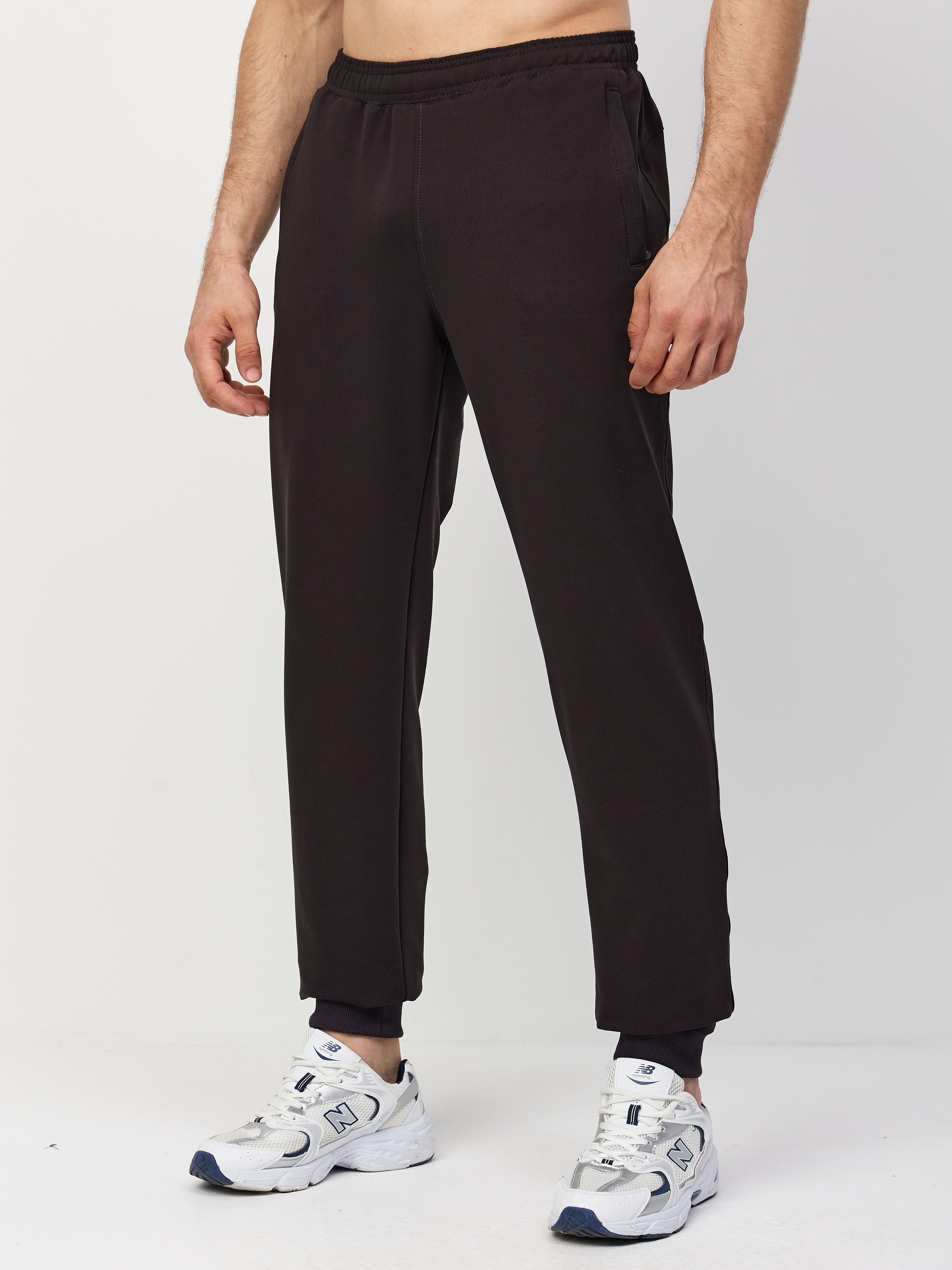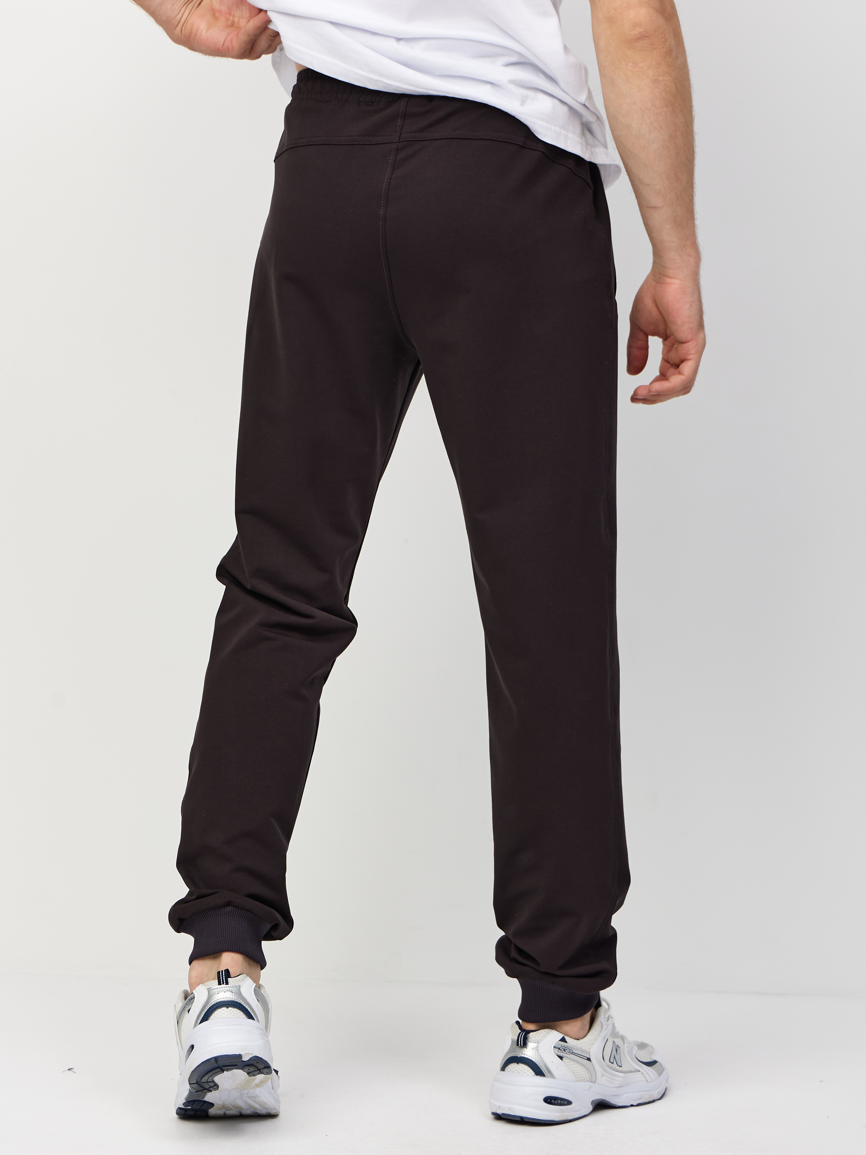 Трикотажные брюки с поясом на резинке. Для дополнительной фиксации в пояс с внутренней стороны вставлен шнурок. Брючины заужены книзу и заканчиваются манжетами. Передние карманы на молниях под листочками, декорированными вышивками в тон основного материала. Сзади кокетка.