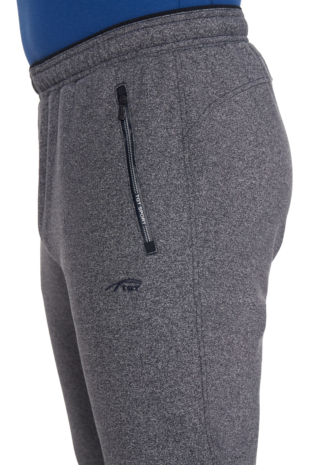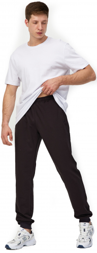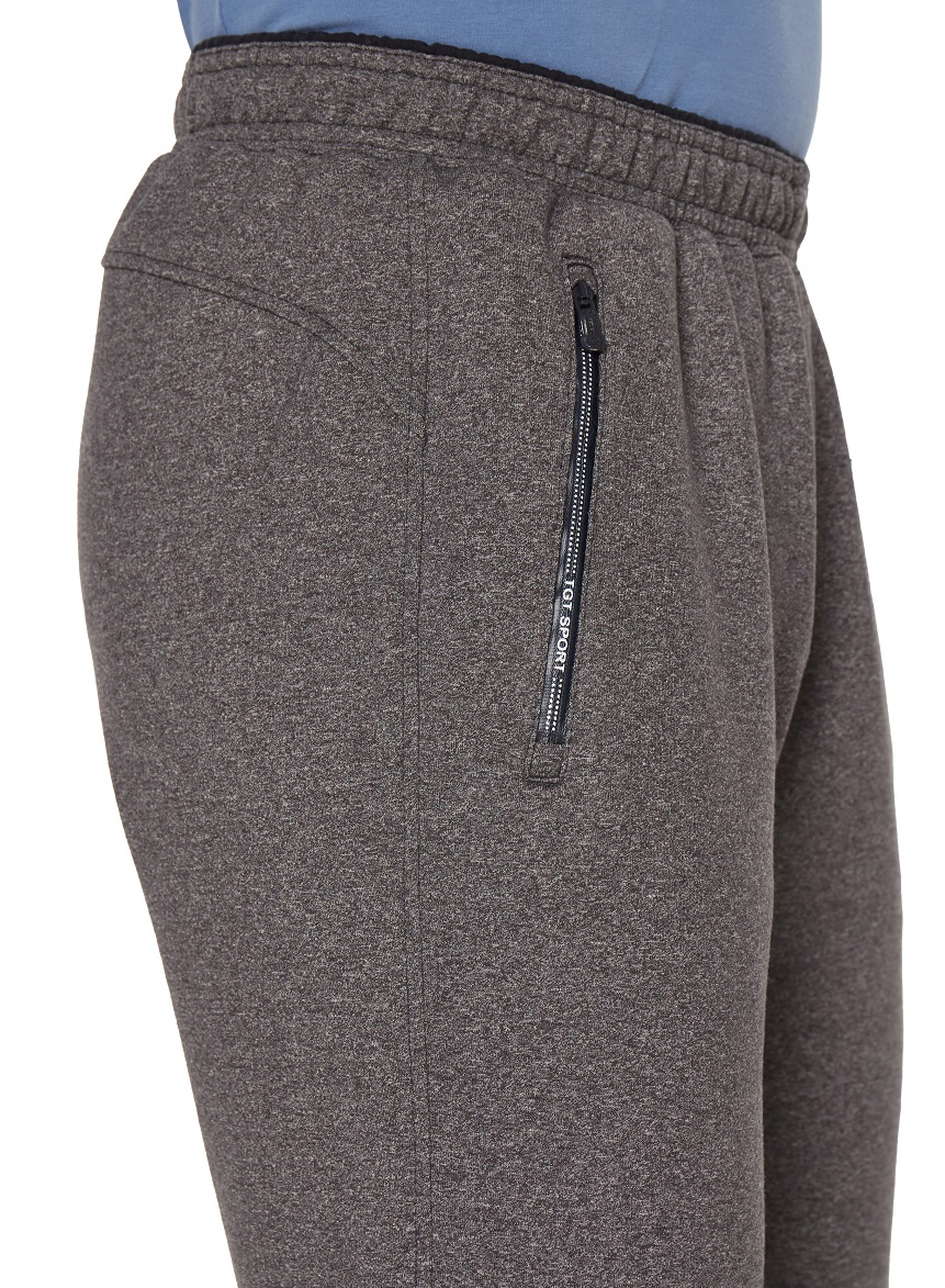 Спортивные брюки из меланжевого трикотажного полотна с 2-х цветным поясом на резинке. Для дополнительной фиксации в пояс с внутренней стороны вставлен шнурок. Брючины заужены книзу и заканчиваются манжетами. Передние карманы фиксируются прорезиненными молниями с принтом и логотипом торговой марки. Сзади кокетка. Под левым карманом вышивка в фирменном стиле, выполненная нитками в тон отделки пояса.