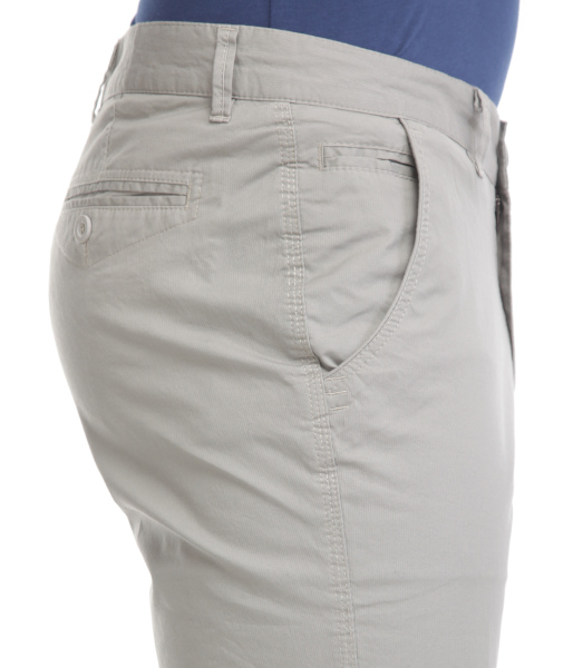 Шорты с жёстким поясом и гульфиком из хлопковой ткани твилового плетения с добавлением спандекса. Лицевая сторона ткани гладкая, изнаночная имеет рельефную структуру в виде мелкого рубчика, который просматривается снаружи в виде узких полос. Лекало молодёжное зауженное. Пояс со шлёвками под ремень. Бока отстрочены тройным швом. Передние карманы полукруглые, отделаны по краю тонким кантом. Справа дополнительный карман – пистон. Задние карманы выполнены в рамочку, отстрочены по контуру, закрываются пуговицами. Изделие прошло влажно-термическую обработку. Два размерных ряда.