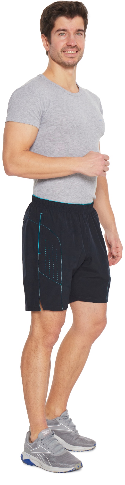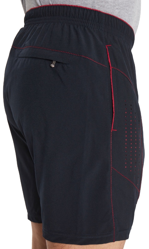 Спортивные шорты с 2-х цветным поясом на резинке и разрезами внизу. Длина – выше колена. Для дополнительной фиксации с внутренней стороны в пояс вставлен шнурок. Отшиты из тонкого гладкого синтетического материала (бистреч). Нити эластана расположены как по утку, так и по основе ткани, что придаёт материалу чрезвычайную подвижность, формоустойчивость и комфорт в носке. По бокам вставки из основного материала с перфорацией и основы из цветной ткани. Таким образом создаётся рисунок в виде регулярных цветных точек. Передние карманы вертикальные открытые, выделены цветными закрепками. Сзади кокетка, ниже которой расположен карман на молнии под листочкой. Боковые вставки, кокетка, передние карманы отстрочены цветными нитками в тон отделки пояса.