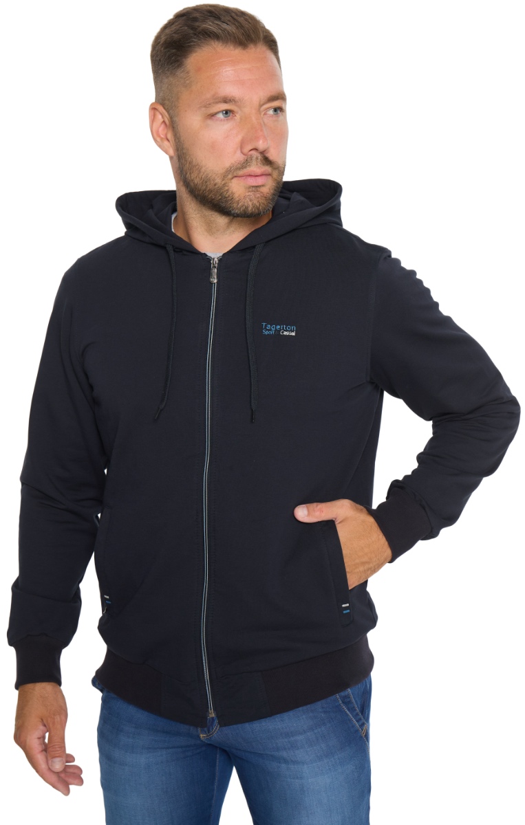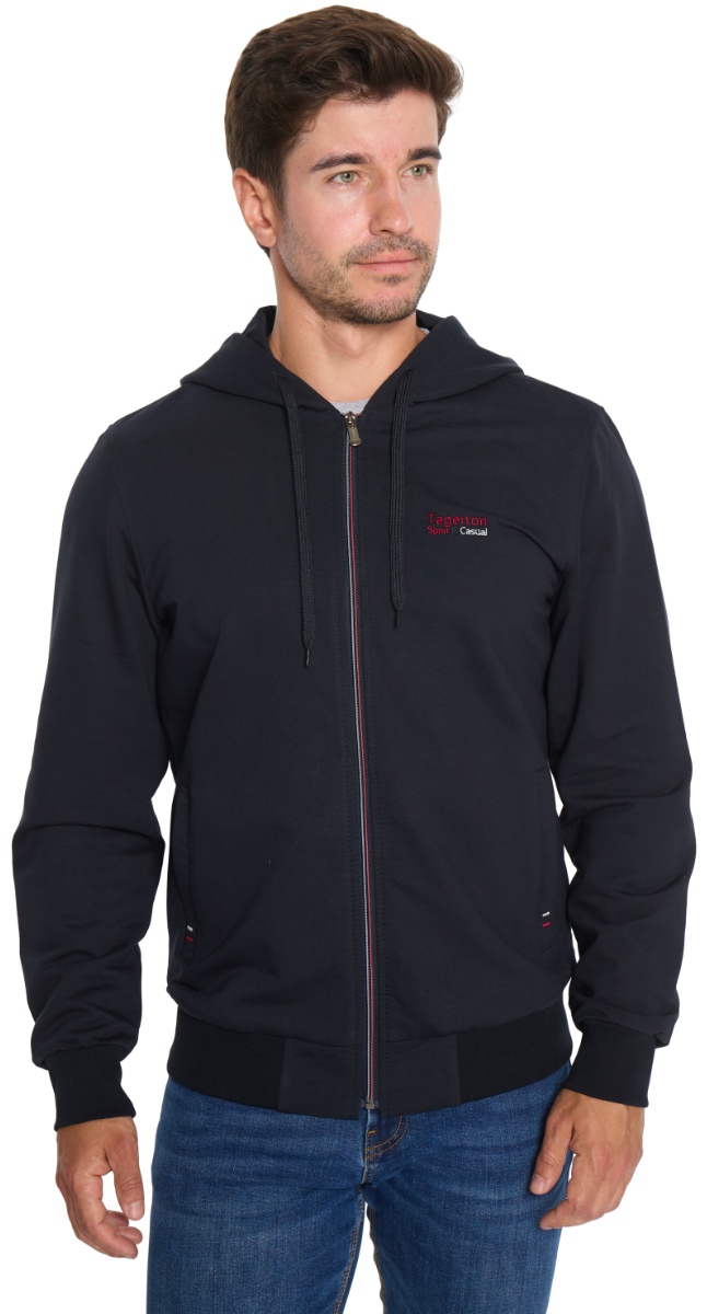 Мужская толстовка на молнии с капюшоном и поясом из кашкорсе. С внутренней стороны капюшон отделан кулиркой в тон основного материала. Ширина регулируется шнурком. Молния в борт декорирована цветными нитками. Передние карманы на молниях под листочками, украшенными закрепками. На левой стороне груди вышивка в фирменном стиле. Изделие удобное и практичное. Может использоваться как элемент спортивной экипировки во время занятий спортом или как трикотажная ветровка из набора повседневной одежды в формате стиля кэжуал. Прекрасно сочетается как с трикотажными спортивными брюками, так и с джинсами.