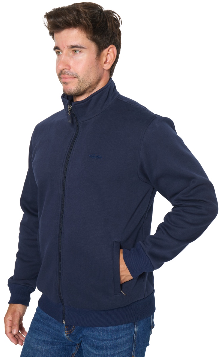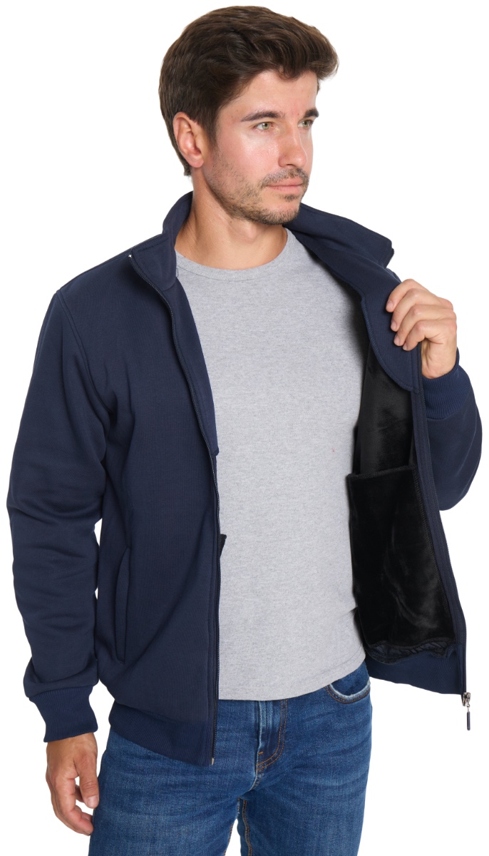 Мужская толстовка на молнии с поясом из кашкорсе и воротником-стойкой, выполненным из основного материала. Основной материал – 3-х ниточный футер, бондированный с внутренней стороны подкладкой из искусственного меха, мягкой, приятной на ощупь. Передние карманы на молниях под листочками. Изделие удобное и практичное. Может использоваться как верхняя одежда в качестве утеплённой ветровки или лёгкой куртки в межсезонье, а также как одежда второго слоя под пальто или тёплую куртку в зимний период. Ворот-стойка надёжно защищает шею от холода. Тёмно-синий цвет толстовки выигрышно смотрится с джинсами.