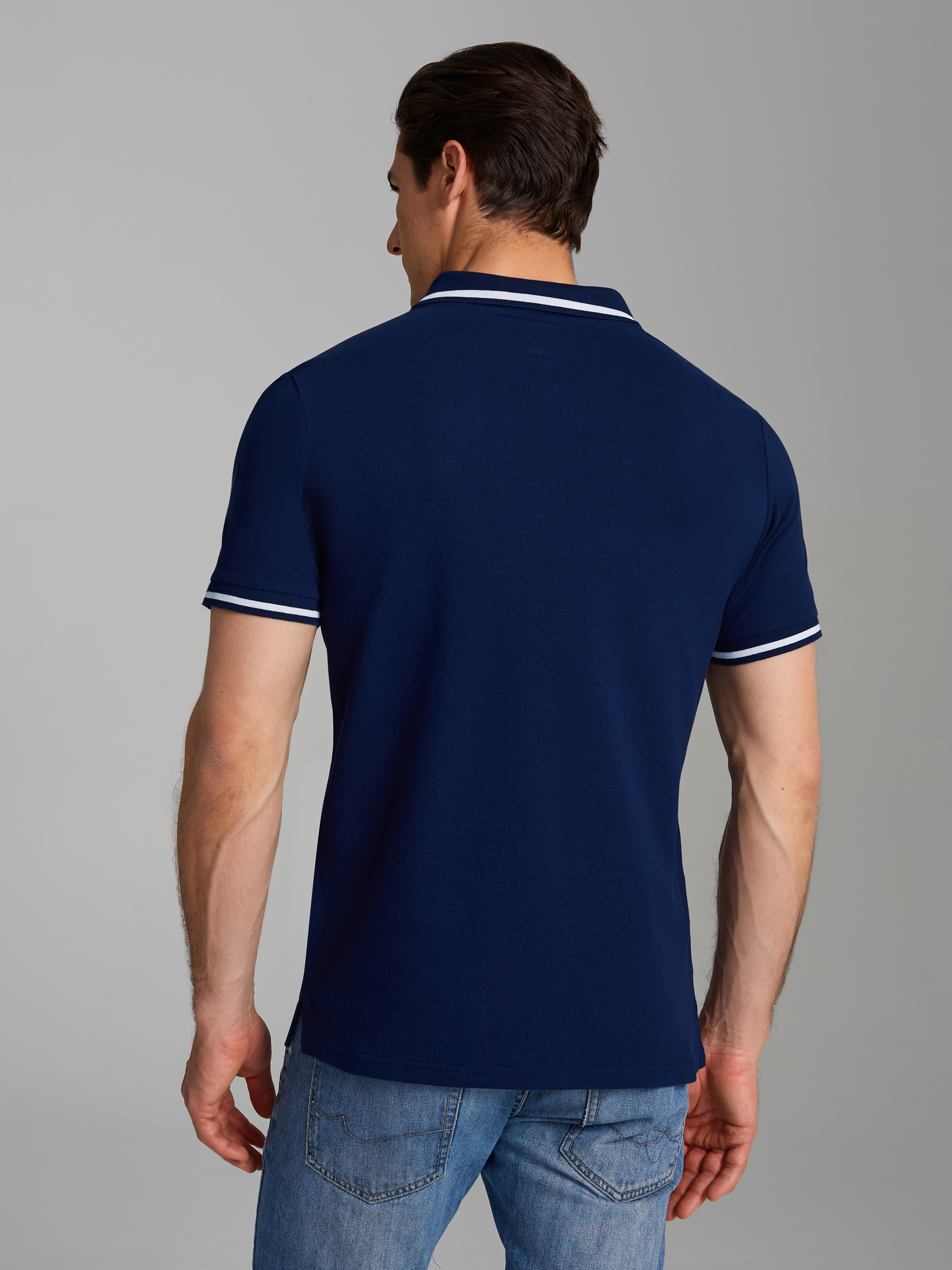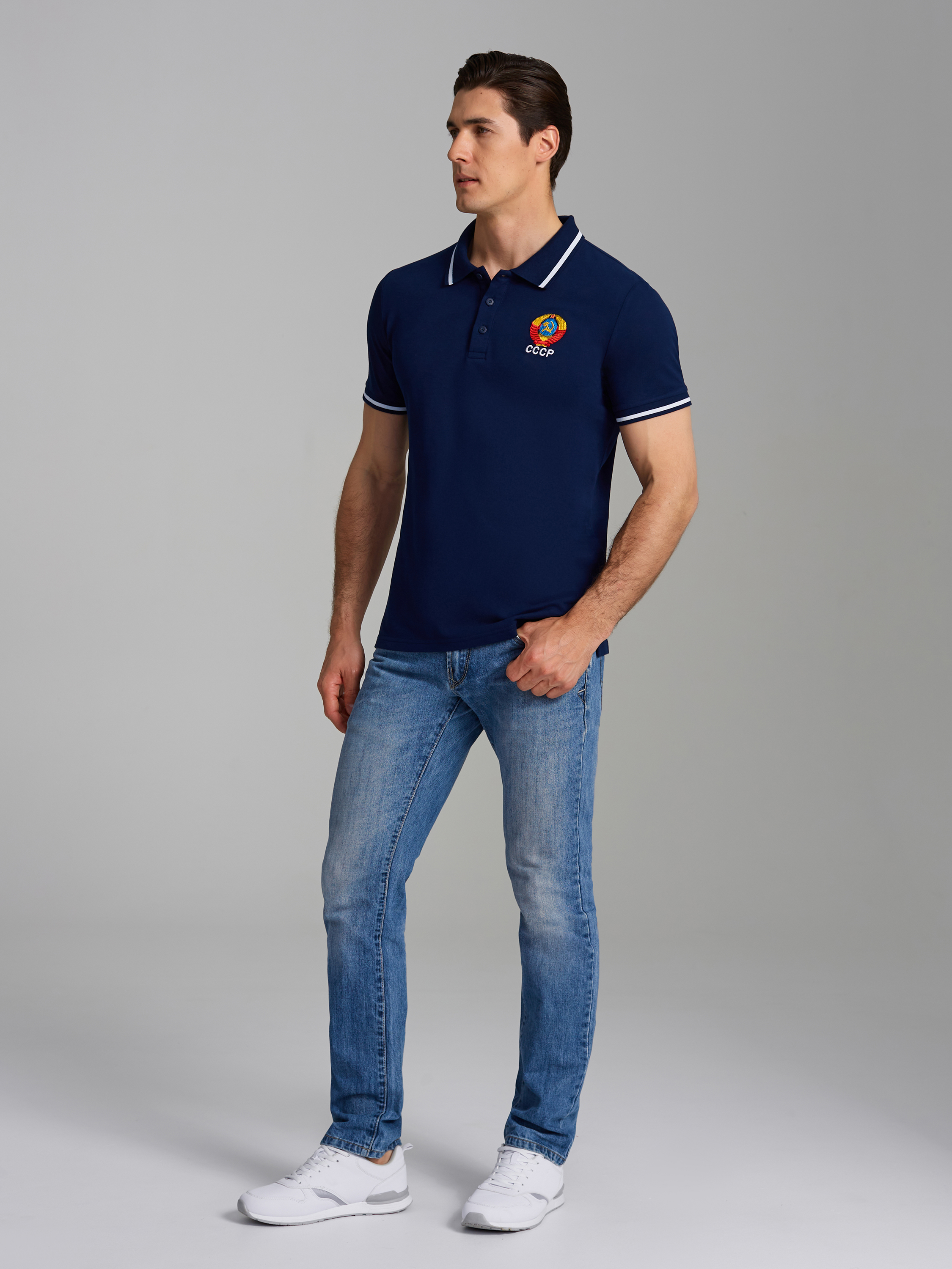 Футболка-поло из хлопкового полотна "пике". Классическая модель поло с короткими рукавами. Воротник и манжеты рукава выполнены из трикотажной рибаны темно-синего цвета с белой полосой. На полочке застежка-планка на пуговицах. На груди вышивка "СССР". По низу футболки в боковых швах выполнены разрезы, обработанные тесьмой. 100% хлопок