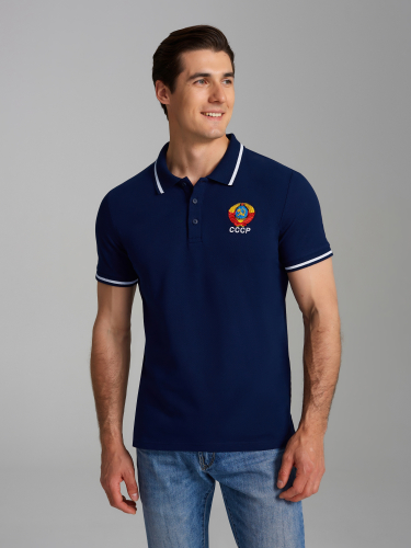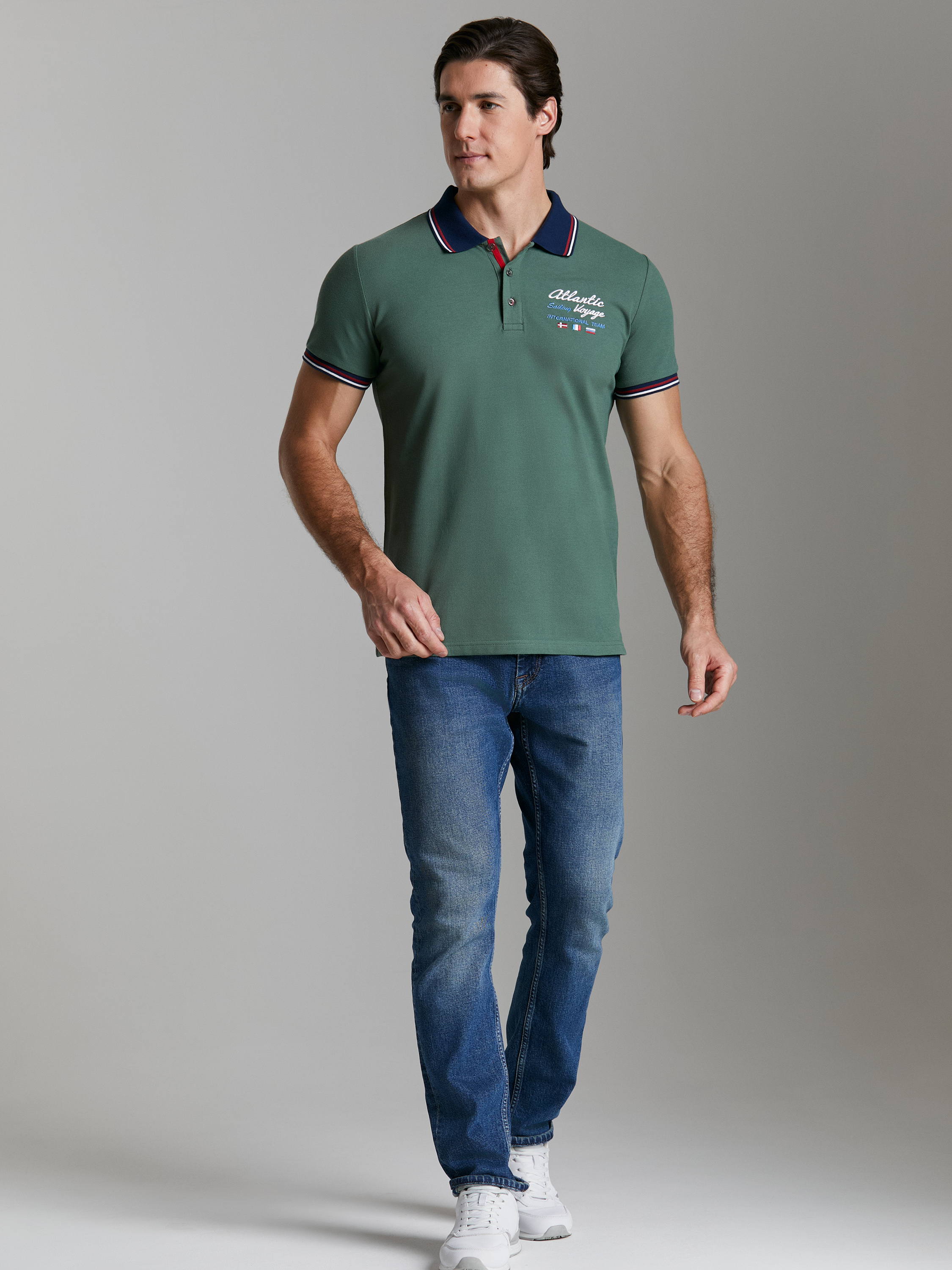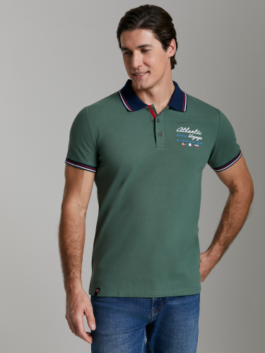 Футболка-поло из хлопкового полотна "пике". Классическая модель поло с короткими рукавами. Воротник и манжеты рукава выполнены из трикотажной рибаны темно-синего цвета с красно-белой полосой. На полочке застежка-планка на пуговицах. На нижней планке и по горловине настрочена контрастная киперная тесьма. На полочке вышивка "Atlantic Sailing Voyage" и флаги. По низу футболки в боковых швах выполнены разрезы, обработанные тесьмой. С правой стороны полочки, по низу настрочен жаккардовый "флажок" с логотипом. 100% хлопок