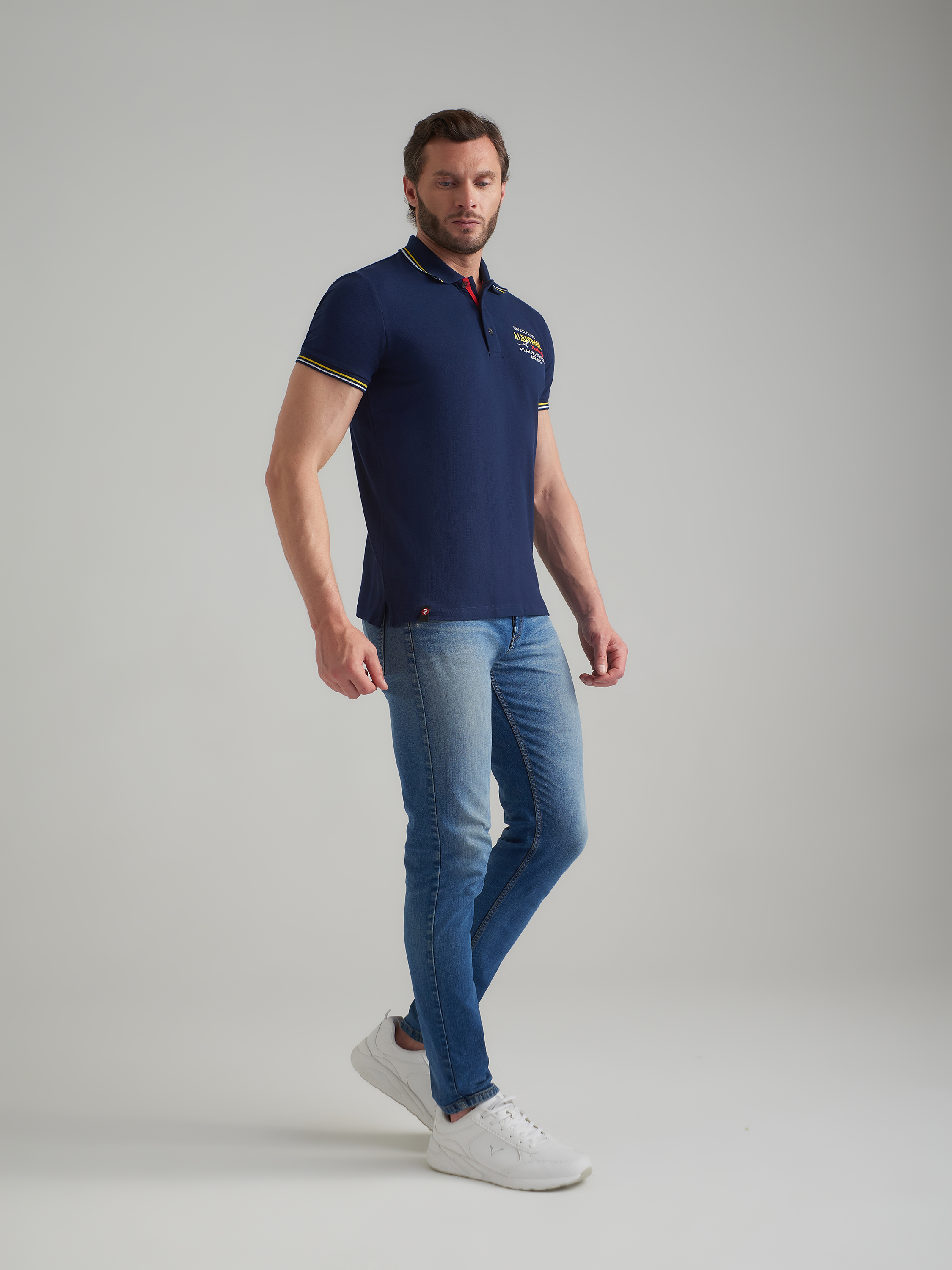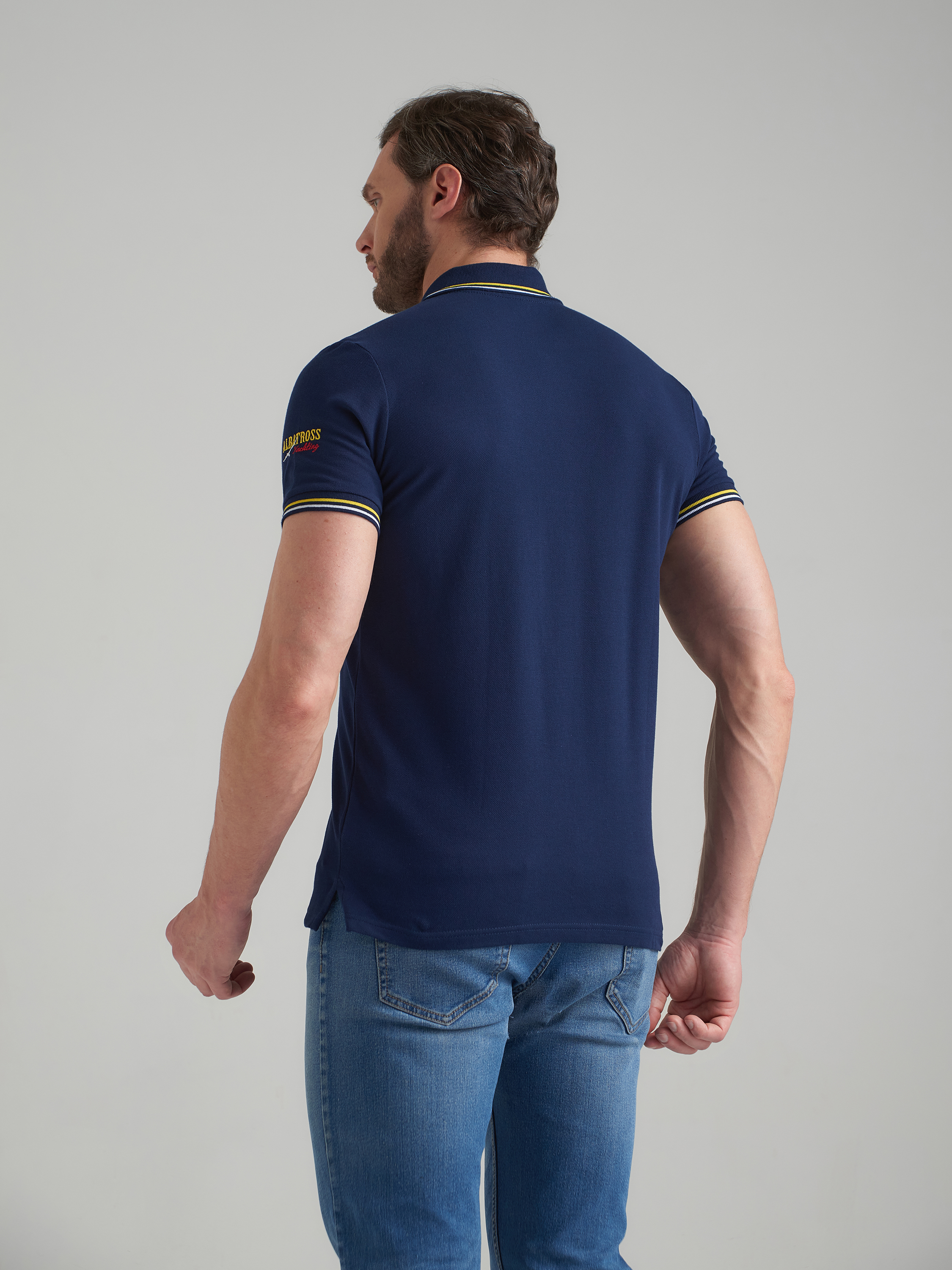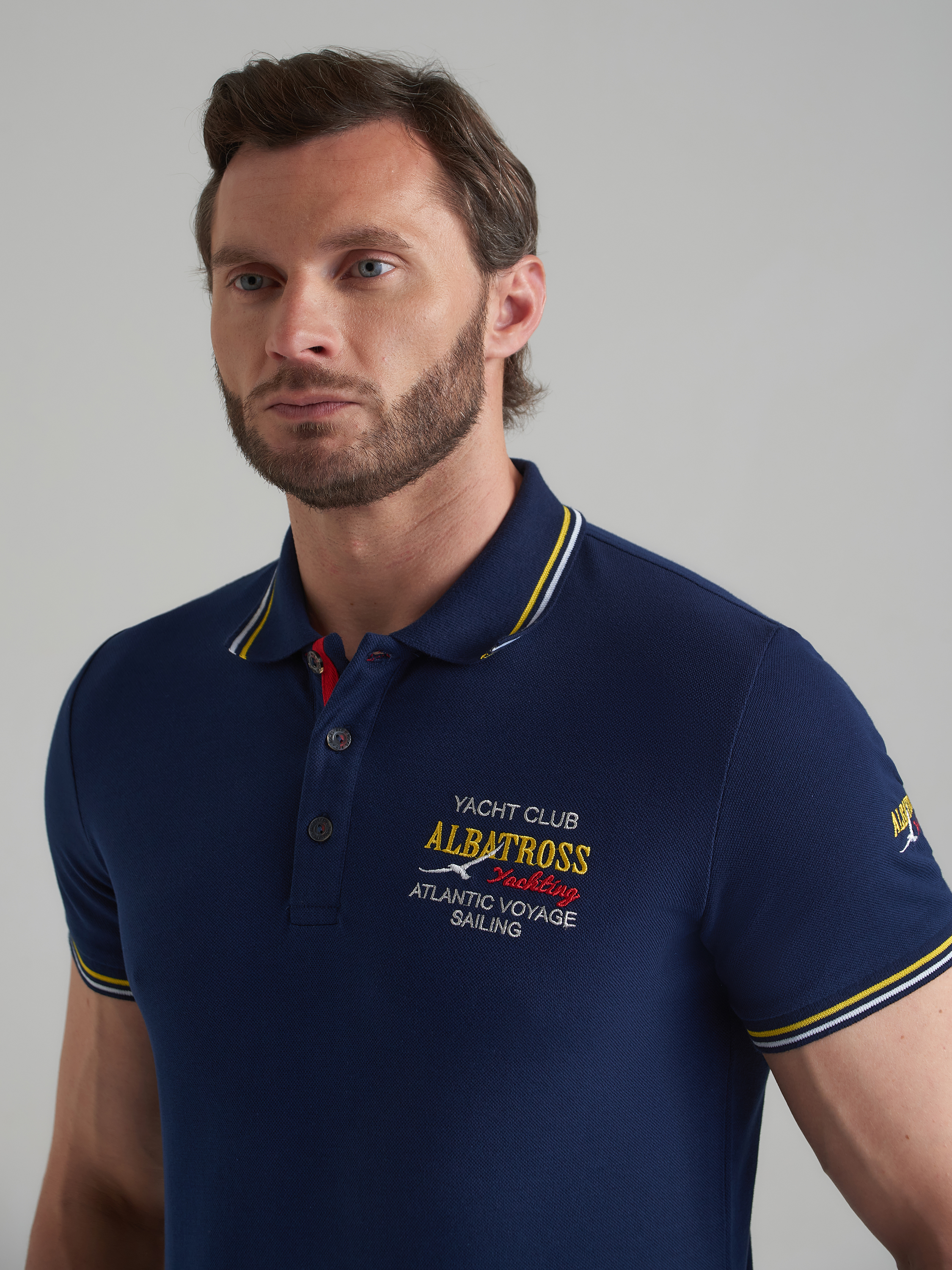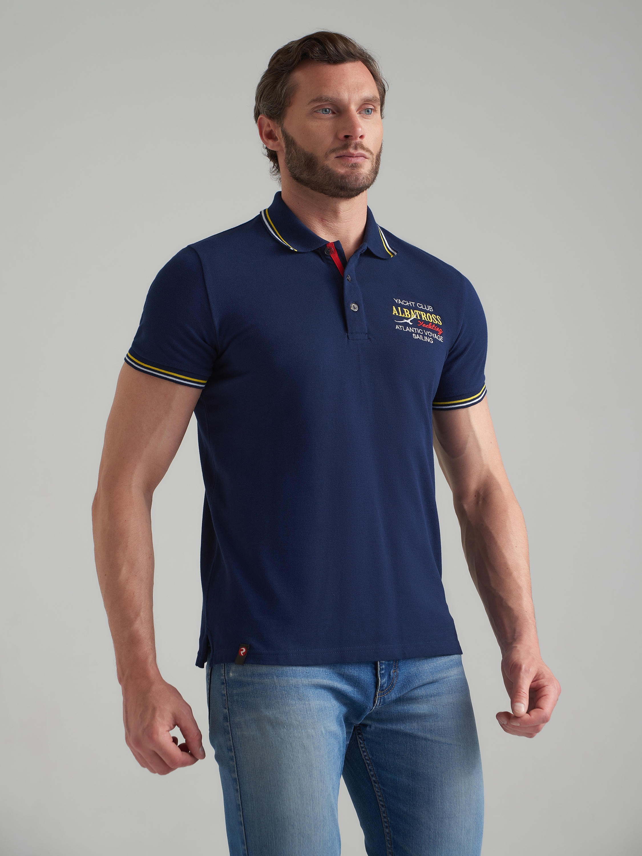 Футболка-поло из хлопкового полотна "пике". Классическая модель поло с короткими рукавами. Воротник и манжеты рукава выполнены из трикотажной рибаны темно-синего цвета с бело-желтой полосой. На полочке застежка-планка на пуговицах. На нижней планке и по горловине настрочена контрастная киперная тесьма. На полочке вышивка "YACHT CLUB ALBATROSН Yahting ATLANTIC VOYAGE SAILING". На левом рукаве вышивка "ALBATROS","Yahting". По низу футболки в боковых швах выполнены разрезы, обработанные киперной тесьмой. С правой стороны полочки, по низу настрочен жаккардовый "флажок" с логотипом. 100% хлопок