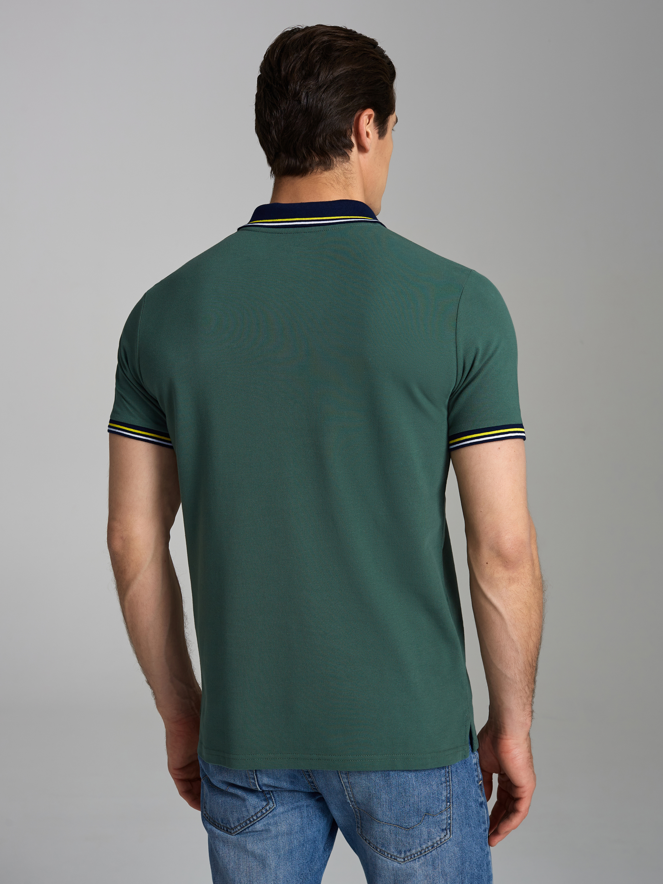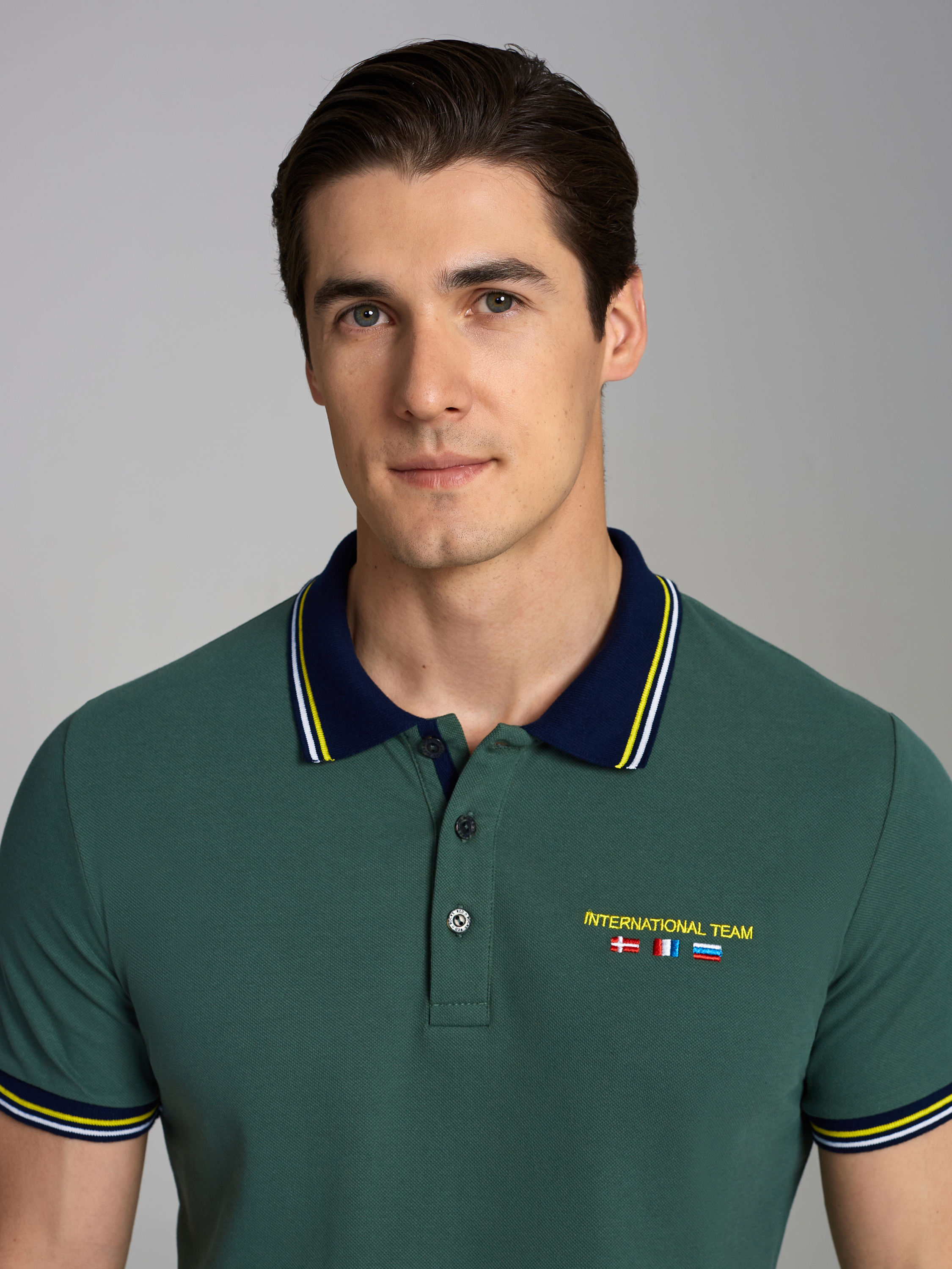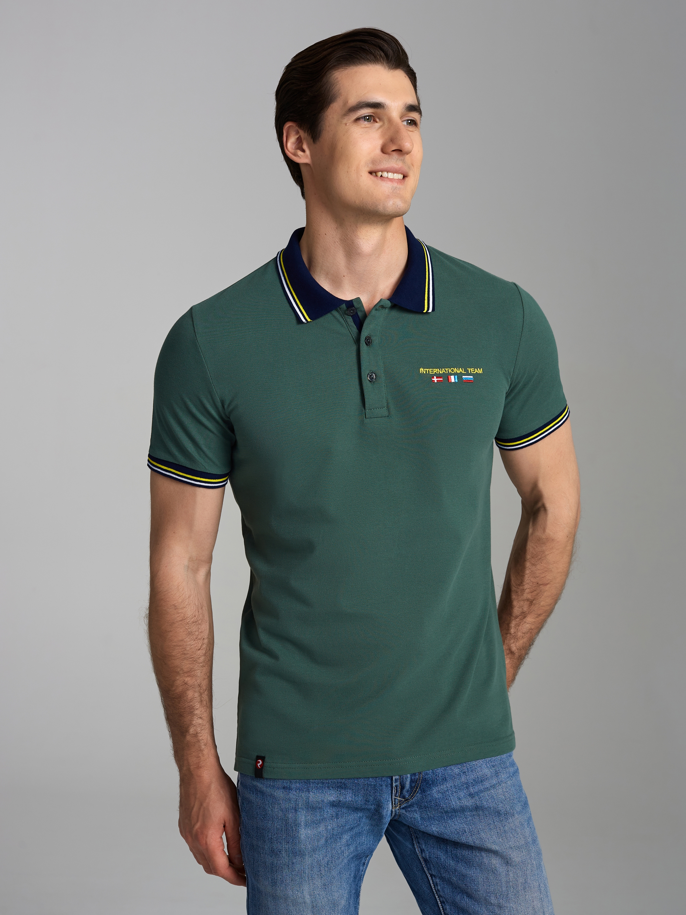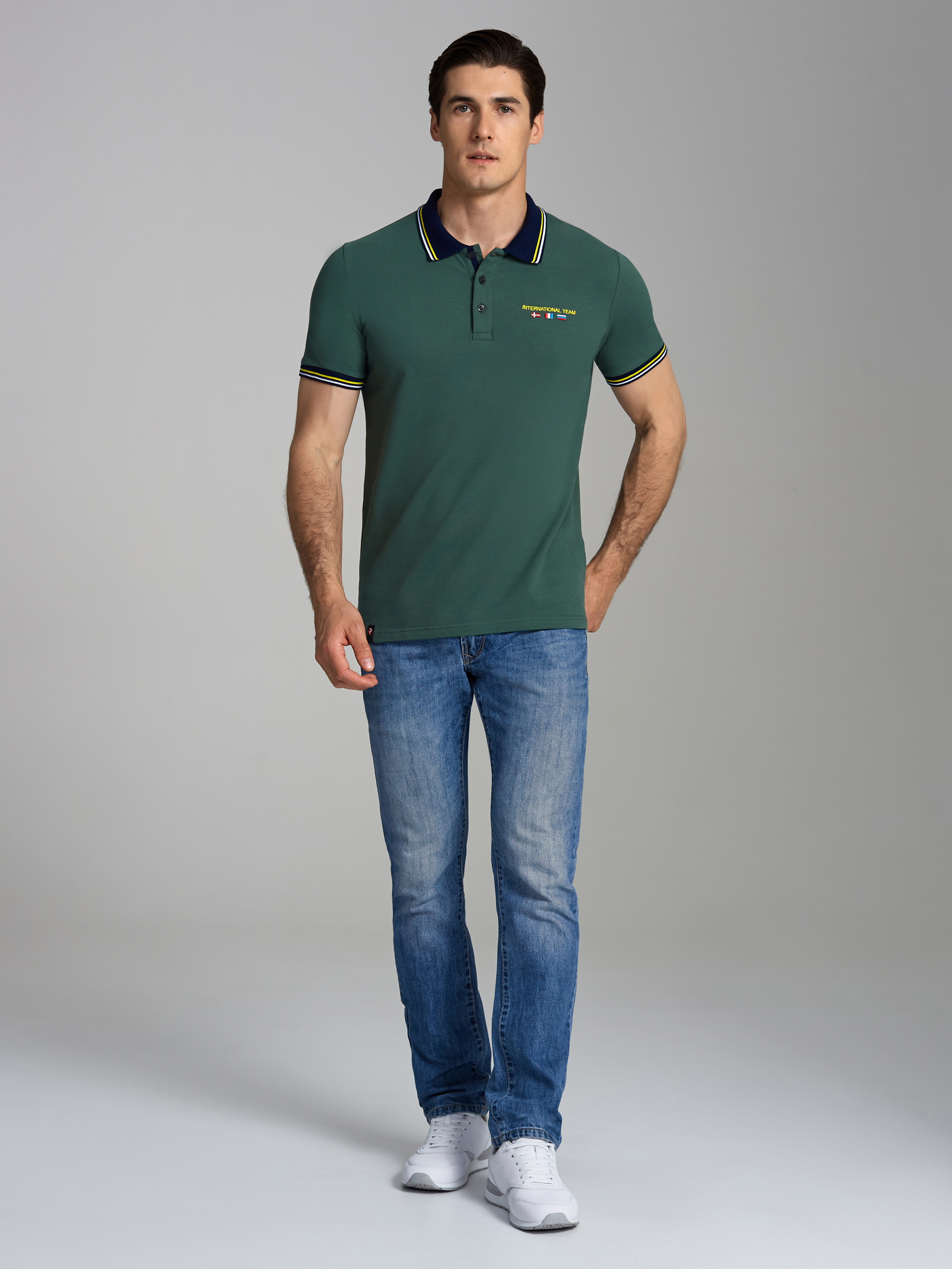 Футболка-поло из хлопкового полотна "пике". Классическая модель поло с короткими рукавами. Воротник и манжеты рукава выполнены из трикотажной рибаны темно-синего цвета с бело-желтой полосой. На полочке застежка-планка на пуговицах. На нижней планке и по горловине настрочена контрастная киперная тесьма. На полочке выполнена вышивка "INTERNATIONAL TEAM" и вышивка флагов. По низу футболки в боковых швах выполнены разрезы, обработанные тесьмой. С правой стороны полочки, по низу настрочен жаккардовый "флажок" с логотипом. 100% хлопок